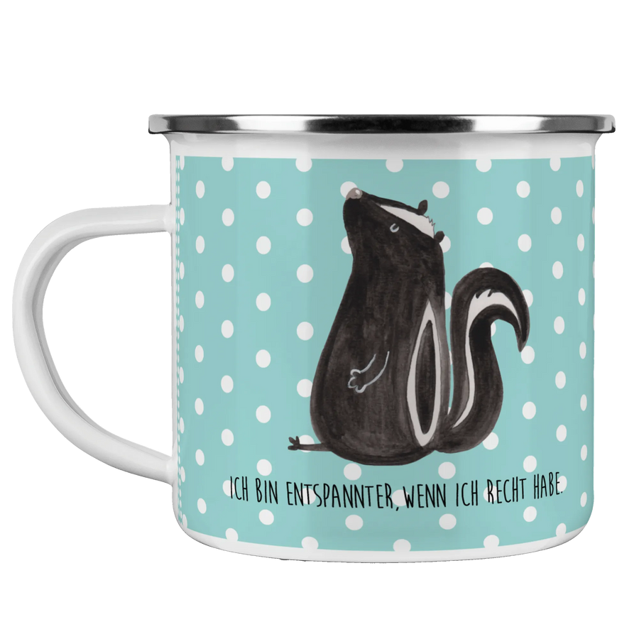 Die Camping Emaille Tasse mit dem niedlichen Stinktier-Motiv ist das perfekte Geschenkt für Naturfreunde und Abenteuerlustige! Ob beim Camping, auf Wanderungen oder einfach nur beim Entspannen im Garten – diese robuste und charmante Tasse wird dich stets begleiten. Mit einem spritzigen Design, das ein fröhliches, sitzendes Stinktier zeigt, bringt diese Tasse ein Lächeln in jede Kaffeepause. Der Spruch "Ich bin entspannter, wenn ich Recht habe." macht sie zusätzlich zu einem lustigen Begleiter im Büro oder bei einer gemütlichen Runde am Lagerfeuer.