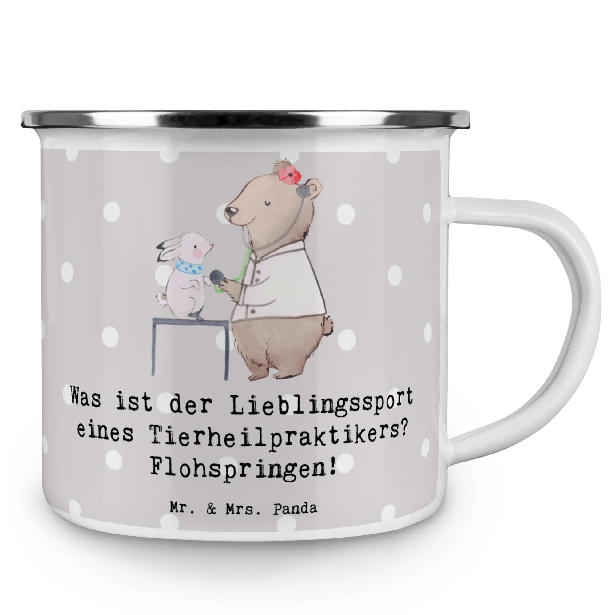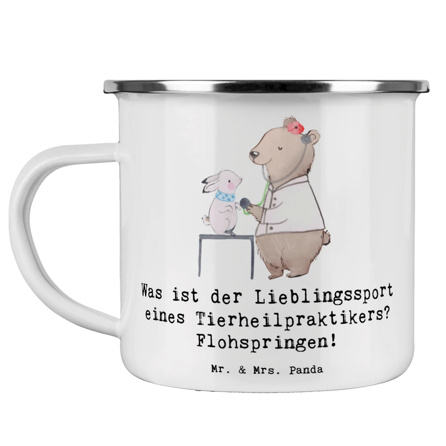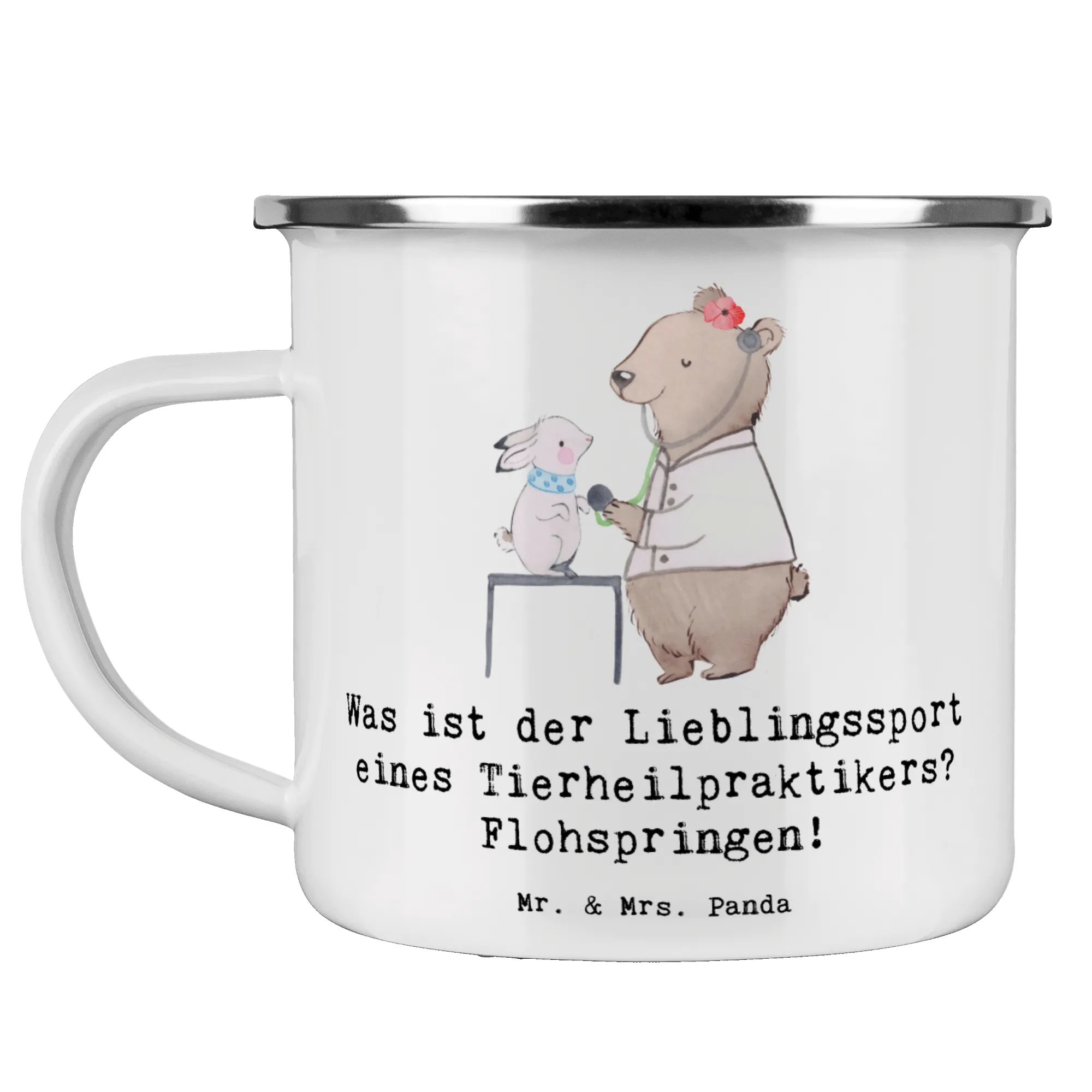 Die Camping Emaille Tasse mit dem witzigen Motiv "Tierheilpraktiker" von Mr. & Mrs. Panda ist das perfekte Geschenk für alle Tierliebhaber und Berufstätige in der Tiermedizin. Mit einem charmanten Slogan, "Was ist der Lieblingssport eines Tierheilpraktikers? Flohspringen!", bringt diese Tasse nicht nur Freude, sondern ist auch ein echtes Statement für die Leidenschaft zu Tieren und ihrem Wohlergehen.