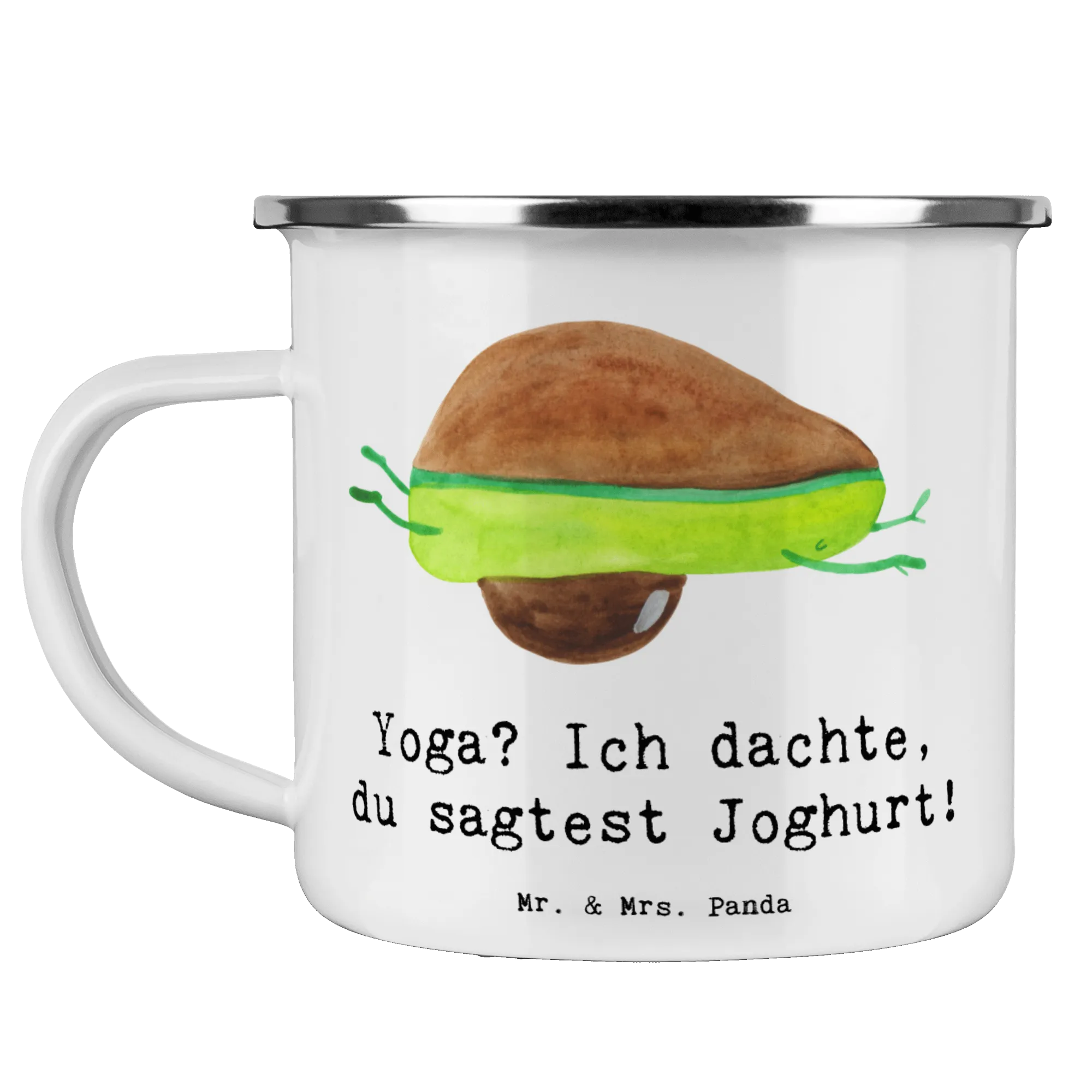 Entdecke die bezaubernde Camping Emaille Tasse mit dem witzigen Motiv "Yoga? Ich dachte, du sagtest Joghurt!" von Mr. & Mrs. Panda! Diese Tasse ist der perfekte Begleiter für alle Yogis und Sportbegeisterten, die auch beim Campen oder in der Natur nicht auf ihren Lieblingsbecher verzichten möchten.