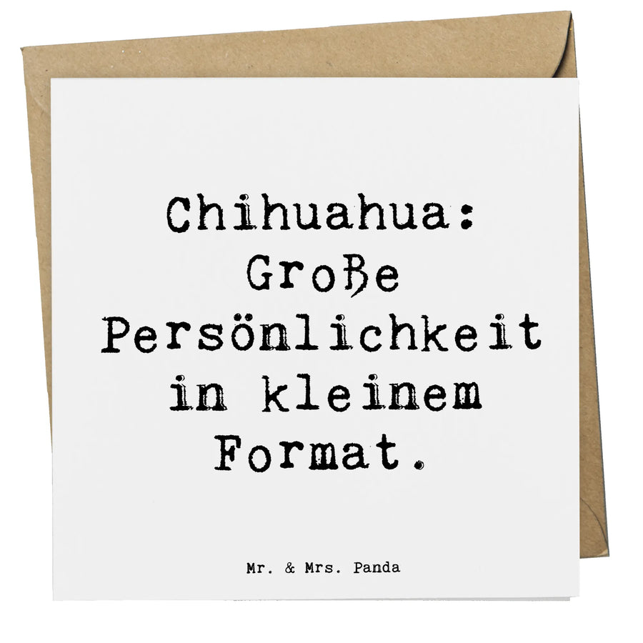 Die Deluxe Karte Chihuahua aus der Hunderassen-Kollektion von Mr. & Mrs. Panda ist ein zauberhaftes Geschenk für alle Hundefans! Mit dem Spruch "Chihuahua: Große Persönlichkeit in kleinem Format" zieht dieser kleine Charmeur alle Blicke auf sich. Die wunderschöne Klappkarte misst 140 mm x 140 mm und ist aus hochwertigem 300 Gramm Karton gefertigt, der besonders edel wirkt.