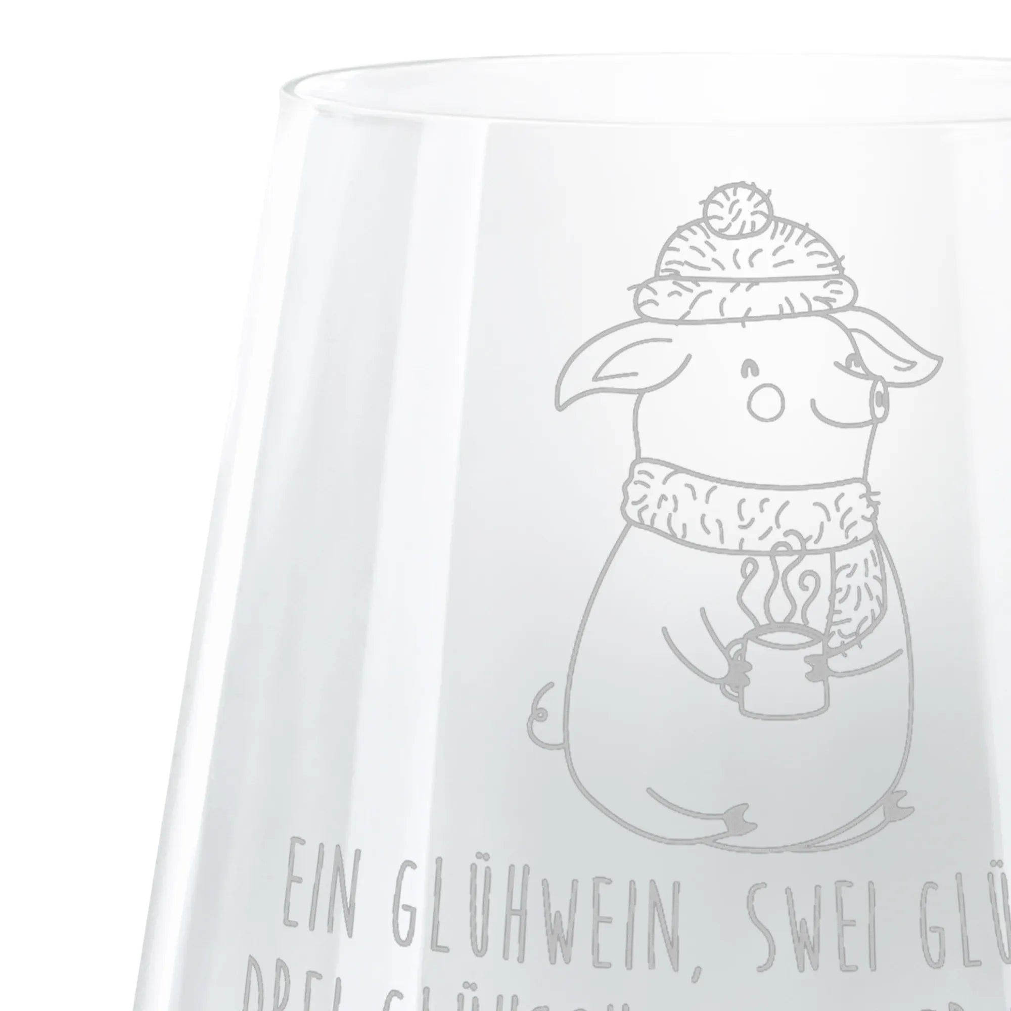 Das Glas zeigt ein fröhliches, anthropomorphes Schwein, das winterlich gekleidet ist, mit einer blauen Mütze und einem Schal. Es hält eine dampfende Tasse, die an die gemütlichen Abende auf dem Weihnachtsmarkt erinnert. Die hochwertige Lasergravur sorgt dafür, dass der bezaubernde Spruch "Ein Glühwein, Swei Glühwein…" deutlich und haltbar an das Glas gebannt ist. Aber auch ohne Text, das Lallelndes Glühschwein-Motiv bringt definitiv sommerliche Stimmung in die winterlichen Abende.
