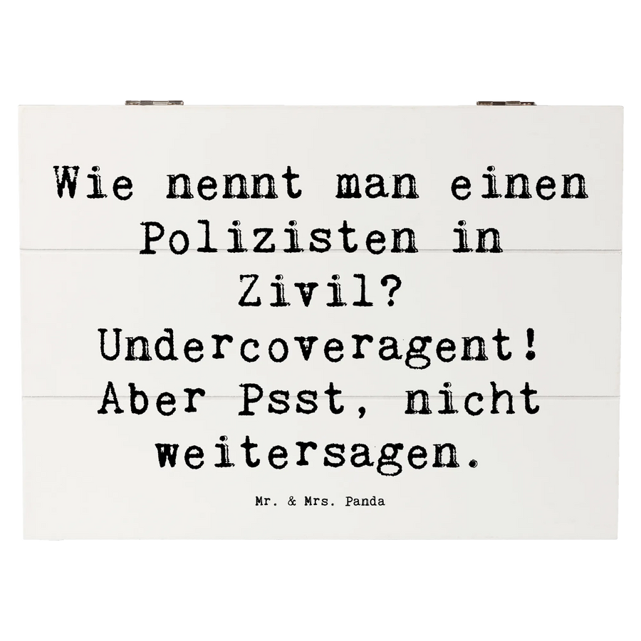 Der witzige Spruch 'Wie nennt man einen Polizisten in Zivil? Undercoveragent! Aber Psst, nicht weitersagen.' sorgt dafür, dass diese Kiste ein ganz persönliches Geschenk ist. Sie eignet sich auch hervorragend als nachhaltige Geschenkbox, die du immer wieder verwenden kannst.