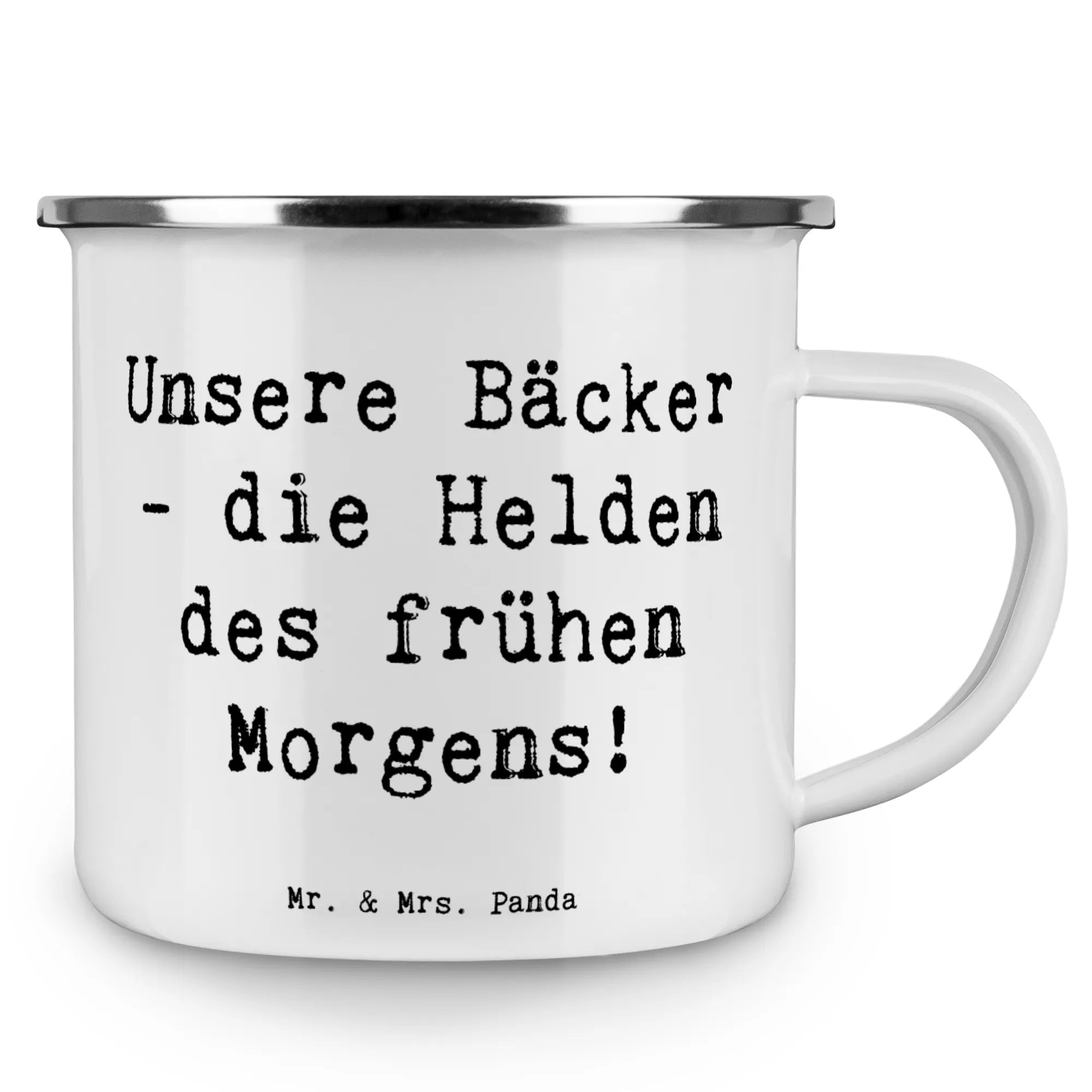 Entdecke die charmante Camping Emaille Tasse von Mr. & Mrs. Panda mit dem süßen Motiv "Unsere Bäcker - die Helden des frühen Morgens!" Diese Tasse ist nicht nur ein praktisches Utensil für deinen nächsten Campingausflug oder die wandernde Entdeckungsreise, sie ist auch eine herzliche Art, Danke zu sagen.