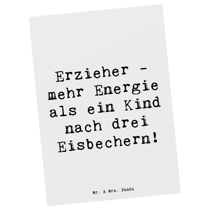 Wenn du auf der Suche nach dem perfekten Geschenk für einen Erzieher bist, dann haben wir bei Mr. & Mrs. Panda genau das Richtige für dich! Unsere Postkarte aus der Kollektion „Berufe“ zeigt liebevoll das Motiv ‚Erzieher - mehr Energie als ein Kind nach drei Eisbechern!‘. Diese einzigartige Postkarte ist ein wunderbares Zeichen der Wertschätzung für die, die Tag für Tag mit Leidenschaft und Energie für unsere Kinder da sind.