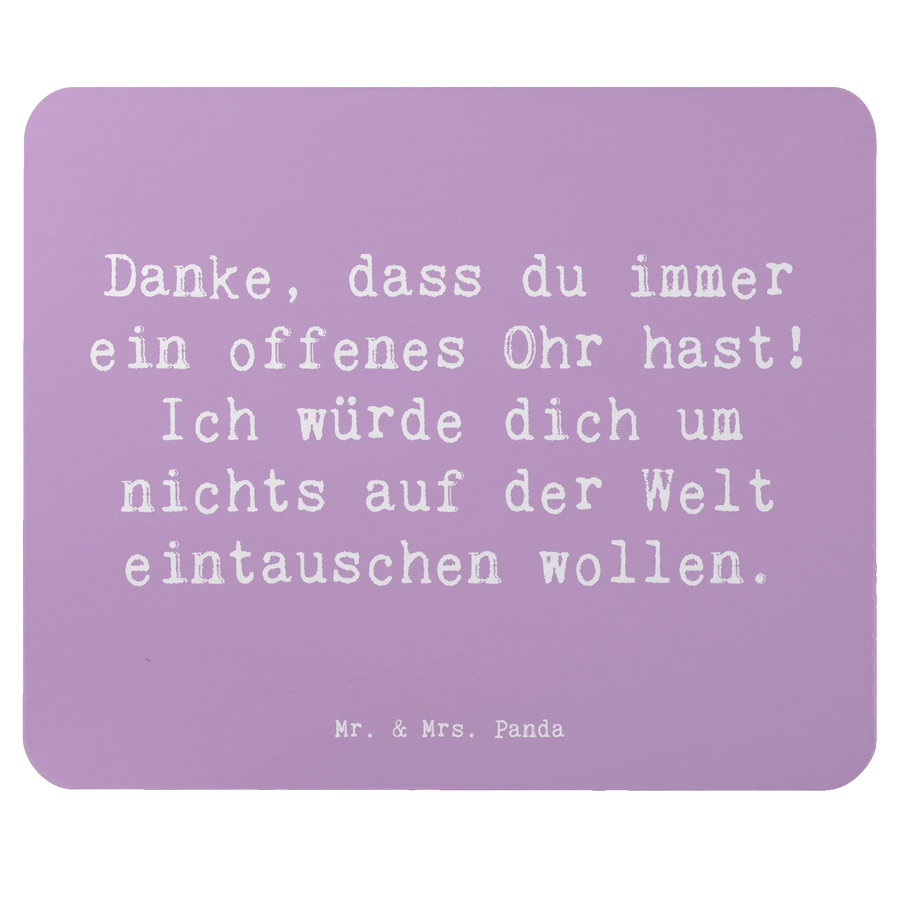 Das Mauspad ist mit dem Slogan "Danke, dass du immer ein offenes Ohr hast! Ich würde dich um nichts auf der Welt eintauschen wollen." bedruckt, was es zu einem ganz besonderen Gegenstand macht, der deine Wertschätzung perfekt ausdrückt. Die hochwertige Arbeitsweise von Mr. & Mrs. Panda zeigt sich in jedem Detail: Das Mauspad ist aus hochwertigem Zellkautschuk gefertigt, das in Deutschland hergestellt wird. Es bietet nicht nur eine angenehme Oberfläche für deine Maus, sondern ist auch ergonomisch gestaltet, um dein Handgelenk zu schonen.