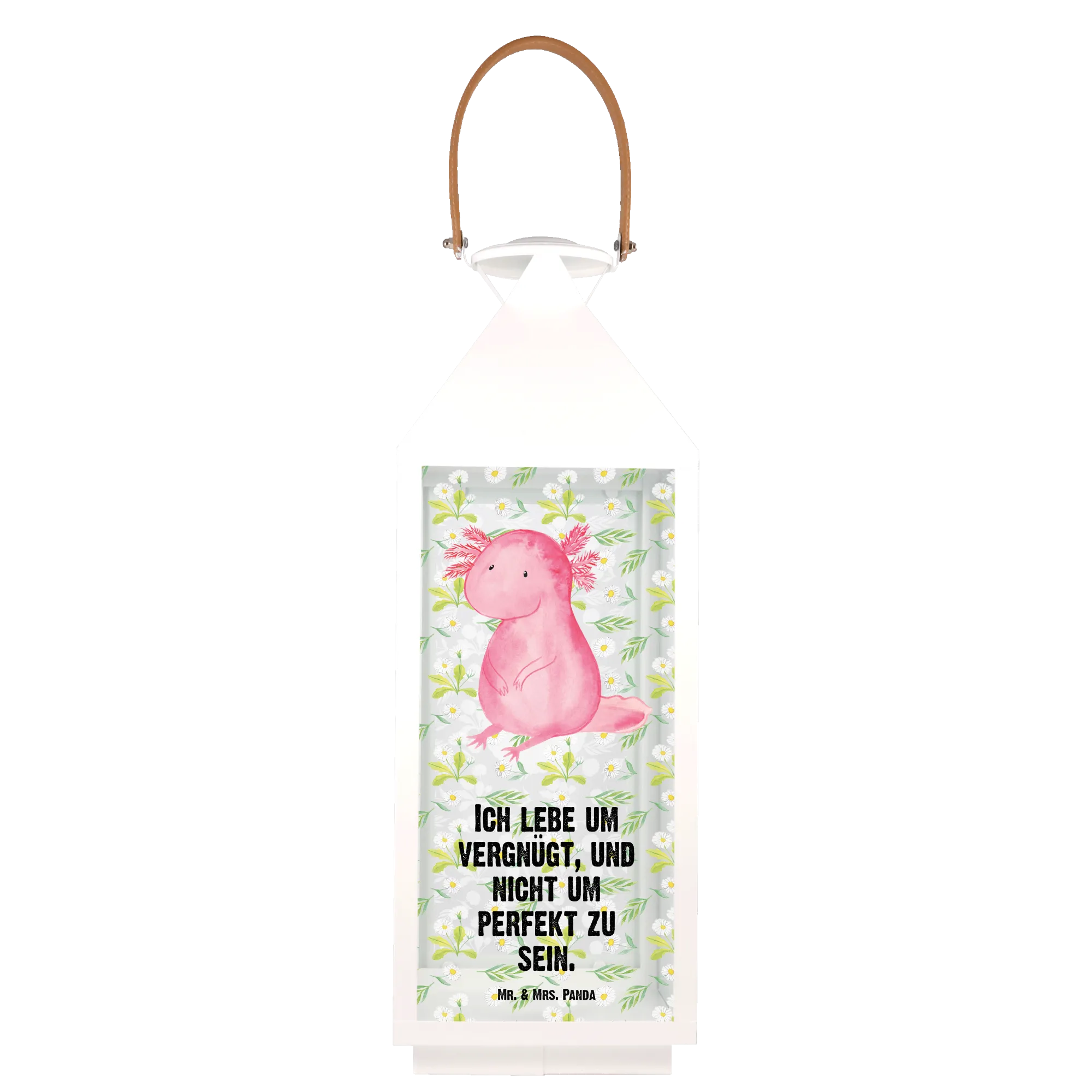 Mit ihren Ausmaßen von 550 mm Höhe, 190 mm Breite und 200 mm Tiefe ist sie sowohl als XXL Laterne als auch als elegante Gartendekoration geeignet. Der liebevoll gestaltete Axolotl, ein Tier, das für Vergnügen und Glück steht, schmückt die Laterne und erinnert uns daran, dass das Leben mehr ist als Perfektion – "Ich lebe um vergnügt, und nicht um perfekt zu sein." Diese Laterne mit einem einzigartigen Motiv sorgt für eine gemütliche Atmosphäre sowohl im Innen- als auch im Außenbereich.