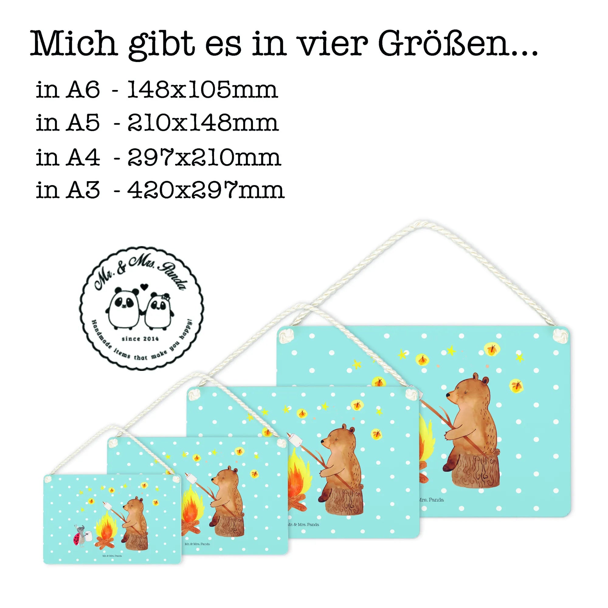 Das Bär & Marienkäfer Lagerfeuer Deko Schild von Mr. & Mrs. Panda ist das perfekte Geschenk für all diejenigen, die die Natur und gemütliche Momente lieben. Mit einem liebevoll gestalteten Motiv zeigt es einen fröhlichen Bären, der an einem Lagerfeuer sitzt und ein Marshmallow auf einem Stock röstet, während ein Marienkäfer neugierig zuschaut.