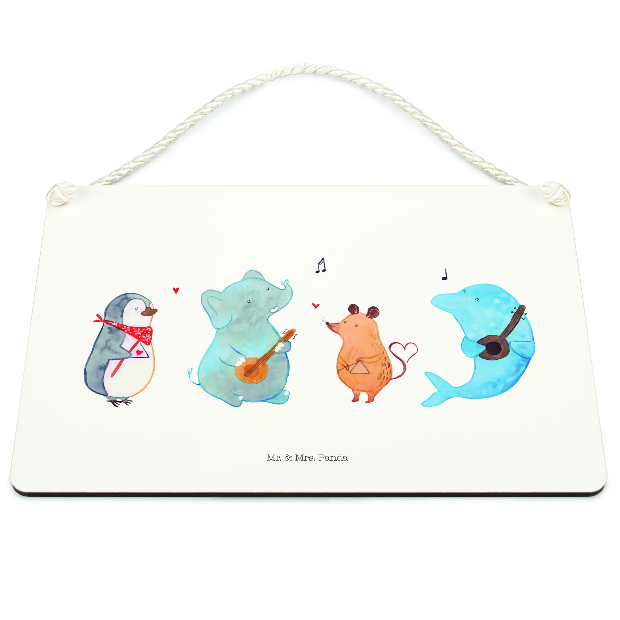 Mit dem liebevoll gestalteten Deko Schild „Big Band“ aus der Small World Kollektion von Mr. & Mrs. Panda holst du dir eine fröhliche Musiktruppe an die Wand. Ein Pinguin, eine Maus, ein Delfin und ein Elefant musizieren gemeinsam und sorgen für gute Laune – perfekt als Türschild, Holzschild oder Wandschild.