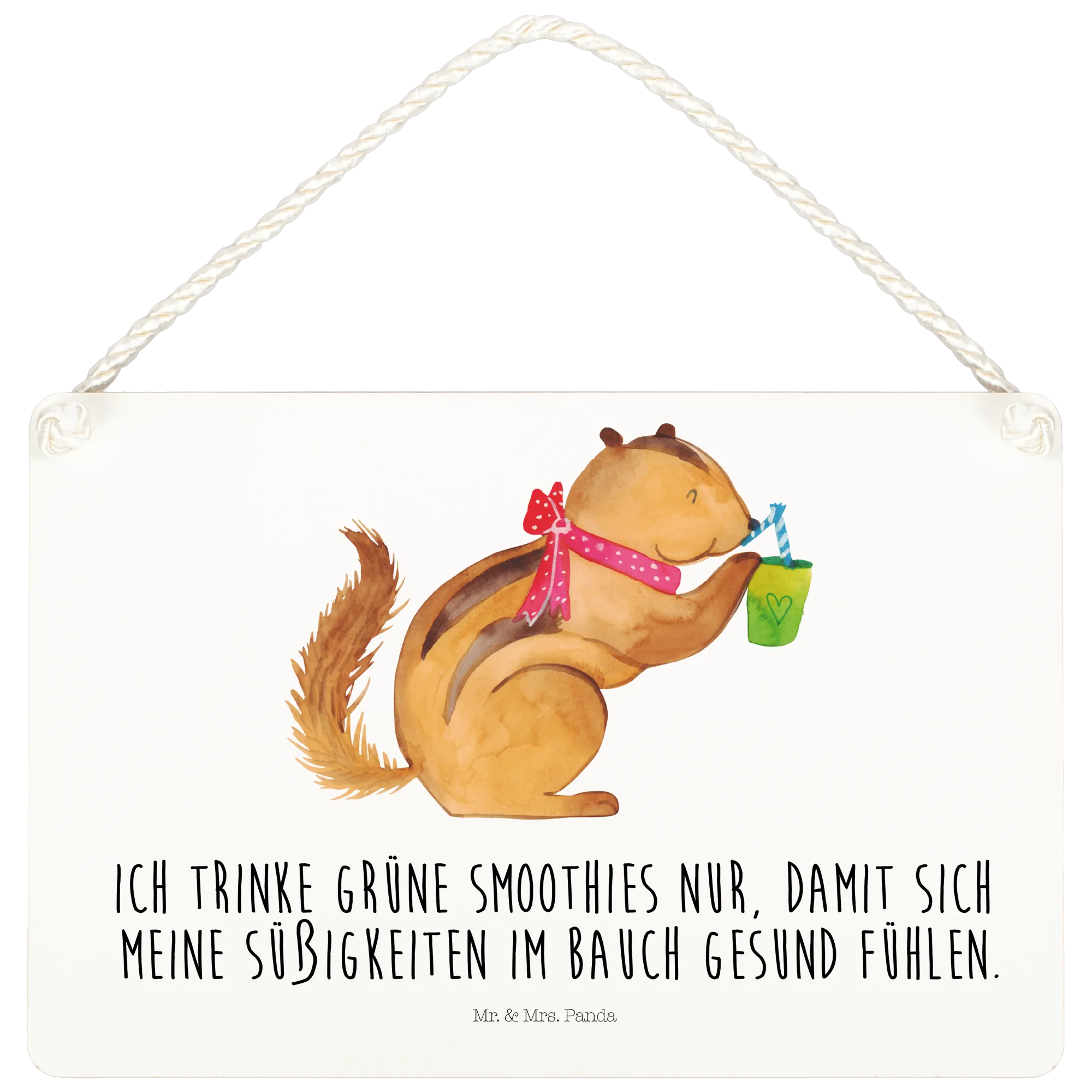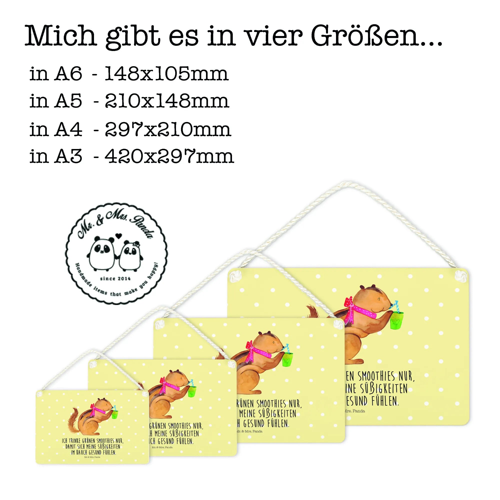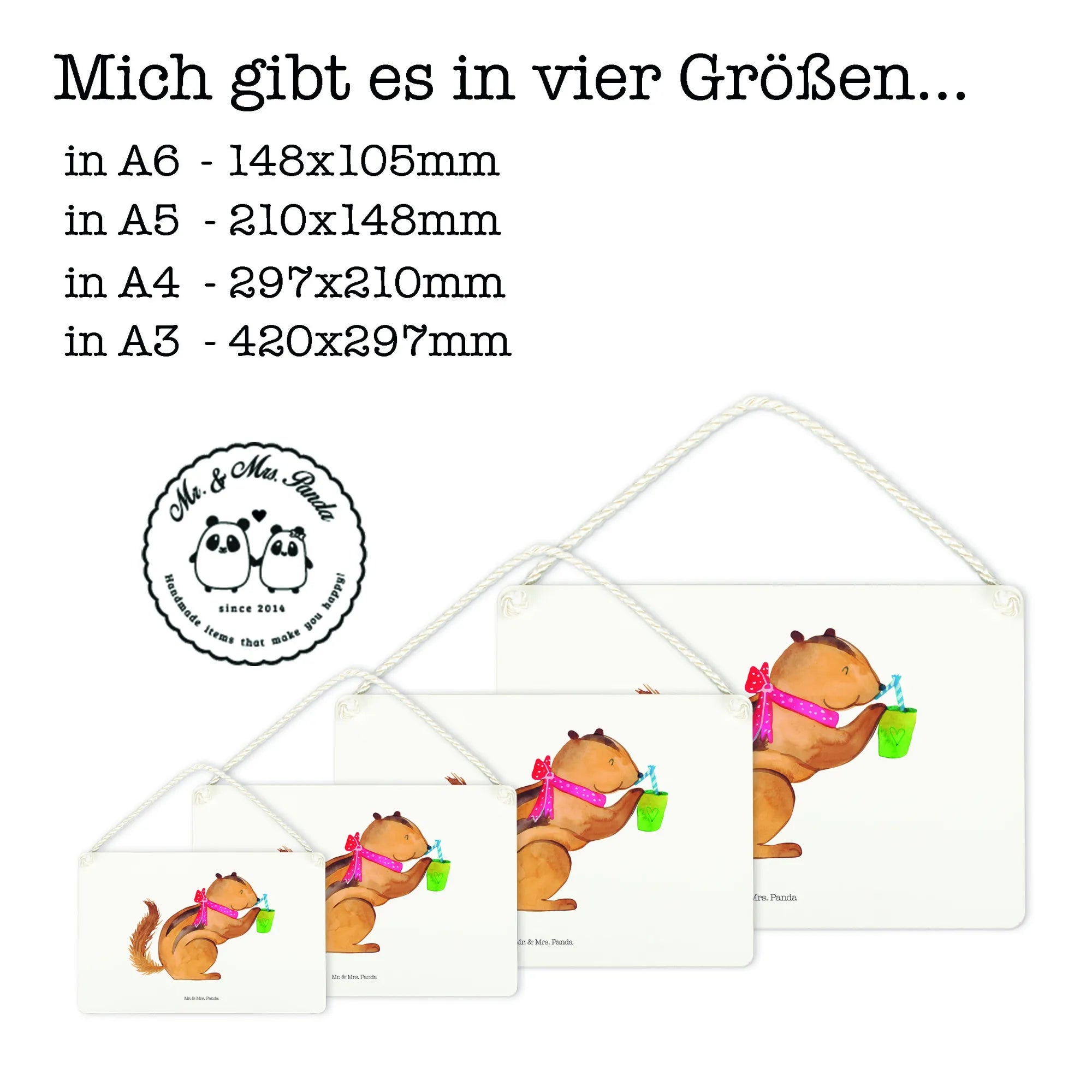 Das Deko Schild "Eichhörnchen Smoothie" von Mr. & Mrs. Panda ist der perfekte Hingucker für dein Zuhause! Mit einem fröhlichen Design, das ein niedliches Eichhörnchen zeigt, das genüsslich an einem Smoothie schlürft, bringt dieses Schild gute Laune in jeden Raum.