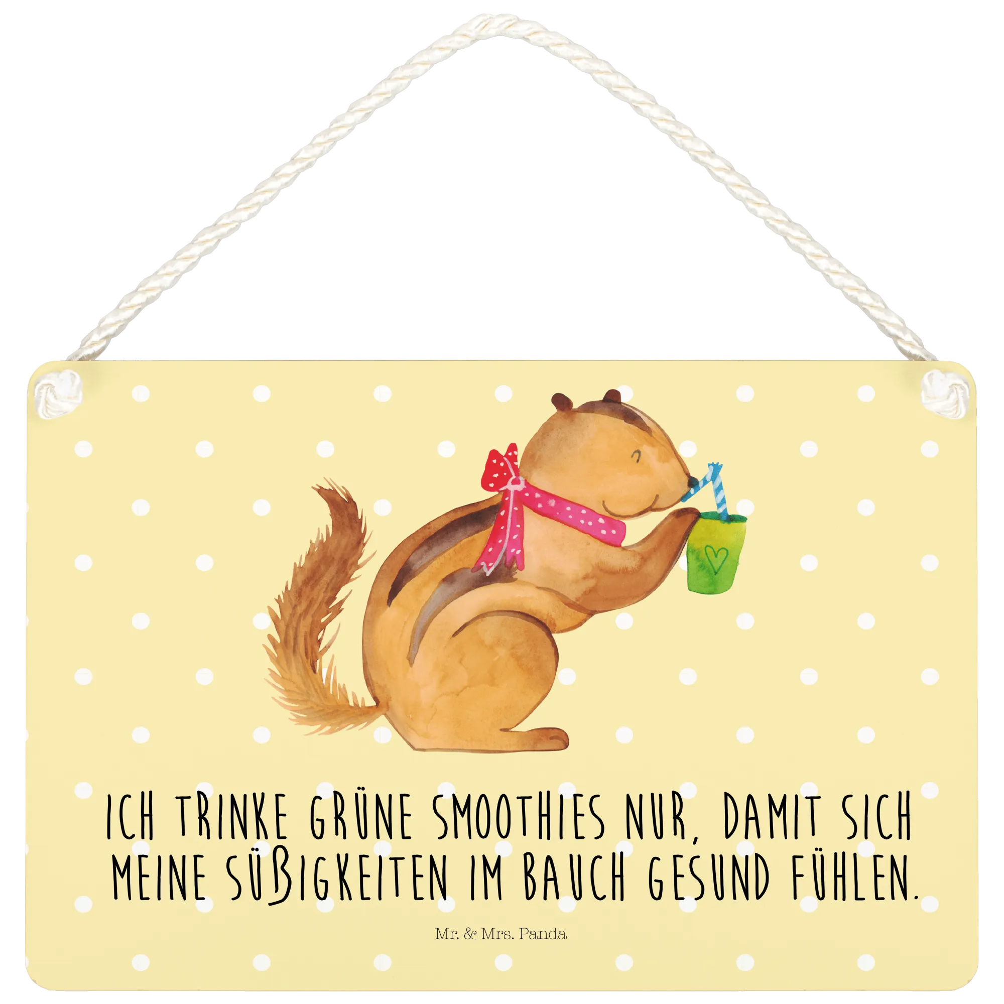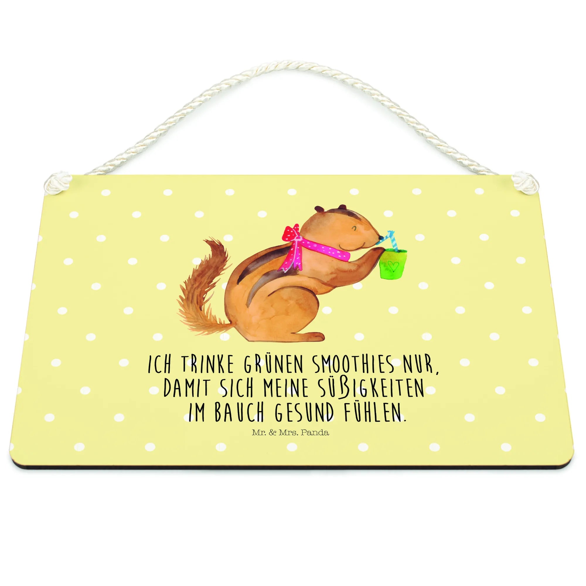 Das hübsche Deko Schild "Eichhörnchen Smoothie" von Mr. & Mrs. Panda ist die perfekte Ergänzung für dein Zuhause. Mit seinem charmanten Design bringt es nicht nur gute Laune in deine vier Wände, sondern auch eine tolle Botschaft. Das süße Eichhörnchen, das genüsslich an einem Smoothie schlürft, verzaubert jeden Betrachter und ist ein absolutes Highlight in deiner Dekoration.