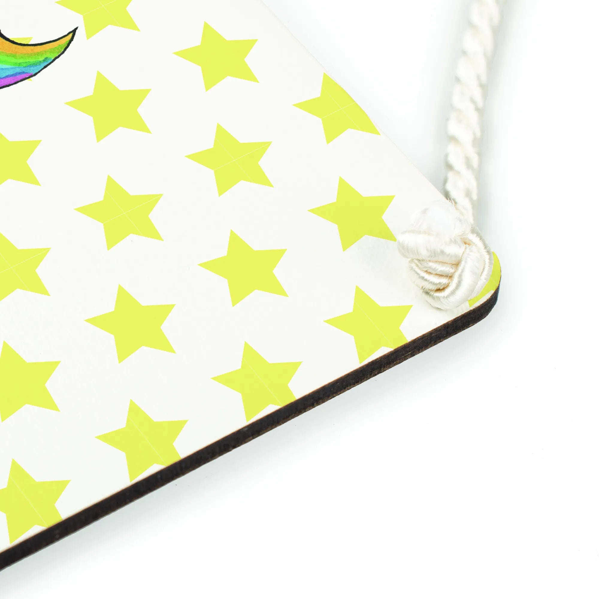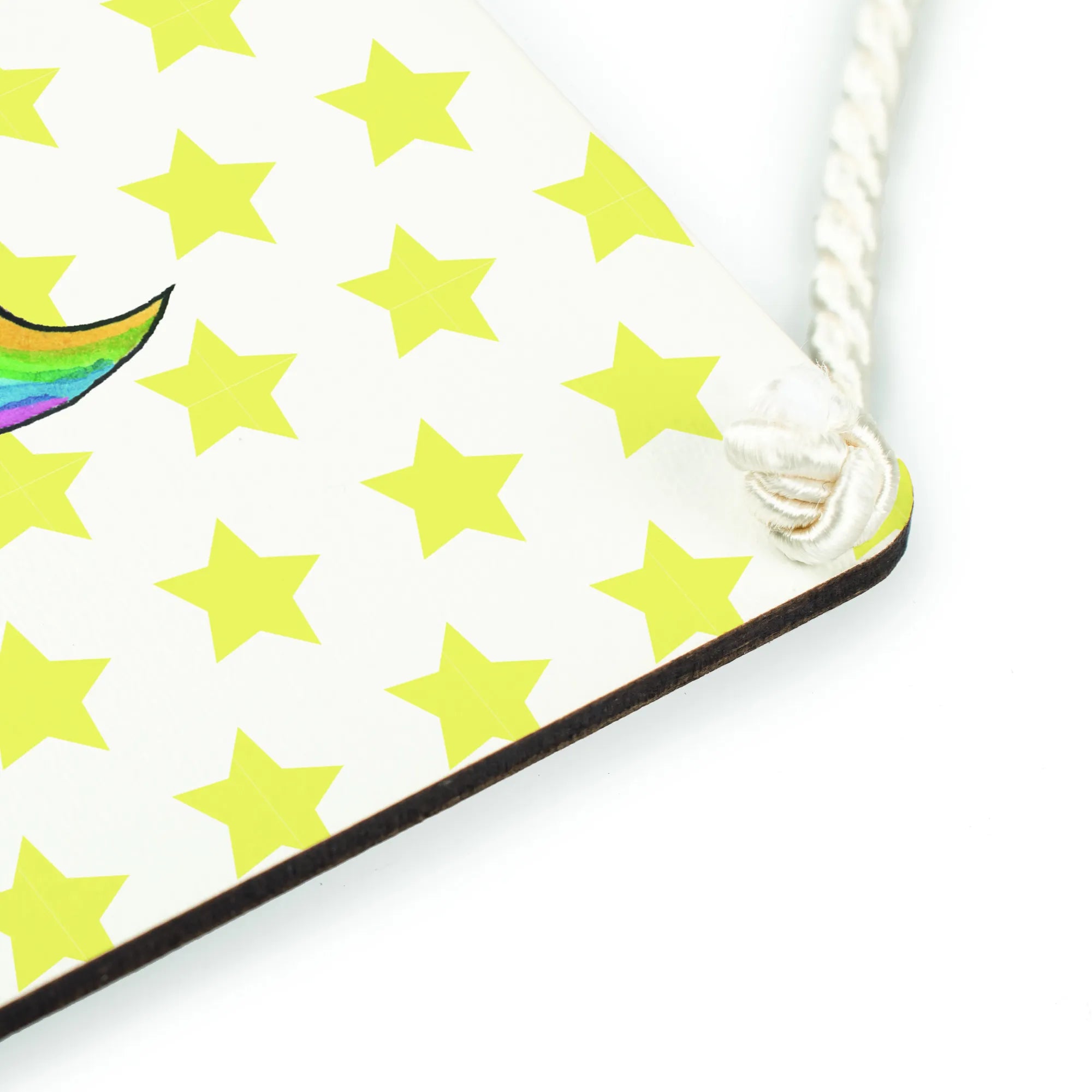 Mit seinem farbenfrohen und fröhlichen Einhorn-Motiv begeistert es alle, die an die Magie der Einhörner glauben und sich an kleinen glücklichen Momenten erfreuen wollen. Ob als Türschild oder Wandschild, dieses Deko Schild kann überall für strahlende Stimmung sorgen. Es eignet sich hervorragend als schlichtes, aber liebevolles Geschenk für Kindergeburtstage, Einweihungsfeiern oder einfach, um jemandem ein Lächeln ins Gesicht zu zaubern.