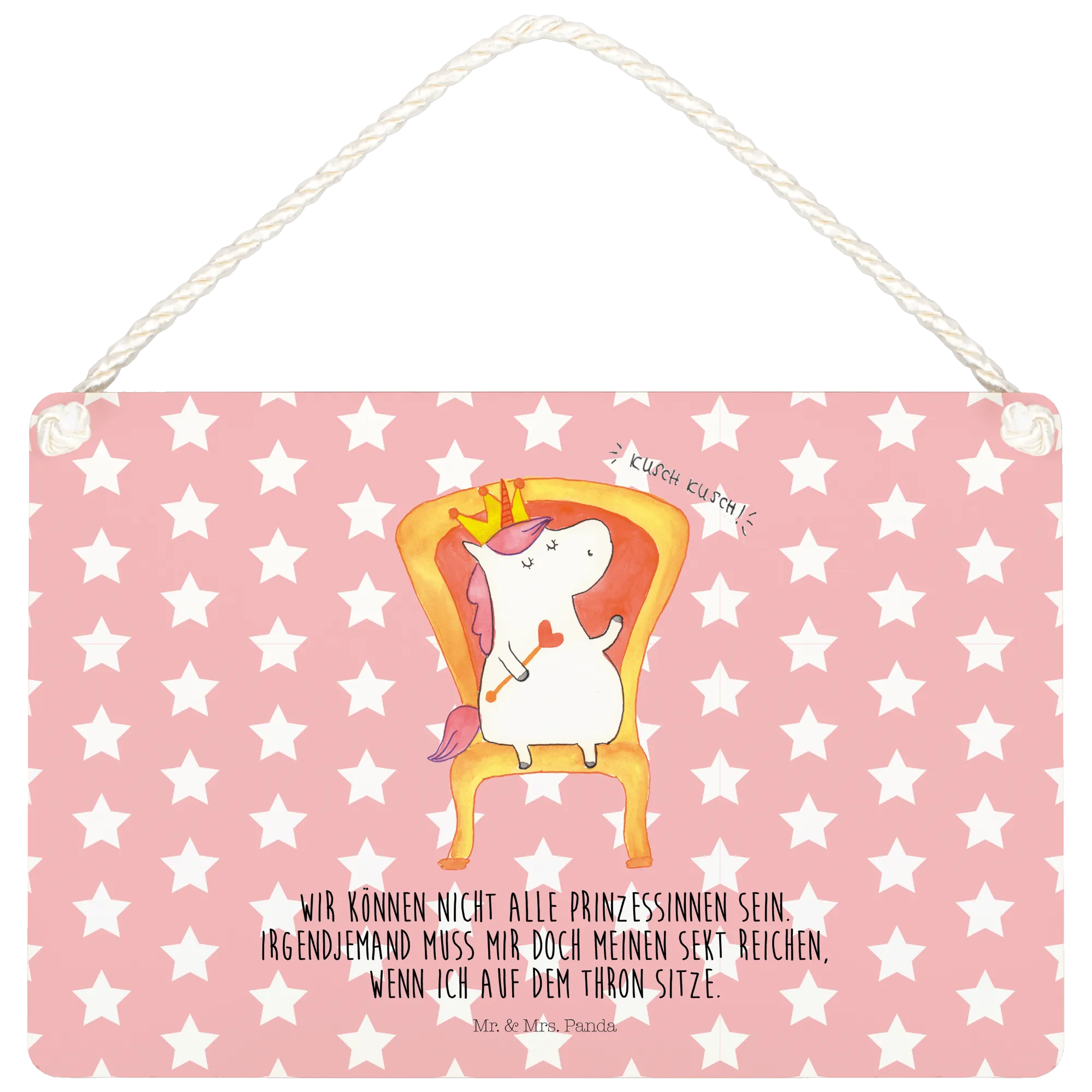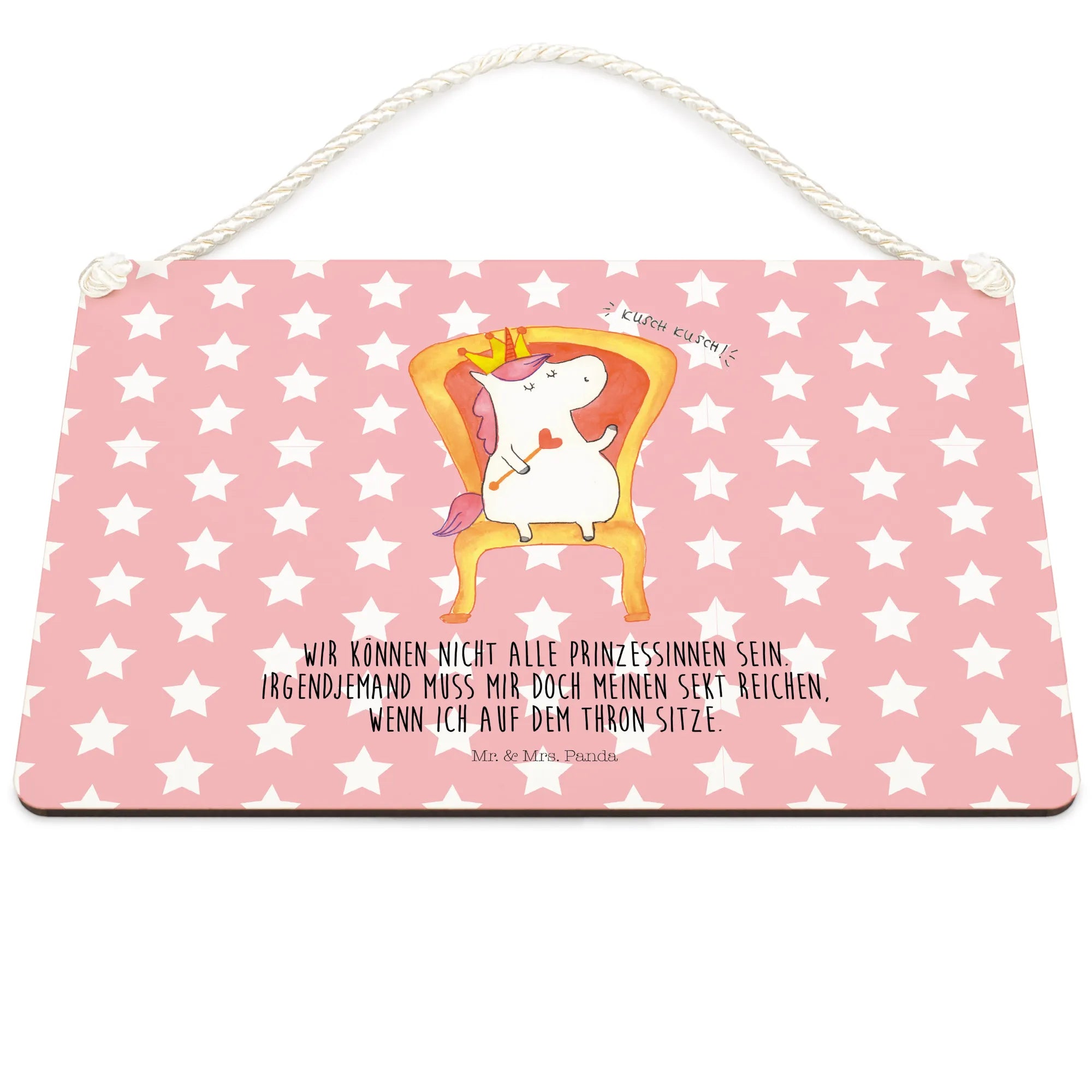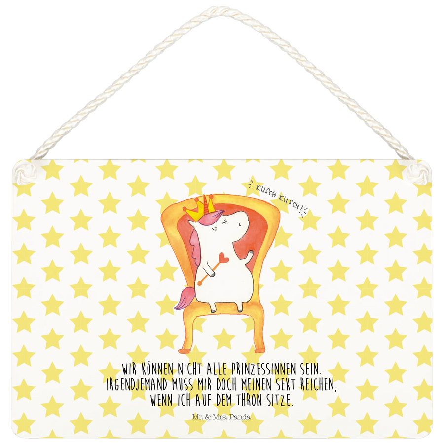 Das zauberhafte Deko Schild Einhorn König von Mr. & Mrs. Panda ist das perfekte Geschenk für alle, die die magische Welt der Einhörner lieben. Mit einem süßen Einhorn, das stolz auf seinem Thron sitzt und einer Krone auf dem Kopf, zaubert dieses Schild jedem ein Lächeln ins Gesicht. Der lustige Spruch "Wir können nicht alle Prinzessinnen sein. Irgendjemand muss mir doch meinen Sekt reichen, wenn ich auf dem Thron sitze." bringt Leichtigkeit und Humor in jedes Zuhause.