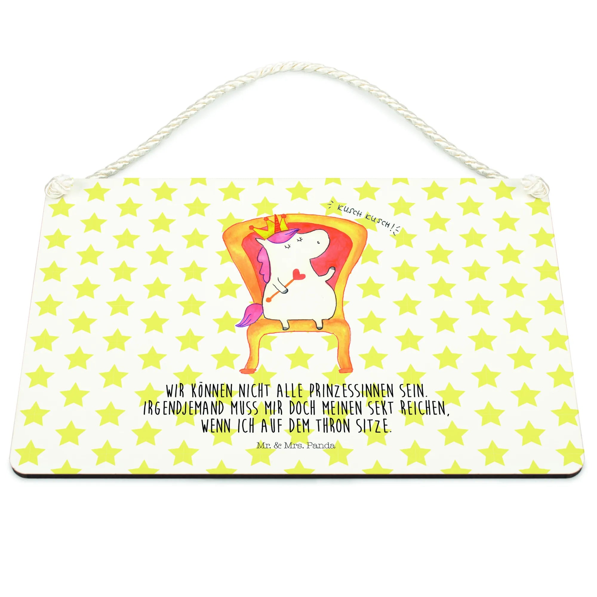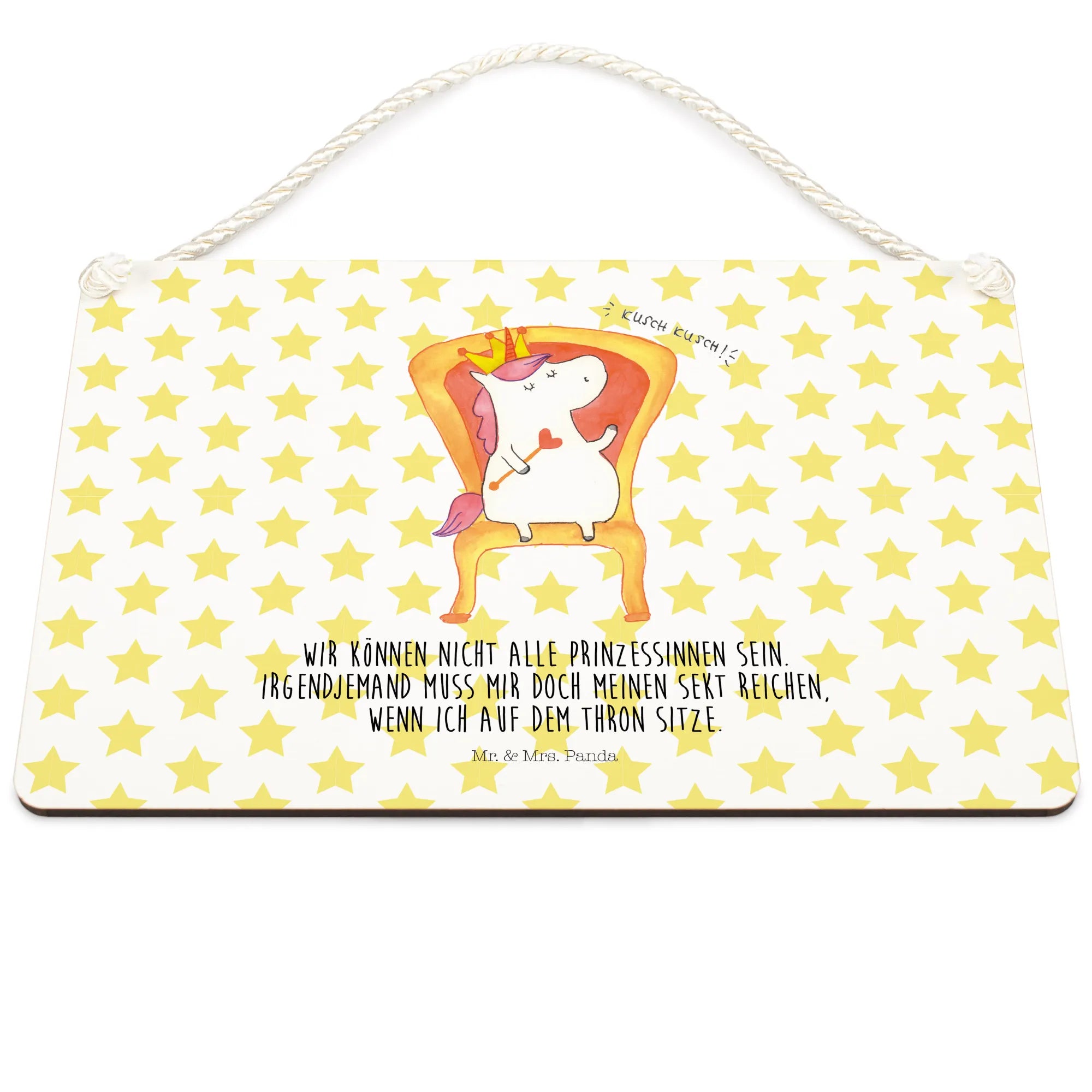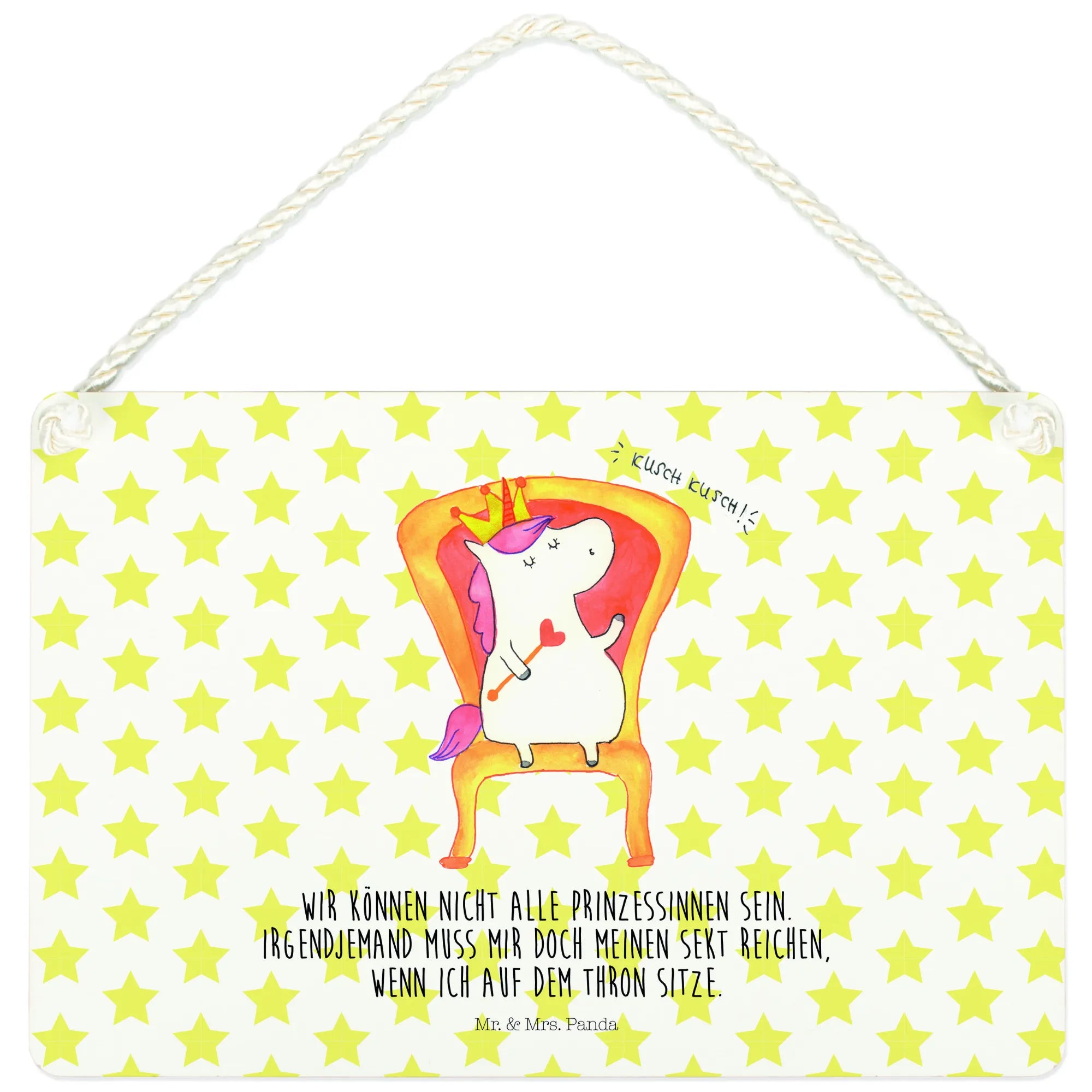 Das zauberhafte Deko Schild Einhorn König von Mr. & Mrs. Panda ist das perfekte Geschenk für alle, die die magische Welt der Einhörner lieben. Mit einem süßen Einhorn, das stolz auf seinem Thron sitzt und einer Krone auf dem Kopf, zaubert dieses Schild jedem ein Lächeln ins Gesicht. Der lustige Spruch "Wir können nicht alle Prinzessinnen sein. Irgendjemand muss mir doch meinen Sekt reichen, wenn ich auf dem Thron sitze." bringt Leichtigkeit und Humor in jedes Zuhause.