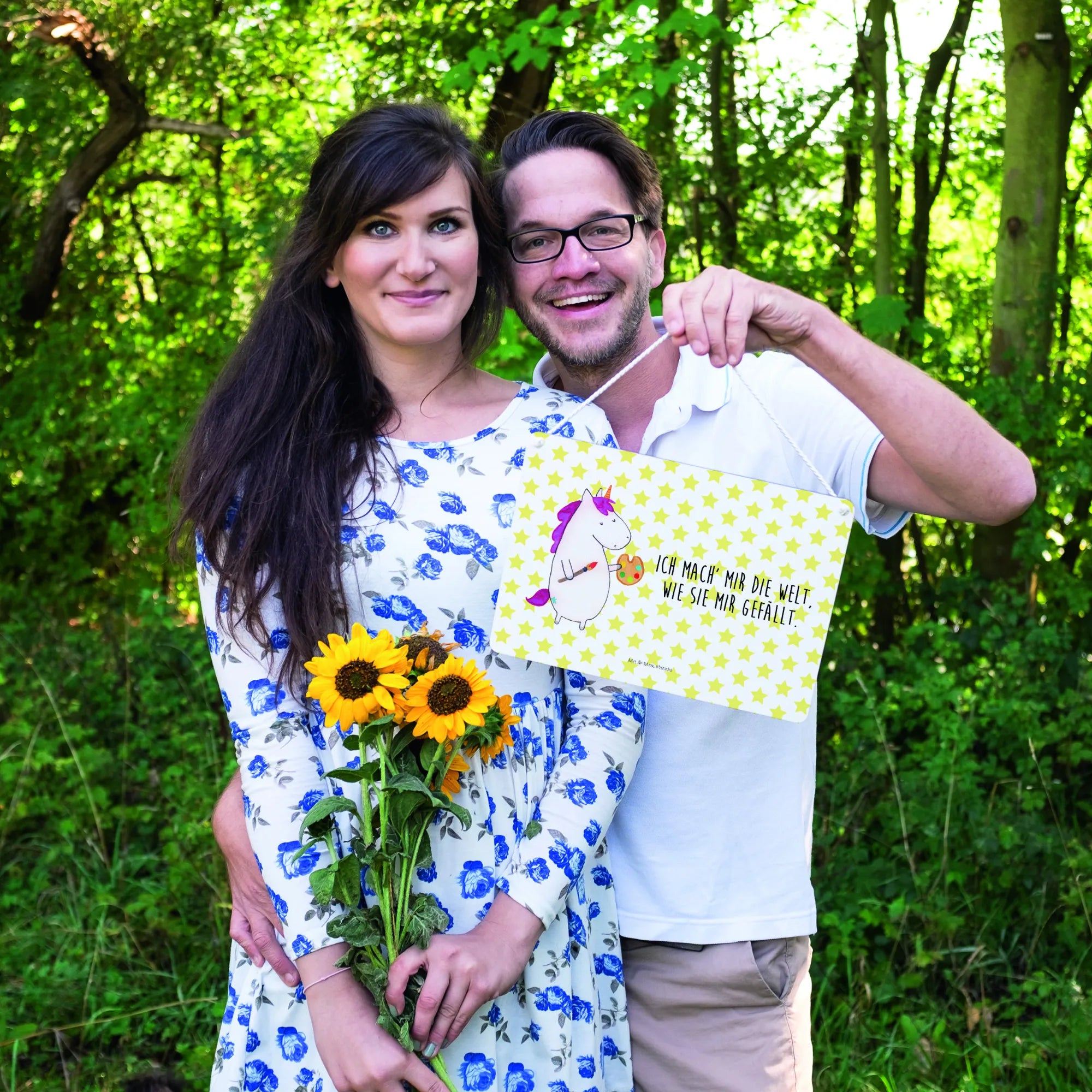 Das Deko Schild mit dem zauberhaften Einhorn Künstler Motiv von Mr. & Mrs. Panda ist das perfekte Geschenk für kreative Seelen und Einhornliebhaber! Mit einem niedlichen Einhorn, das an einer Staffelei malt, bringt dieses Schild nicht nur Farbe in dein Leben, sondern auch viel Freude und Inspiration. Der Slogan "Ich mach' mir die Welt, wie sie mir gefällt" setzt einen fröhlichen Akzent und ruft dazu auf, die eigene Umgebung nach vielen Möglichkeiten zu gestalten. Egal, ob du es als dekorativen Blickfang an deiner Wand oder als liebevollen Willkommensgruß an deiner Tür anbringst – dieses Schild wird garantiert alle Blicke auf sich ziehen!