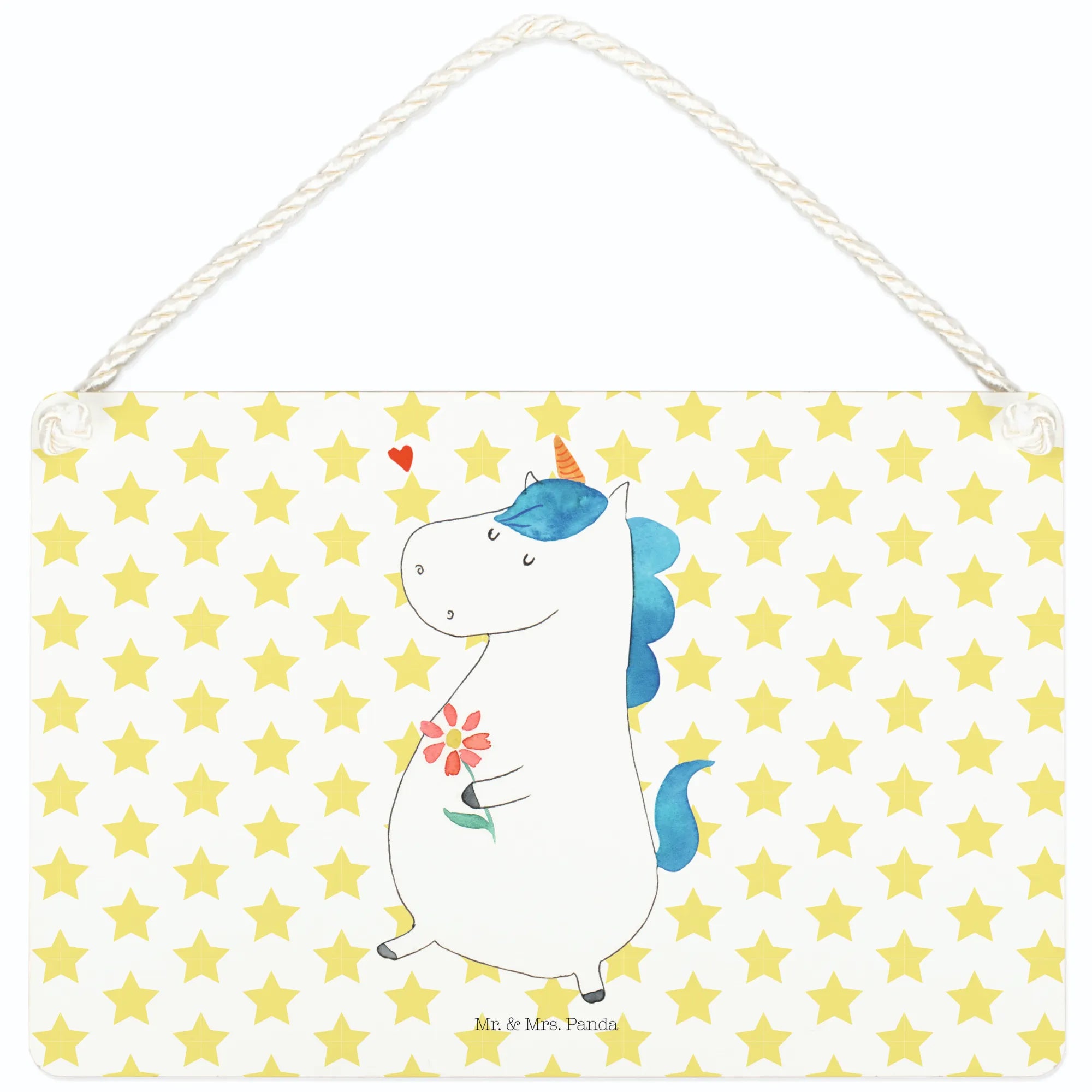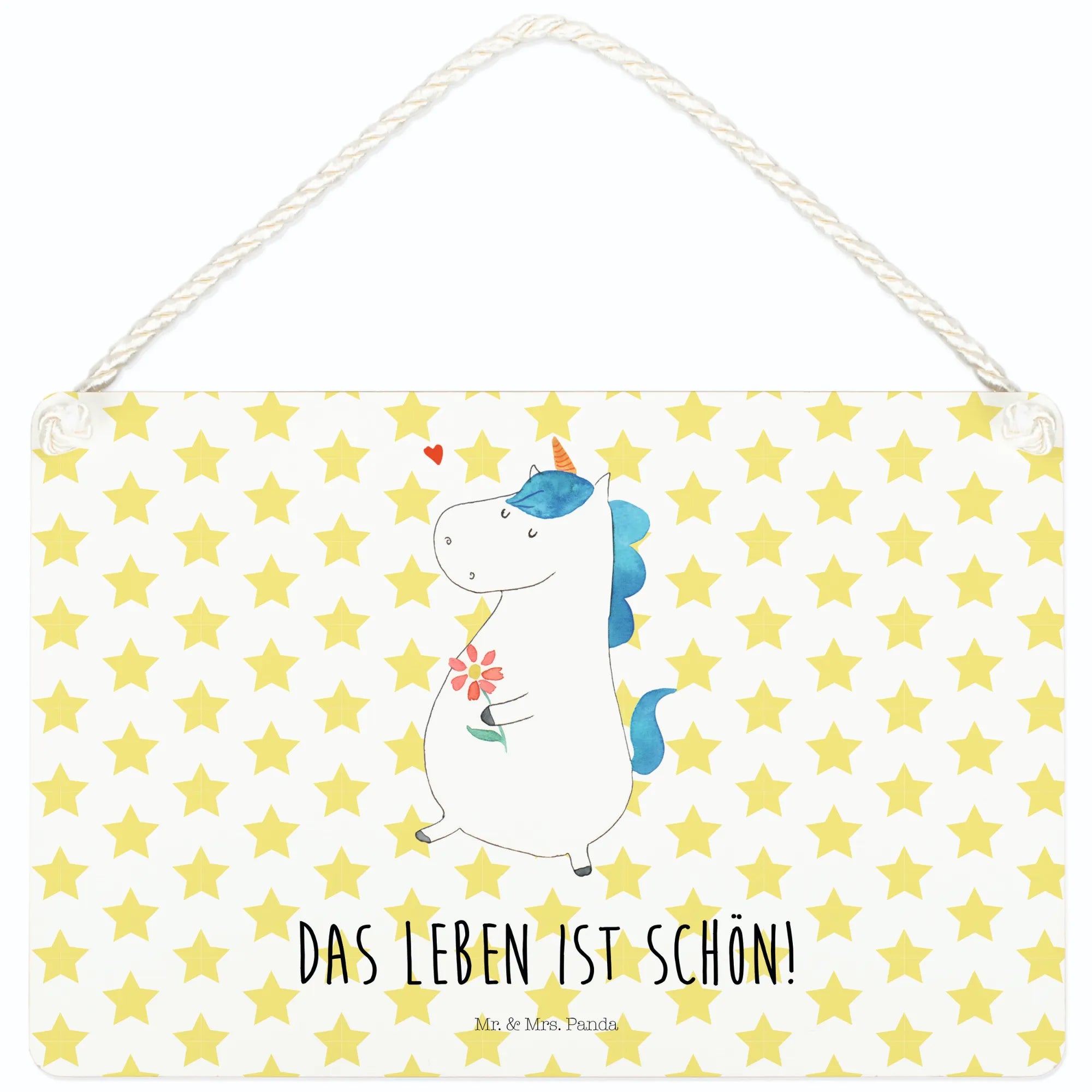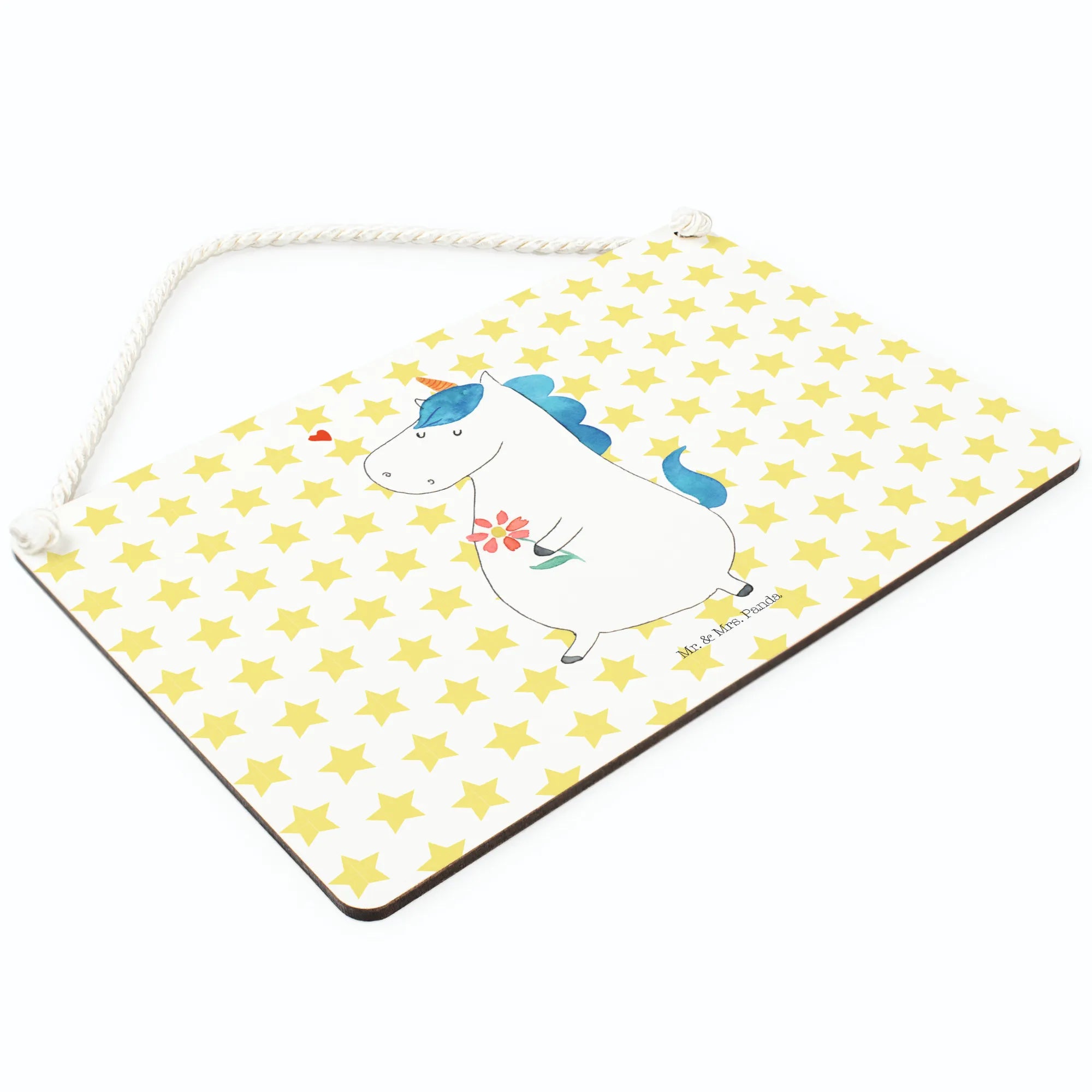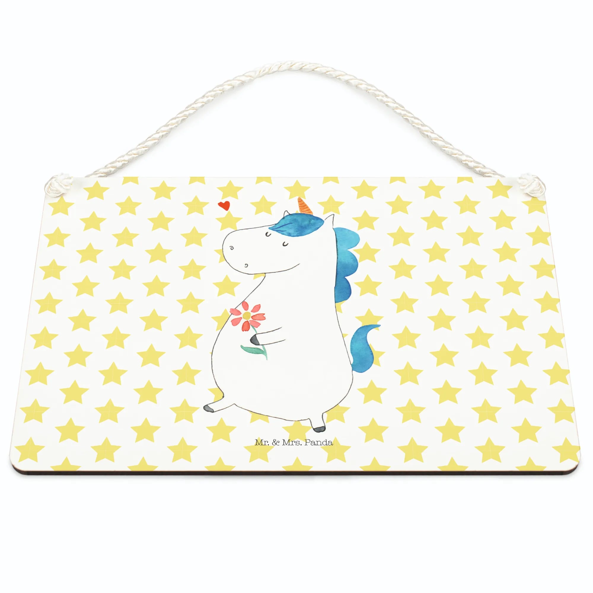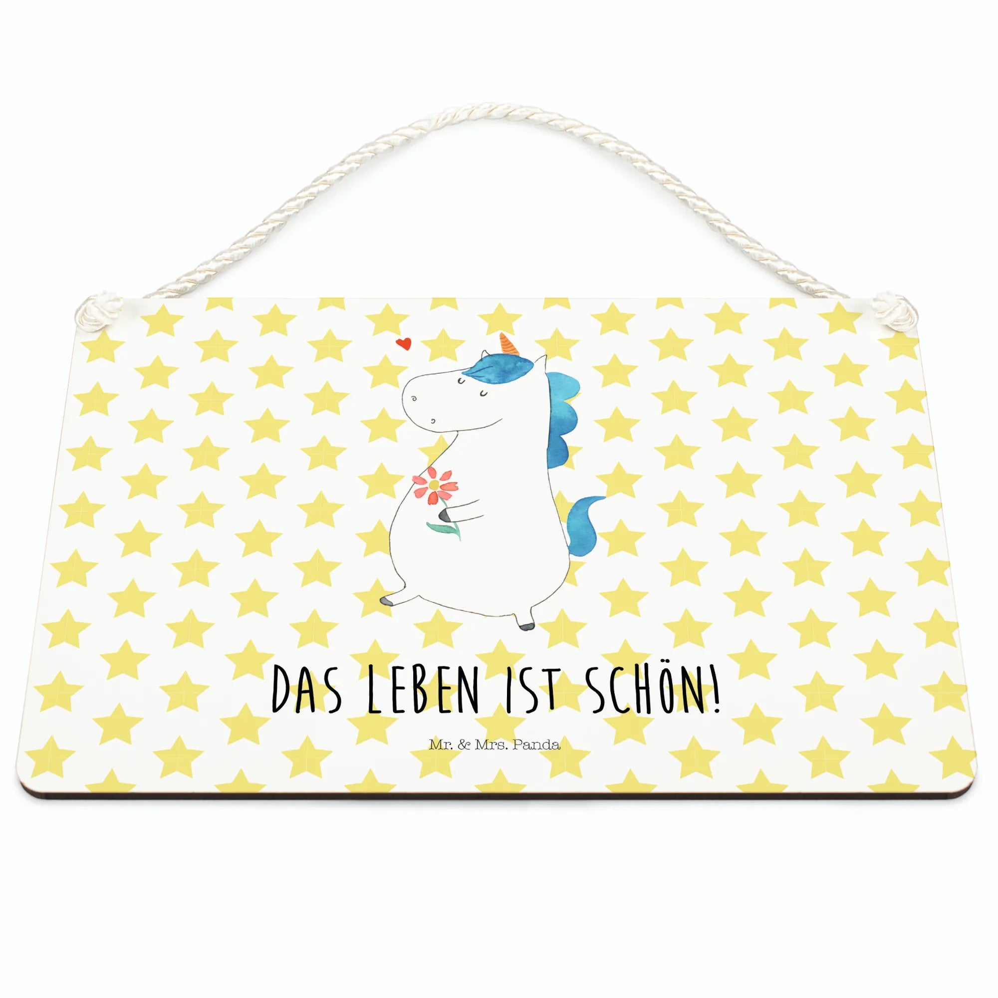 Bist du auf der Suche nach einem ganz besonderen Geschenk für jemanden, der Einhörner und die zauberhafte Welt, die sie umgibt, liebt? Dann ist das Deko Schild mit dem Motiv "Einhorn Spaziergang" aus der Einhorn-Kollektion von Mr. & Mrs. Panda genau das Richtige für dich! Dieses wunderschöne und edle Deko Schild ist nicht nur ein tollen Blickfang, sondern bringt auch Freude und gute Laune in jedes Zuhause. Es zeigt ein süßes Einhorn, das zufrieden mit einer Blume in der Hand einen Spaziergang macht – ein Bild, das sicherlich jedem ein Lächeln ins Gesicht zaubert.
