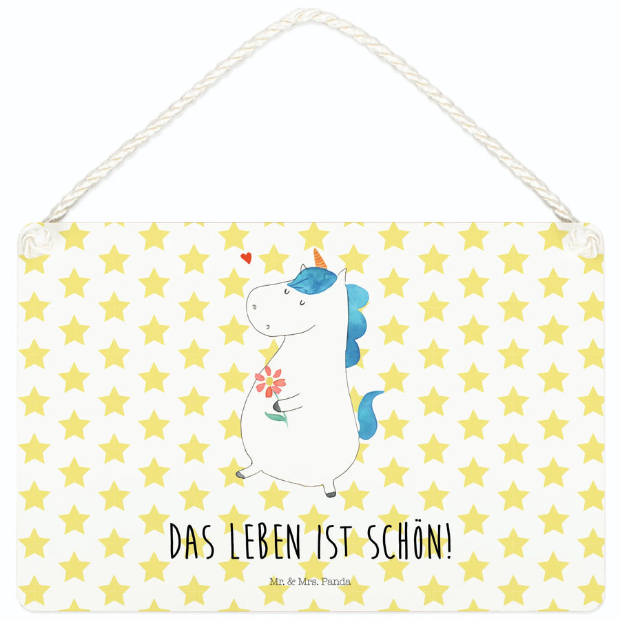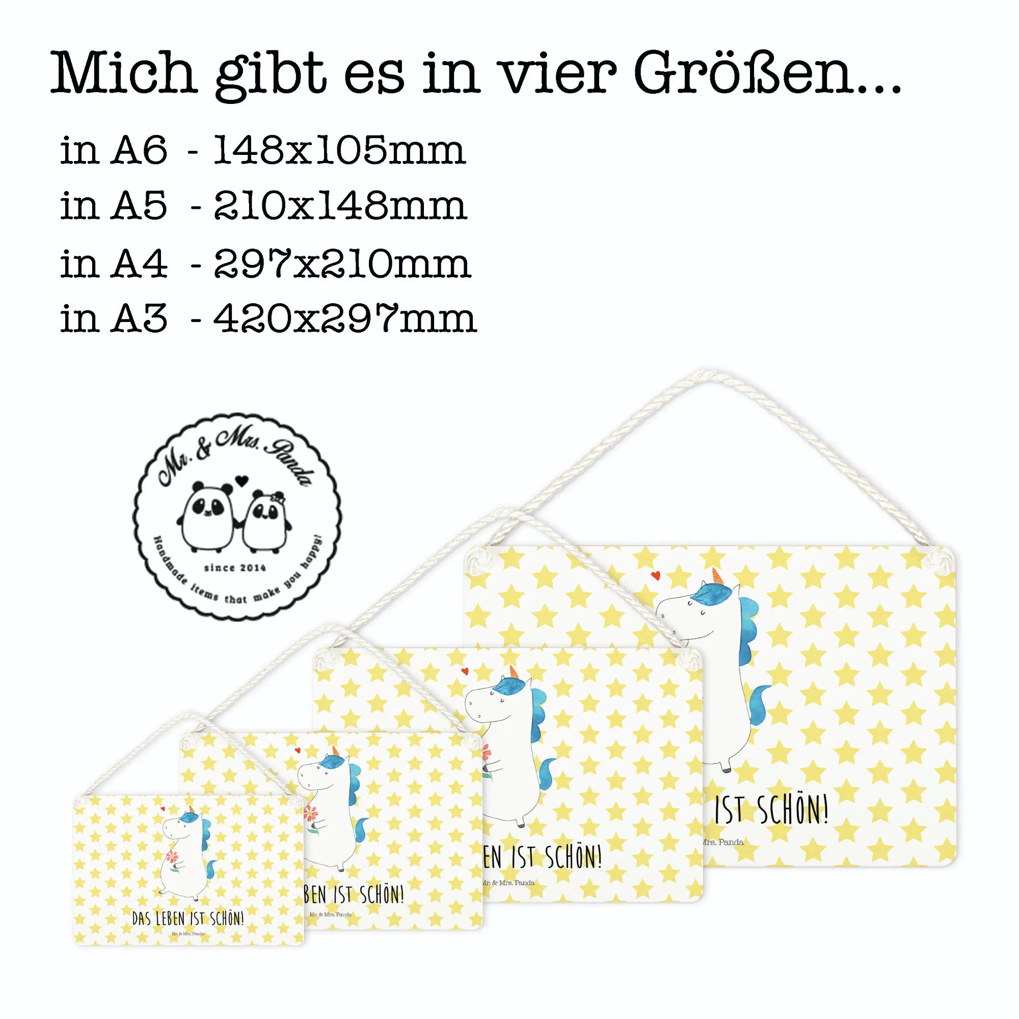 Ob in deinem Wohnzimmer, im Kinderzimmer oder als dekoratives Element an der Tür, dieses Schild wird garantiert alle Blicke auf sich ziehen. Das Design zeigt ein süßes Einhorn, das fröhlich mit einer Blume in der Hand spazieren geht, und der Slogan "Das Leben ist schön!" bringt gute Laune und Motivation in jeden Tag.