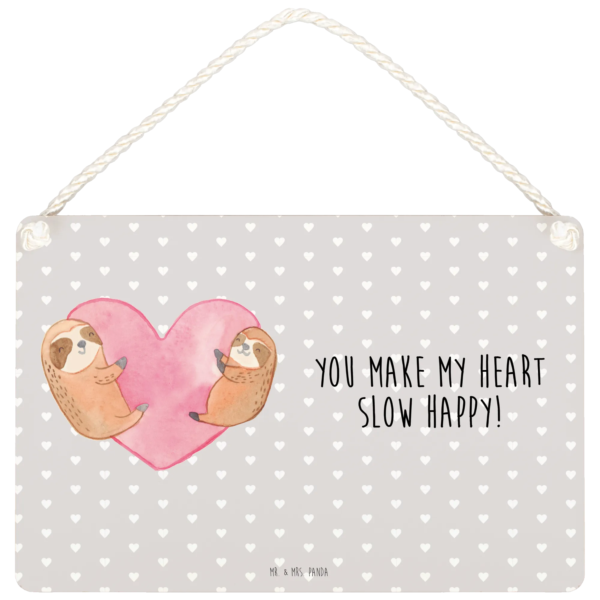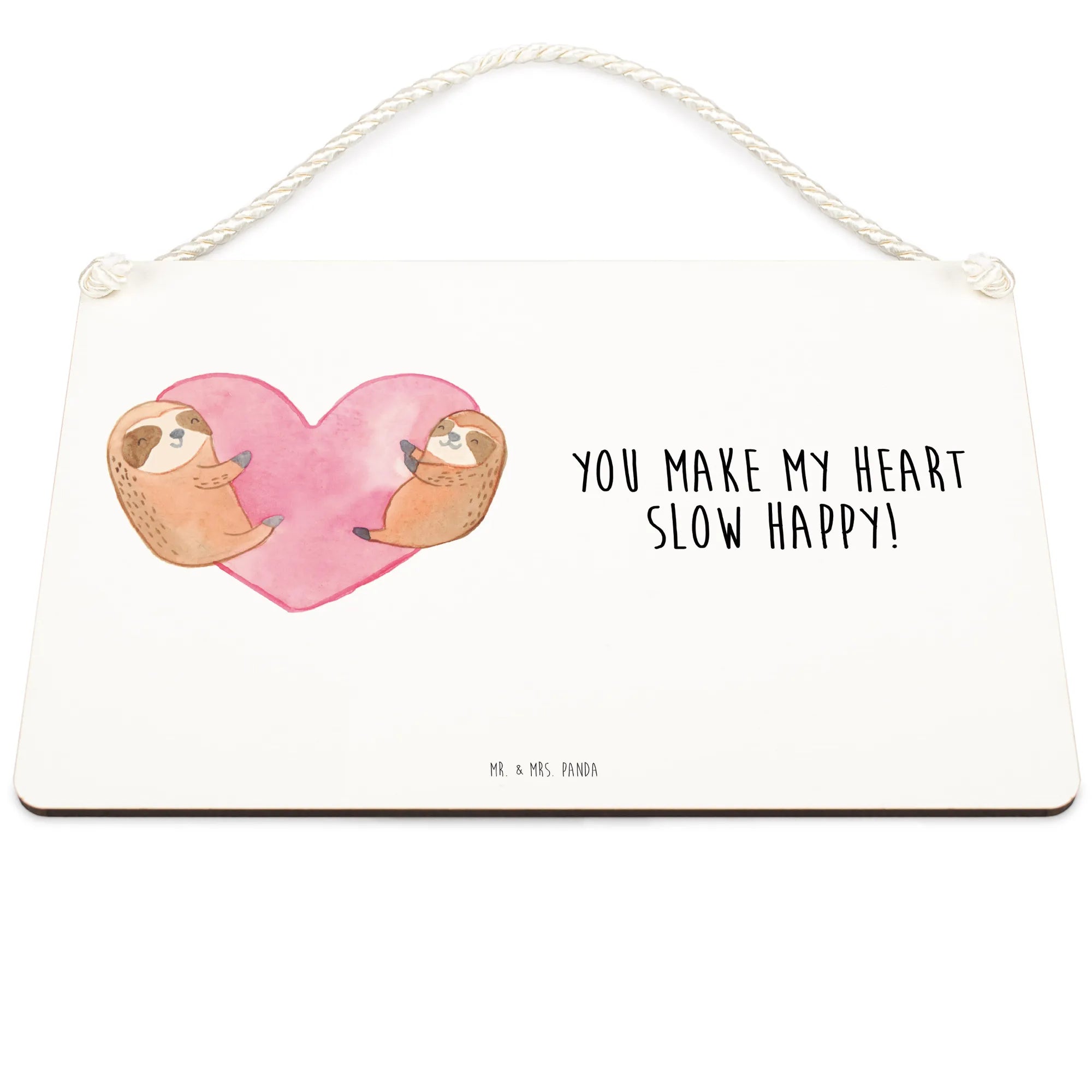 Das wunderschöne Deko Schild mit dem Motif "Faultiere Herz" von Mr. & Mrs. Panda ist das perfekte Geschenk für Verliebte! Es bringt nicht nur Liebe in jedes Zuhause, sondern erinnert Paare auch daran, wie schön Liebe sein kann. Auf diesem Schild sind zwei süße, kuschelnde Faultiere abgebildet, die in einem herzförmigen, rosafarbenen Aquarellhintergrund sitzen. Ihre entspannten Gesichter und zärtlichen Haltungen strahlen Zuneigung und Verbundenheit aus. Der eingedruckte Slogan "You make my heart slow happy!" macht es zu einem besonderen Liebesbeweis.