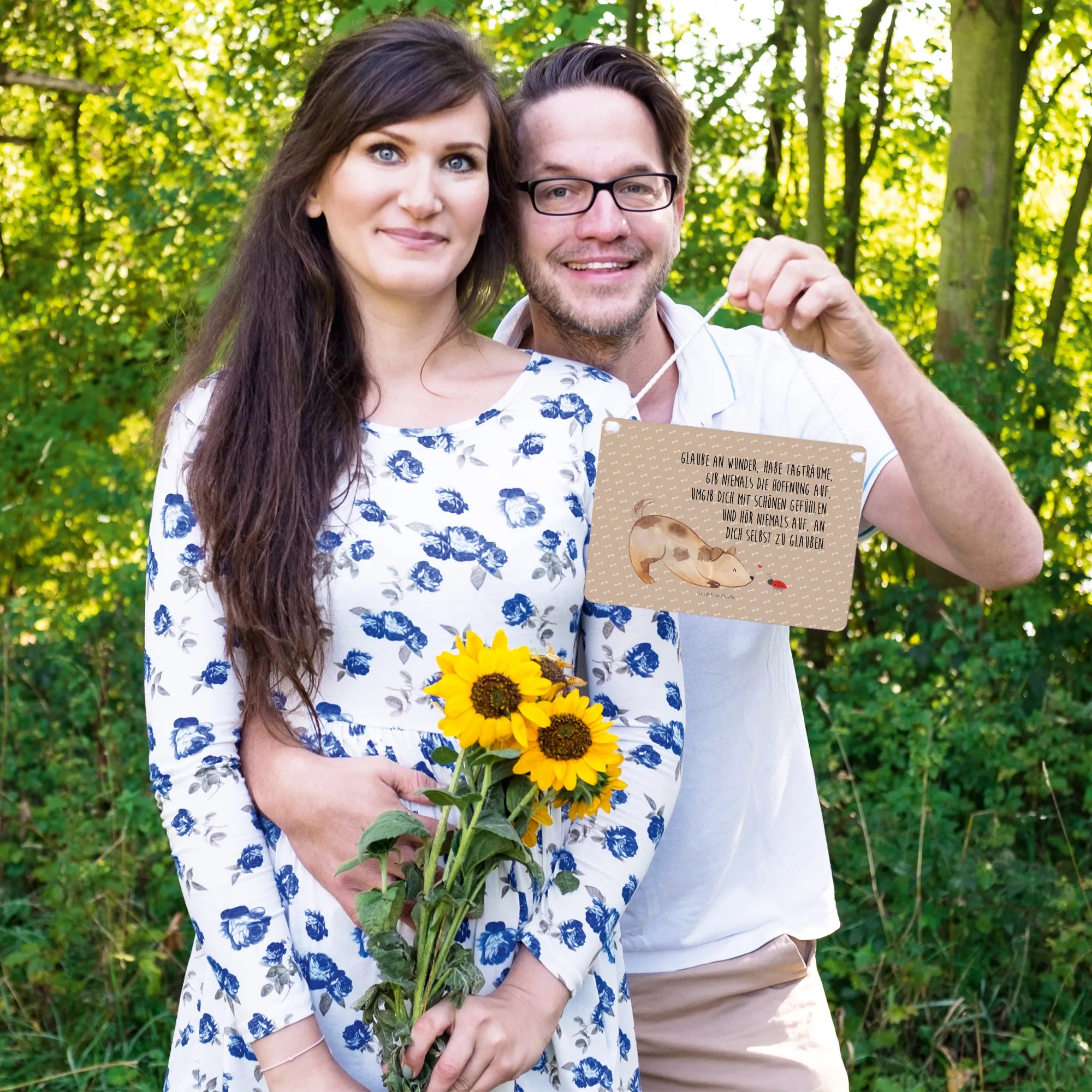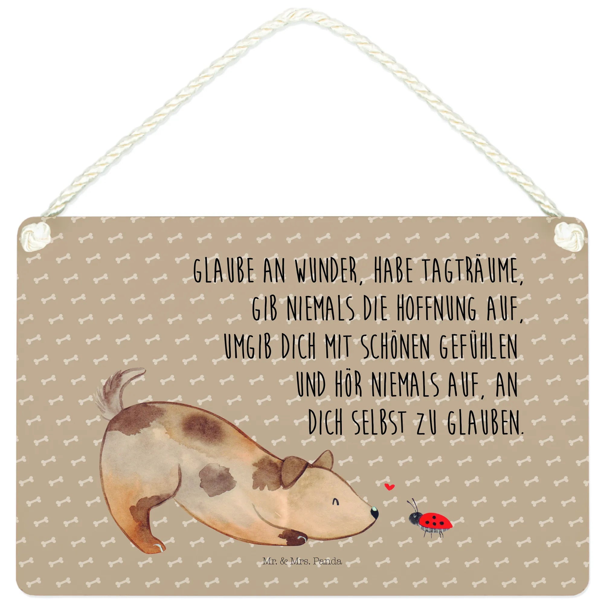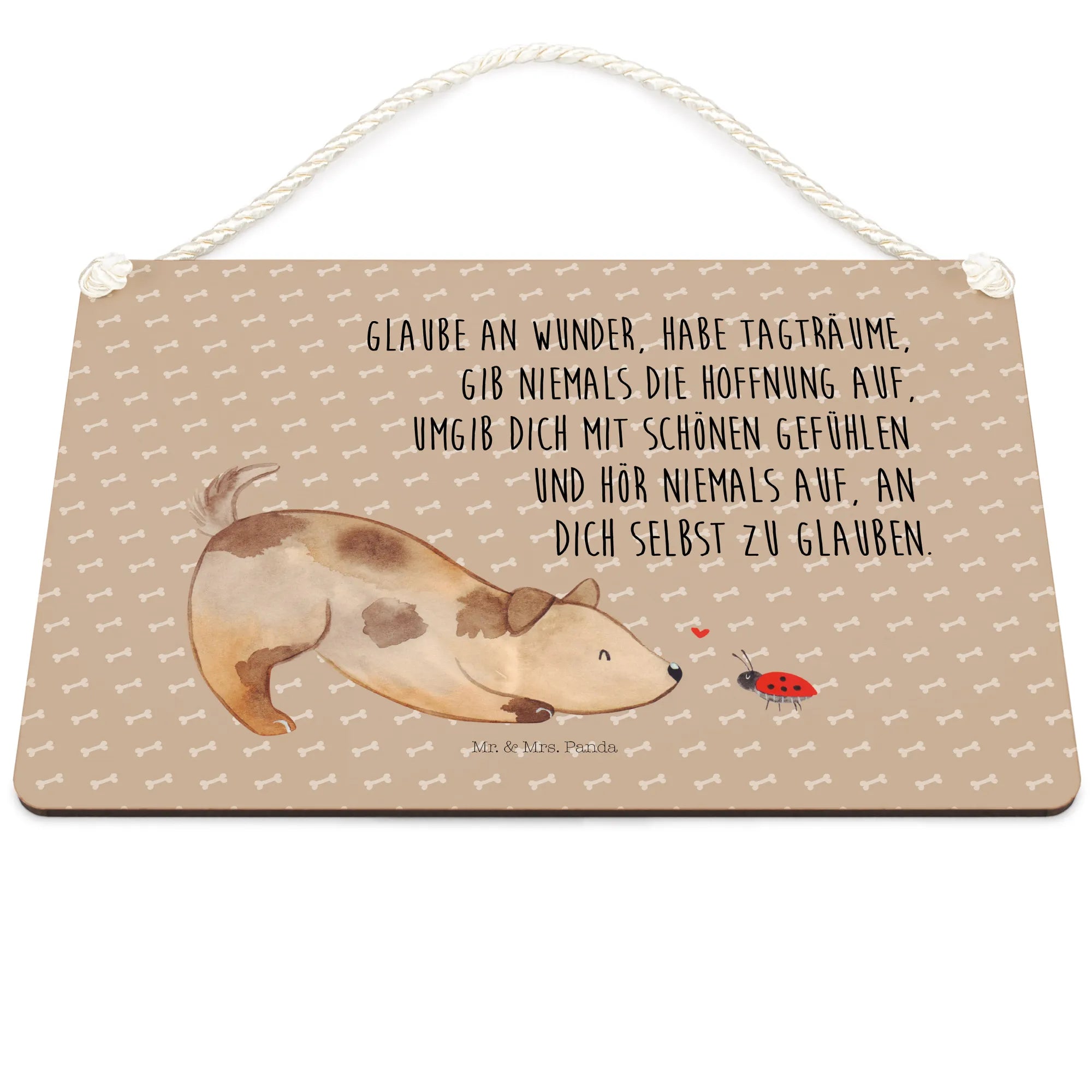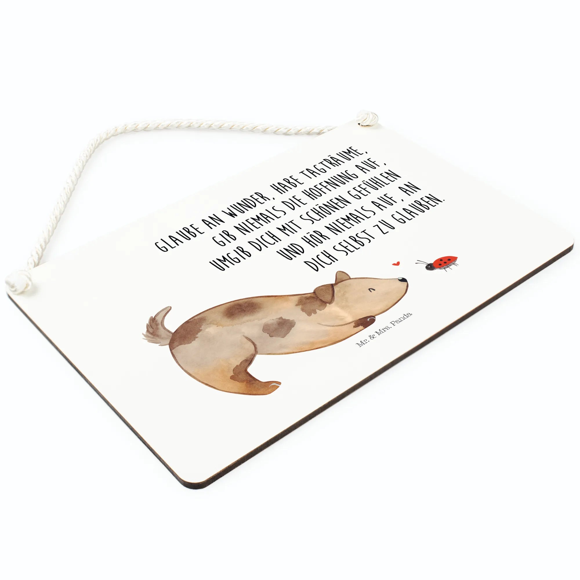 Ein wunderschönes Deko Schild aus der Hunde Kollektion von Mr. & Mrs. Panda ist der perfekte Begleiter für alle Hundeliebhaber. Dieses entzückende Schild zeigt einen niedlichen Hund, der begeistert vor einem kleinen Marienkäfer sitzt und bringt sofort gute Laune in dein Zuhause. Ob als Willkommensschild an der Tür oder als dekorativer Akzent an der Wand – dieses Schild ist nicht nur ein schöner Eyecatcher, sondern trägt auch eine wichtige Botschaft: "Glaube an Wunder, habe Tagträume, gib niemals die Hoffnung auf, umgib dich mit schönen Gefühlen und hör niemals auf, an dich selbst zu glauben."