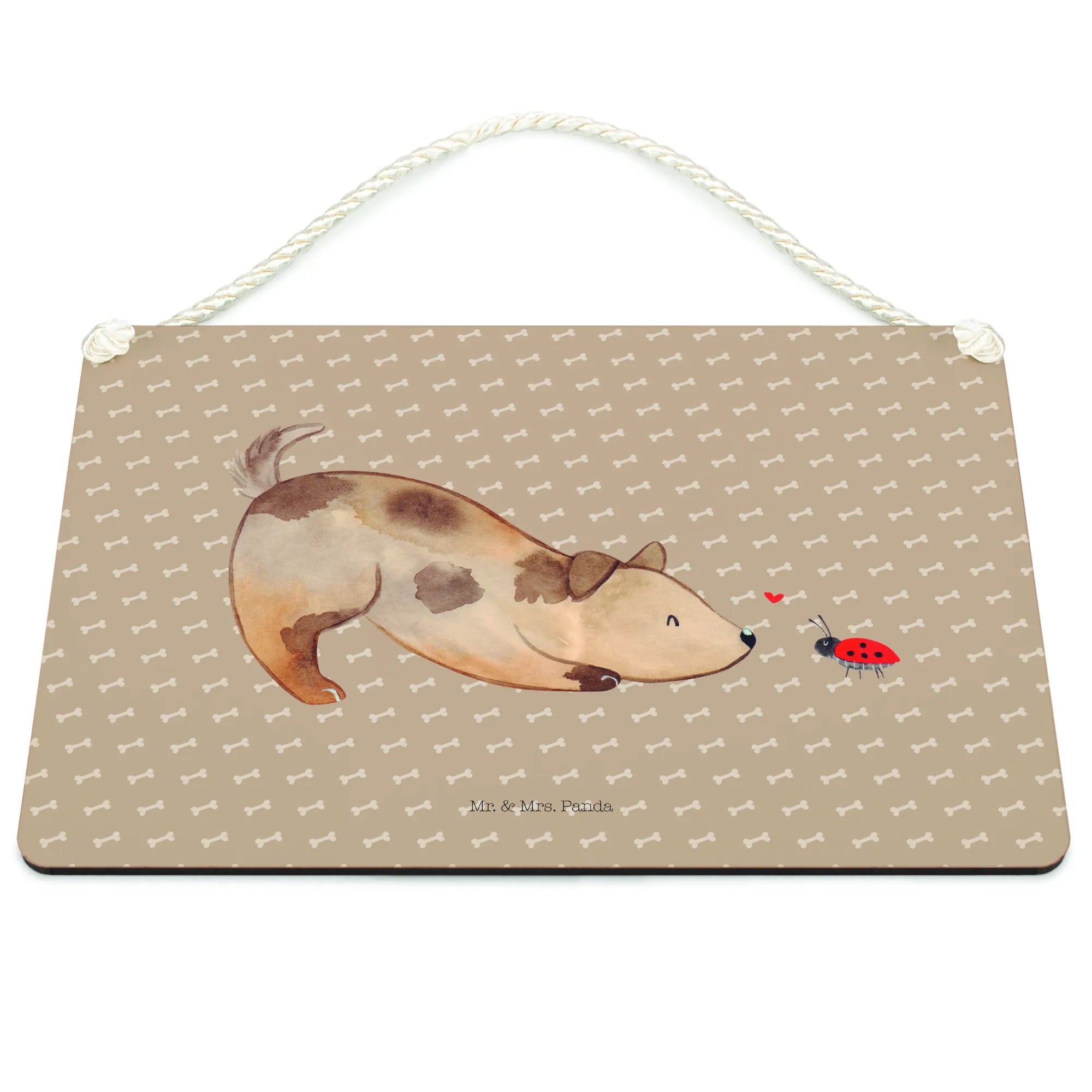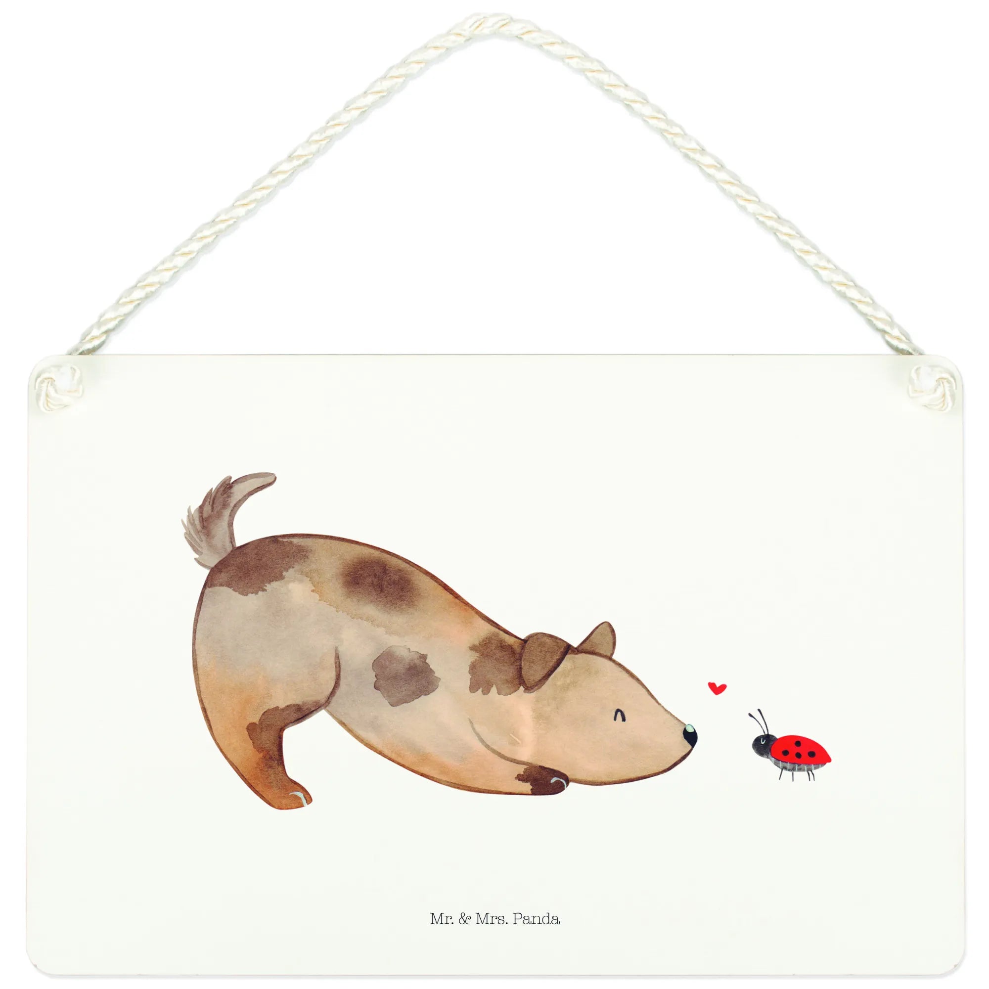 Das Deko Schild "Hund Marienkäfer" von Mr. & Mrs. Panda ist das perfekte Geschenk für jeden Hundeliebhaber und Hundebesitzer. Mit einem niedlichen Motiv, das einen begeisterten Hund zeigt, der vor einem kleinen Marienkäfer sitzt, bringt es ein Stückchen Freude in jedes Zuhause.