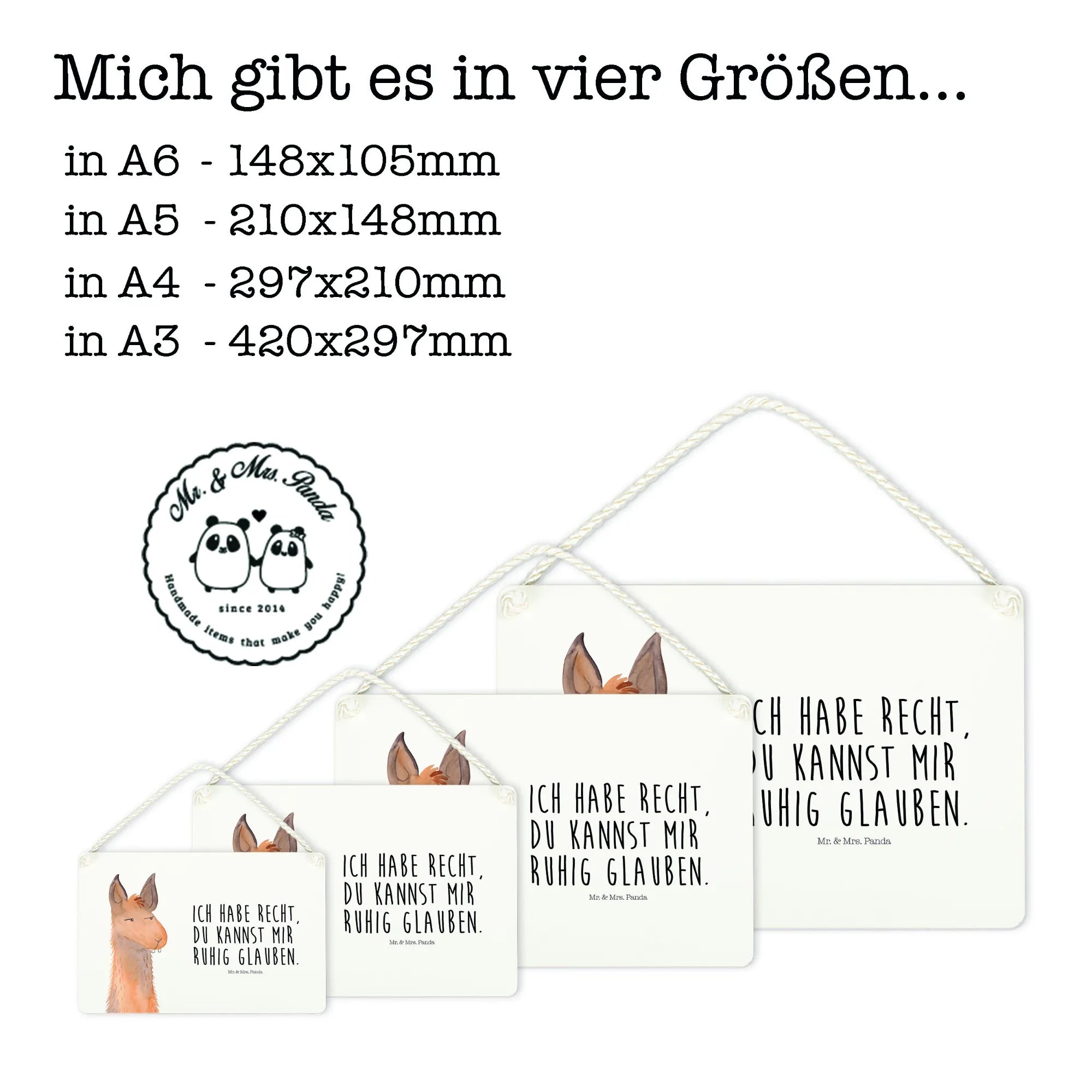 Die Maße von 210 mm x 148 mm machen es ideal als Tür oder Wanddeko, sei es zu Hause oder im Büro. Dank der liebevoll gedrehten Kordel lässt sich das Schild ganz einfach aufhängen. Die süßen Lamas, die Mr. & Mrs. Panda designt haben, symbolisieren die coolste Art der Tierwelt.