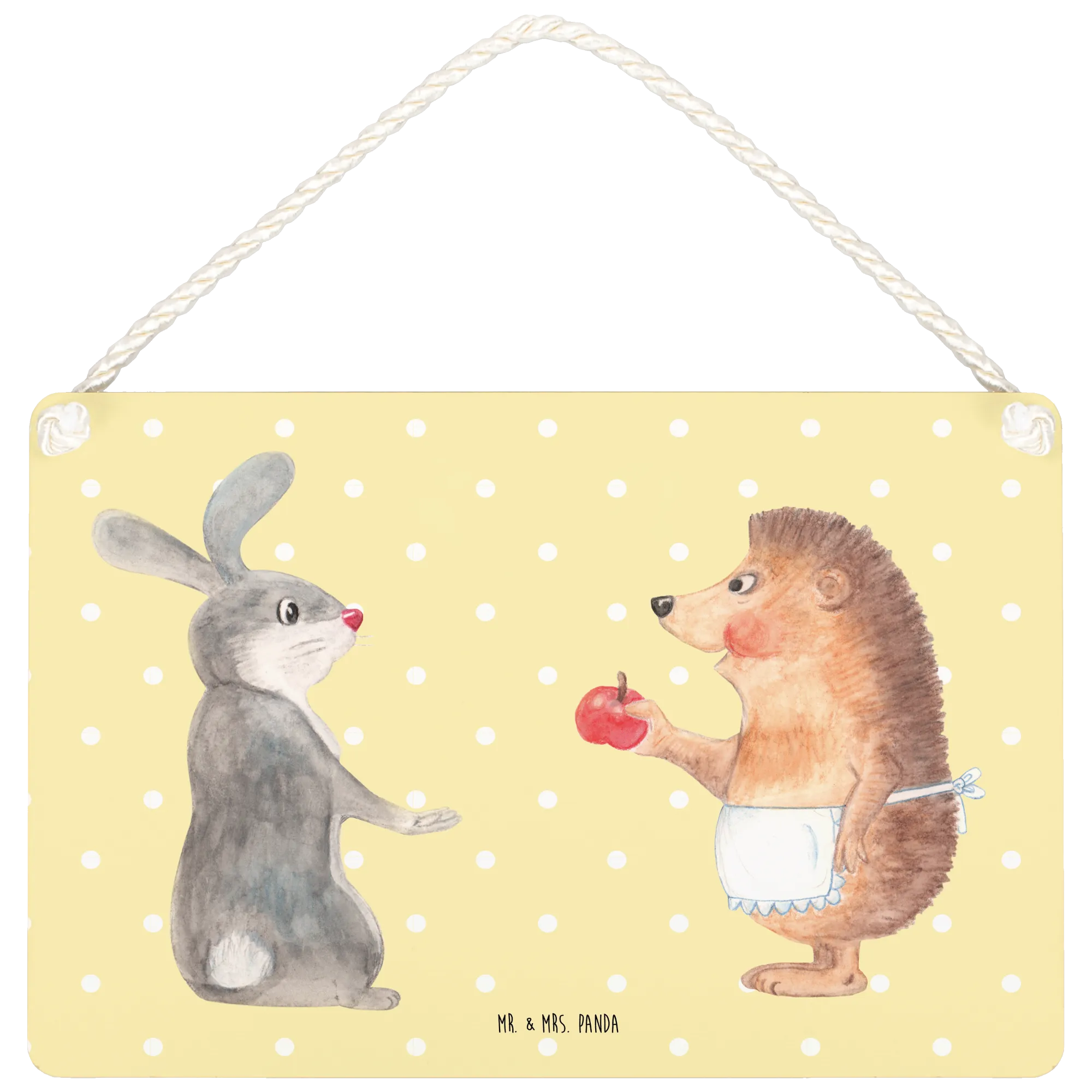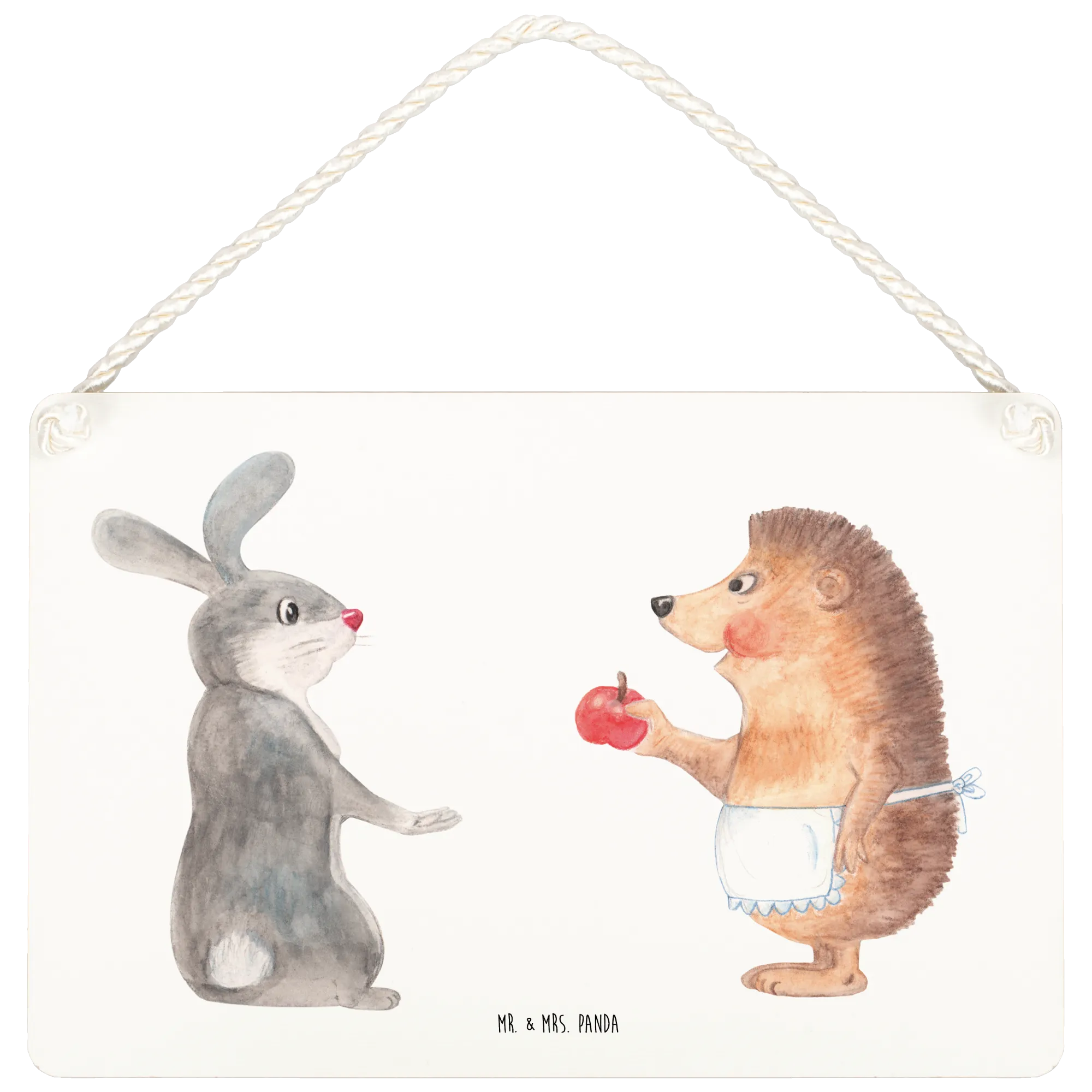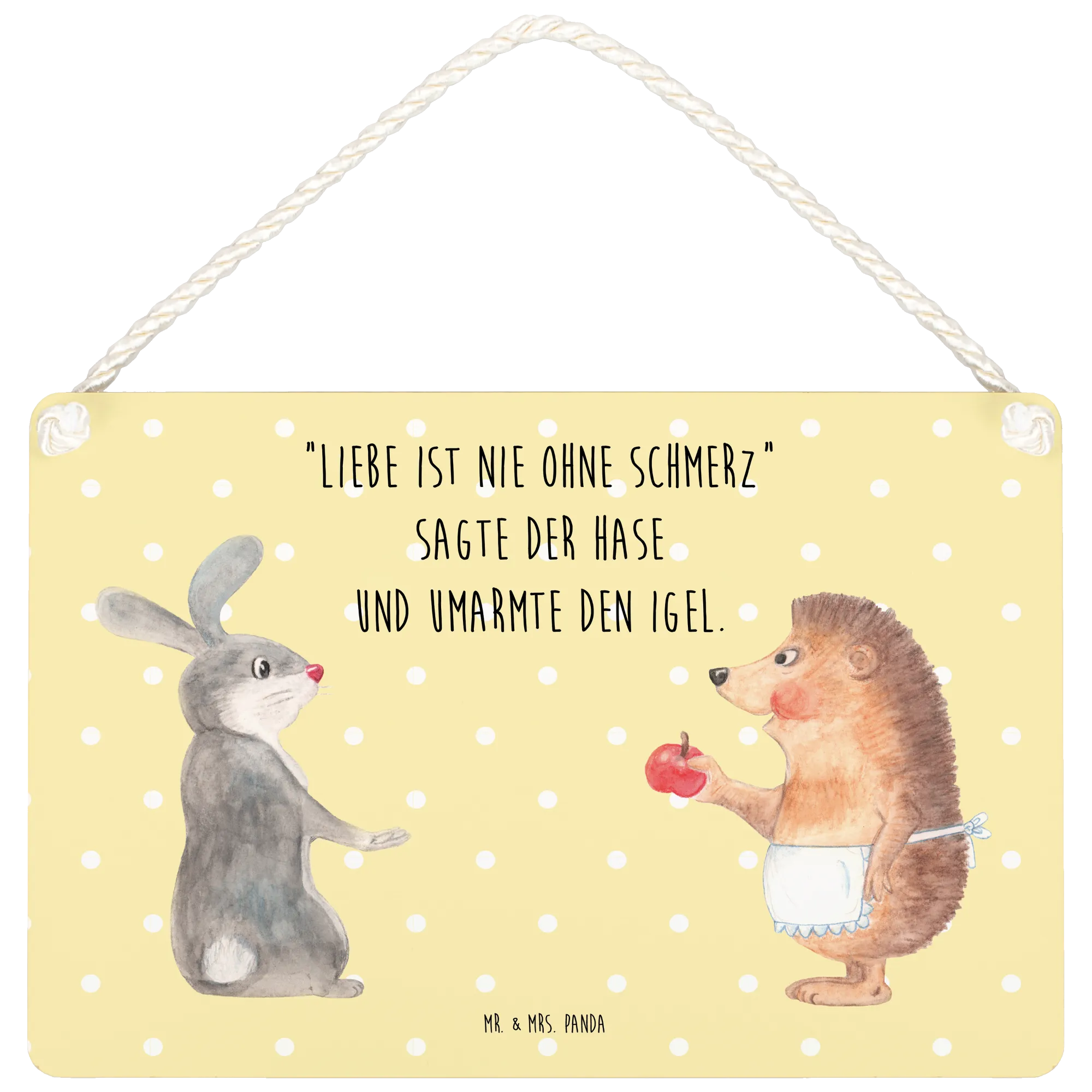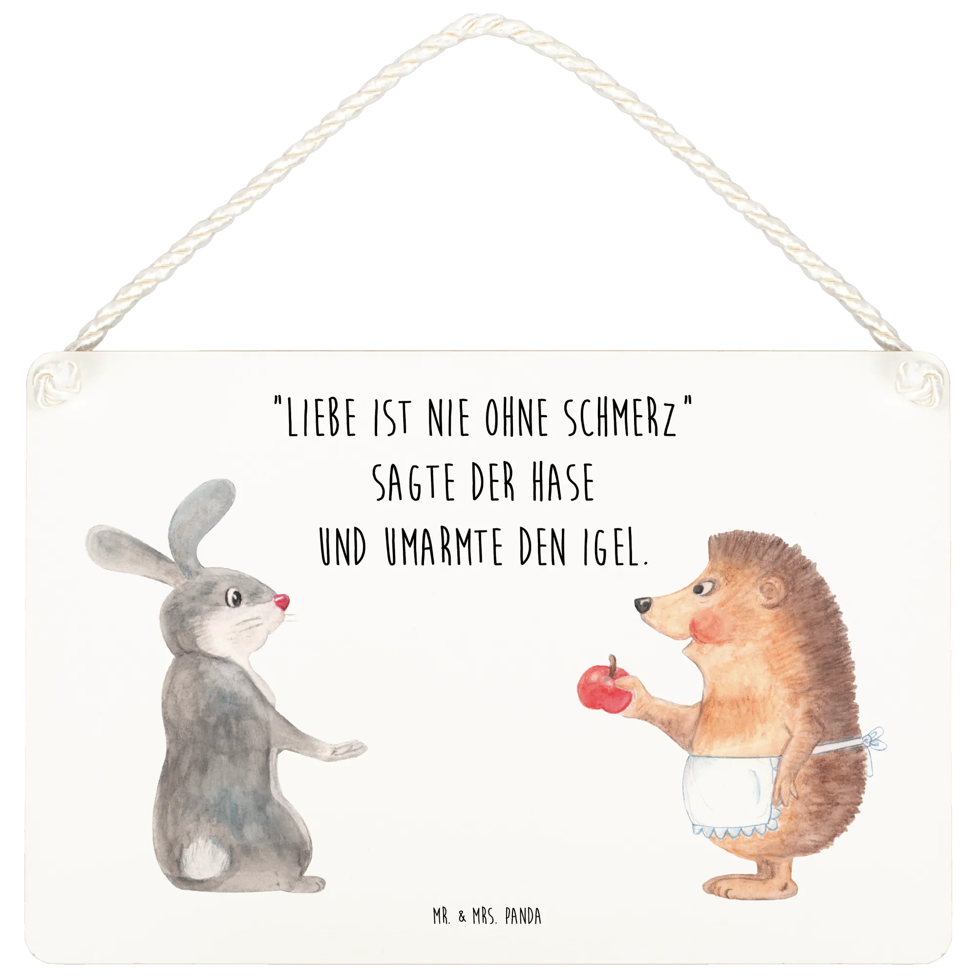 Ein wunderschönes Deko Schild von Mr. & Mrs. Panda, das mit einem zauberhaften Motiv und dem Spruch "Liebe ist nie ohne Schmerz, sagte der Hase und umarmte den Igel" verziert ist. Dieses Schild zeigt die süßen Charaktere eines Hasen und eines Igels, die mit viel Liebe zueinander stehen.