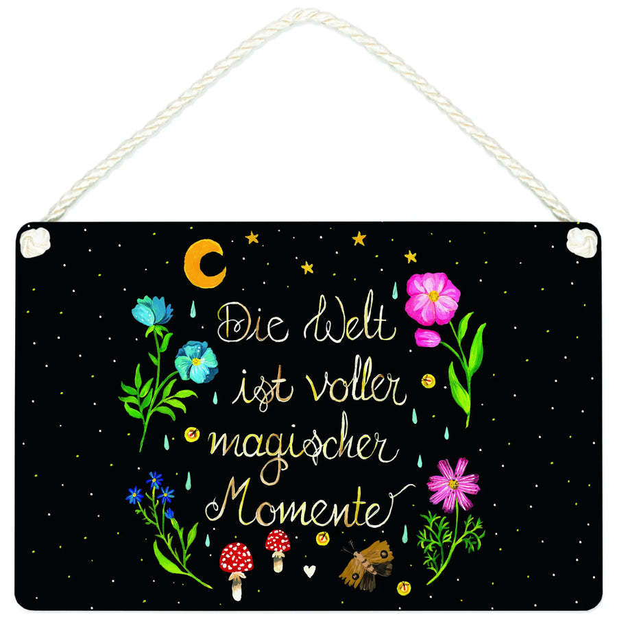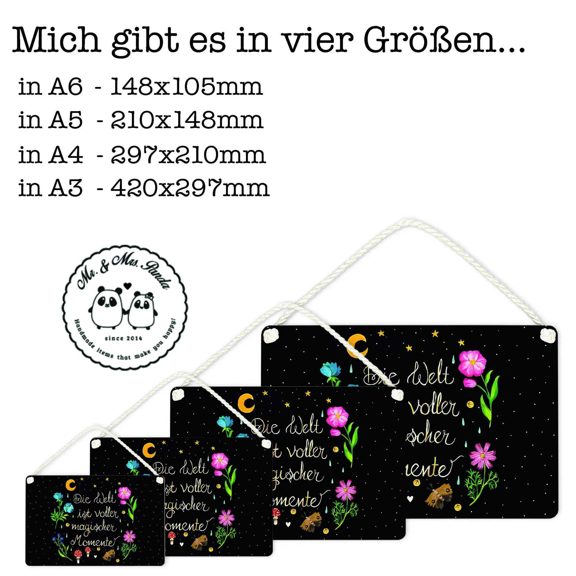 Das Motiv „Magische Welt“ ist von Mrs. Panda von Hand gezeichnet und erinnert daran, im Alltag die kleinen Wunder zu entdecken. Ob als Küchenschild über der Teeecke, als Badschild für entspannte Momente oder als freundliches Türschild Familie im Eingangsbereich – dieses Schild mit Spruch schenkt gute Laune und Geborgenheit.