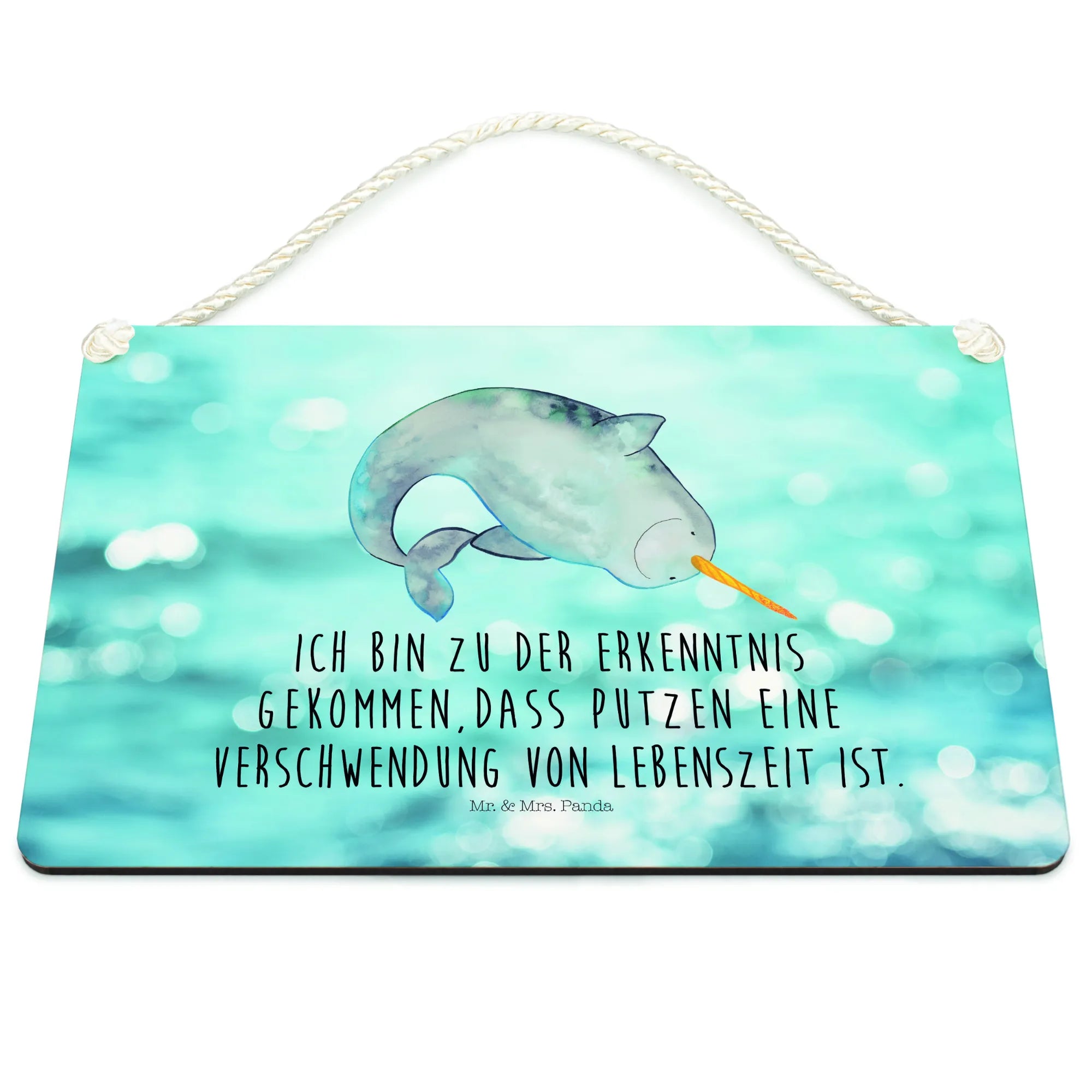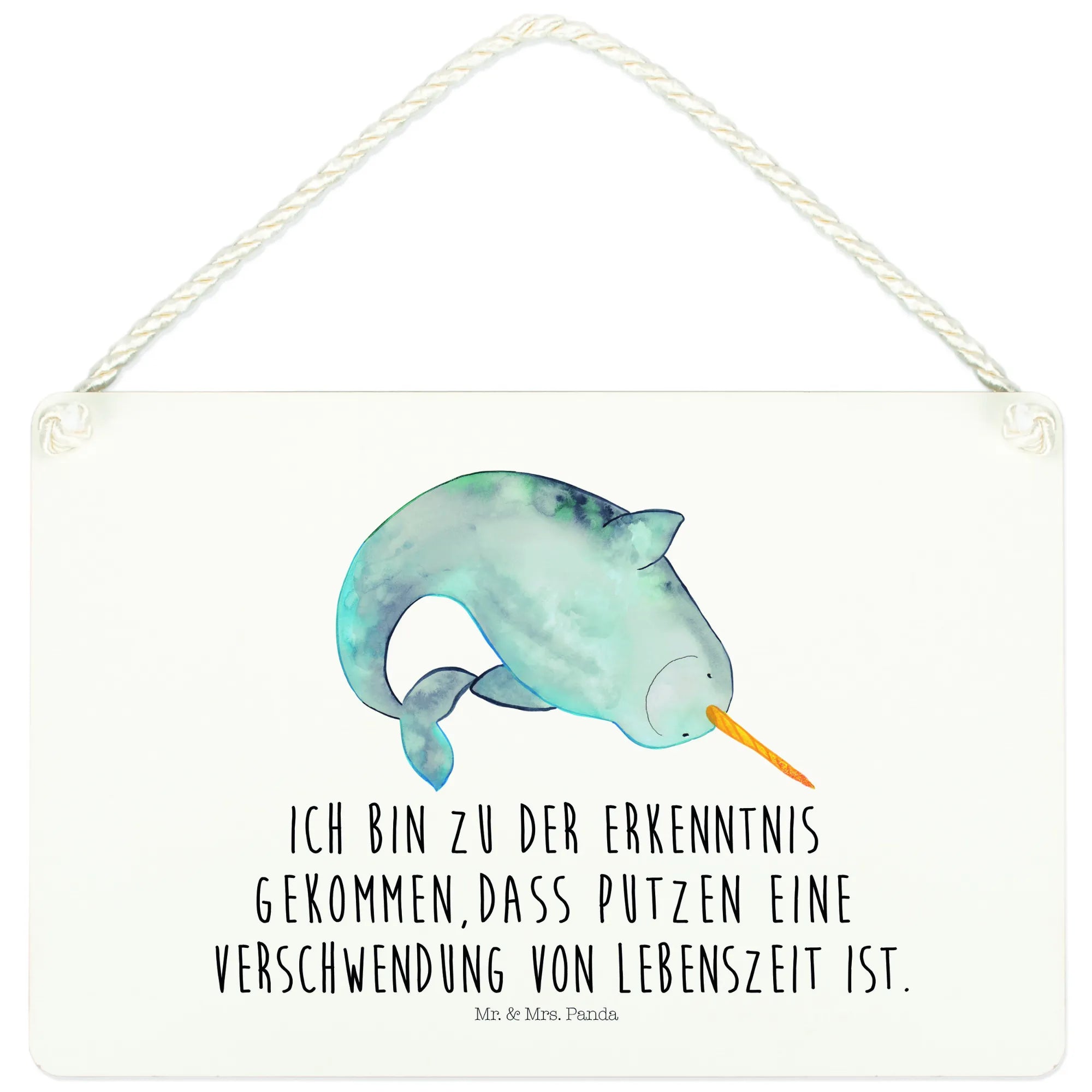 Das zauberhafte Deko Schild mit dem liebevollen Narwal-Motiv aus der Meerestiere Kollektion von Mr. & Mrs. Panda ist die perfekte Bereicherung für dein Zuhause. Mit seinem charmanten Design und dem witzigen Slogan "Ich bin zu der Erkenntnis gekommen, dass Putzen eine Verschwendung von Lebenszeit ist" bringt es nicht nur Freude, sondern auch einen Hauch von Humor in den Alltag.