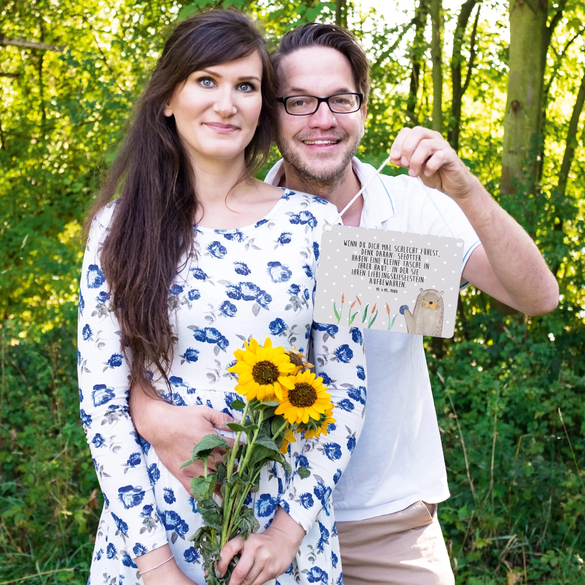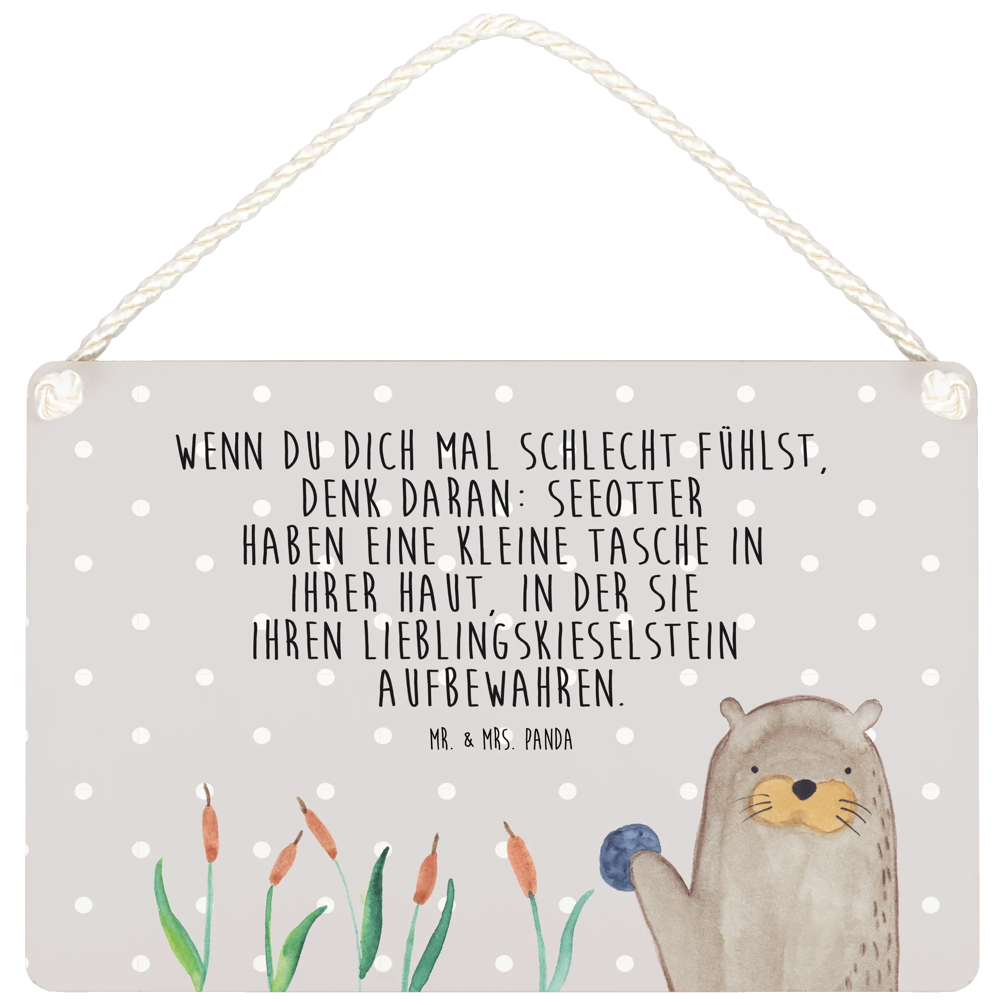 Ein kleines Kunstwerk für dein Zuhause: Unser Deko Schild "Otter mit Stein" aus der Otter - Kollektion von Mr. & Mrs. Panda bringt Wärme, Humor und ein liebevolles Motiv in deinen Alltag. Der fröhliche Seeotter hält seinen Lieblingskieselstein hoch und erinnert dich mit dem Spruch „Wenn du dich mal schlecht fühlst, denk daran: Seeotter haben eine kleine Tasche in ihrer Haut, in der sie ihren Lieblingskieselstein aufbewahren.“ an die kleinen Dinge, die wichtig sind.