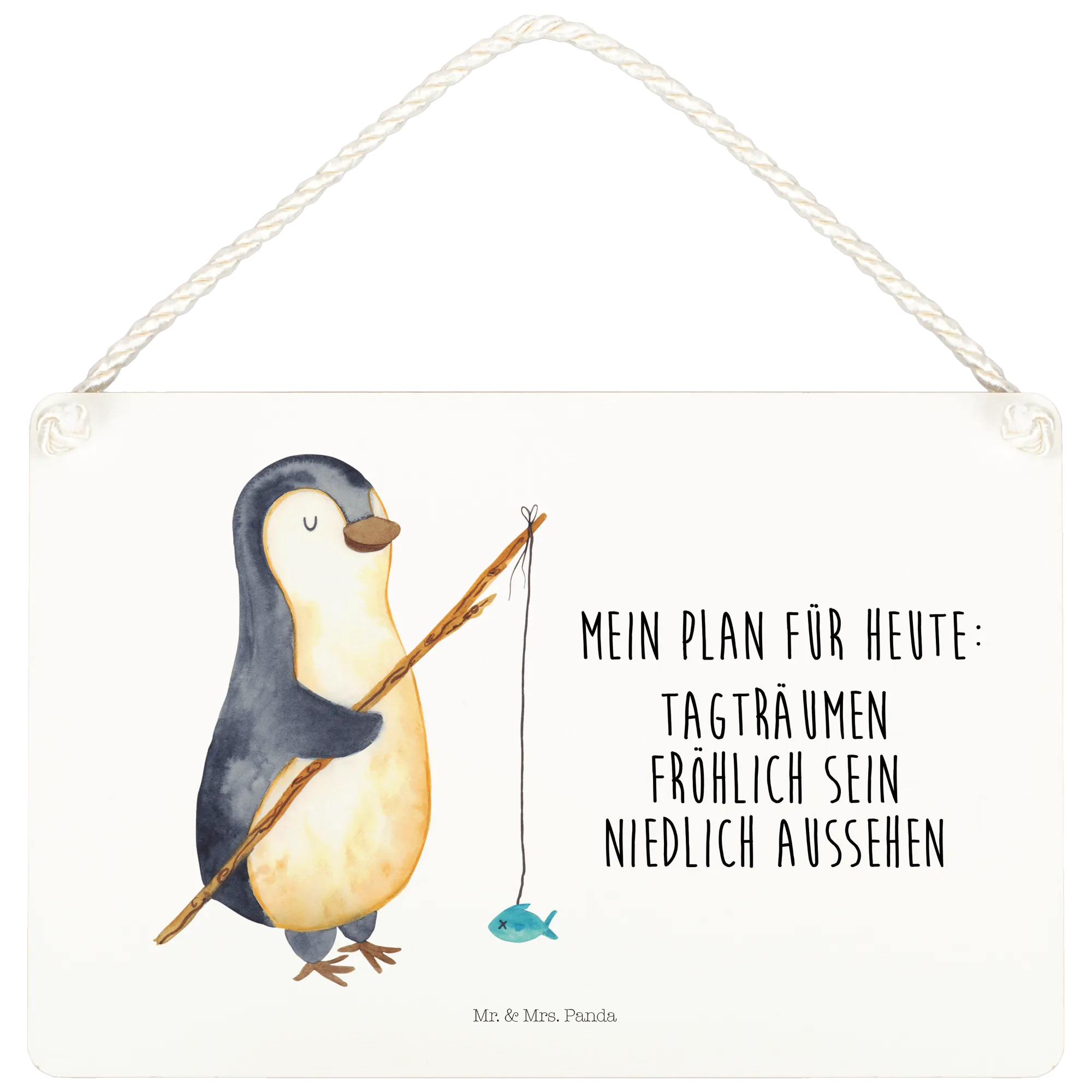 Mit dem zarten Aquarell-Motiv eines fröhlichen Pinguins, der mit seiner Angel auf den nächsten Fisch wartet, zaubert dieses Schild sofort ein Lächeln in dein Gesicht. Mit dem Spruch "Mein Plan für heute: Tagträumen, fröhlich sein & niedlich aussehen" wird es nicht nur zu einem echten Hingucker in deiner Wohnung, sondern erinnert dich auch daran, dass jeder Tag etwas Magisches bereithält.