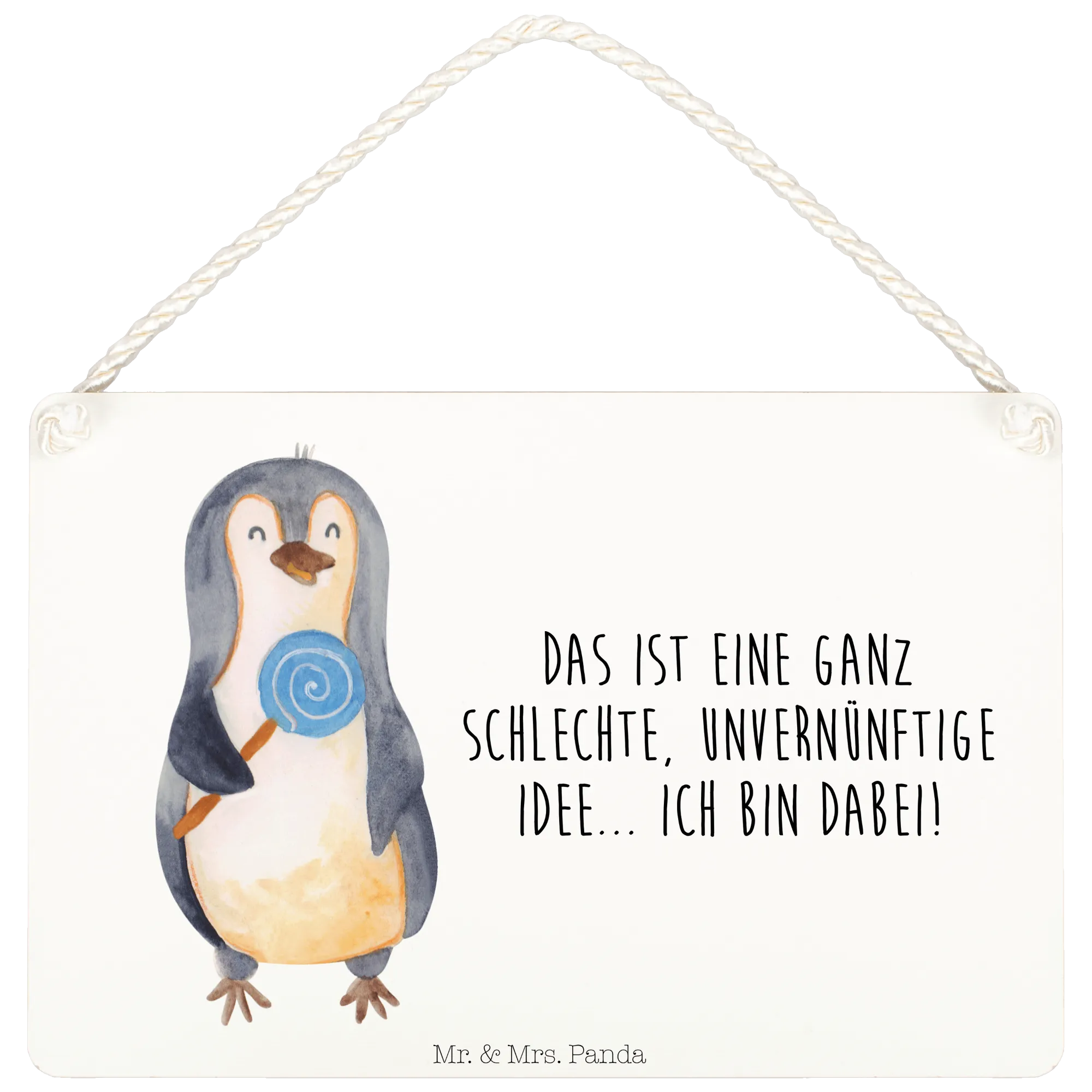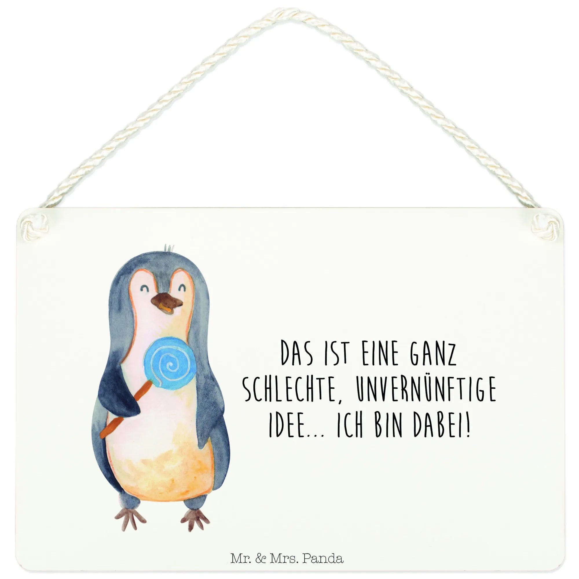 Der Spruch „Das ist eine ganz schlechte, unvernünftige Idee... Ich bin dabei!“ sorgt zusätzlich für eine witzige Note und spricht die Rebellseele in uns allen an. Jedes Mal, wenn du dein Schild anschaust, wird dich der Pinguin mit seinem zuckersüßen Lolli daran erinnern, das Leben mit einem Augenzwinkern zu nehmen und auch mal unvernünftig zu sein.