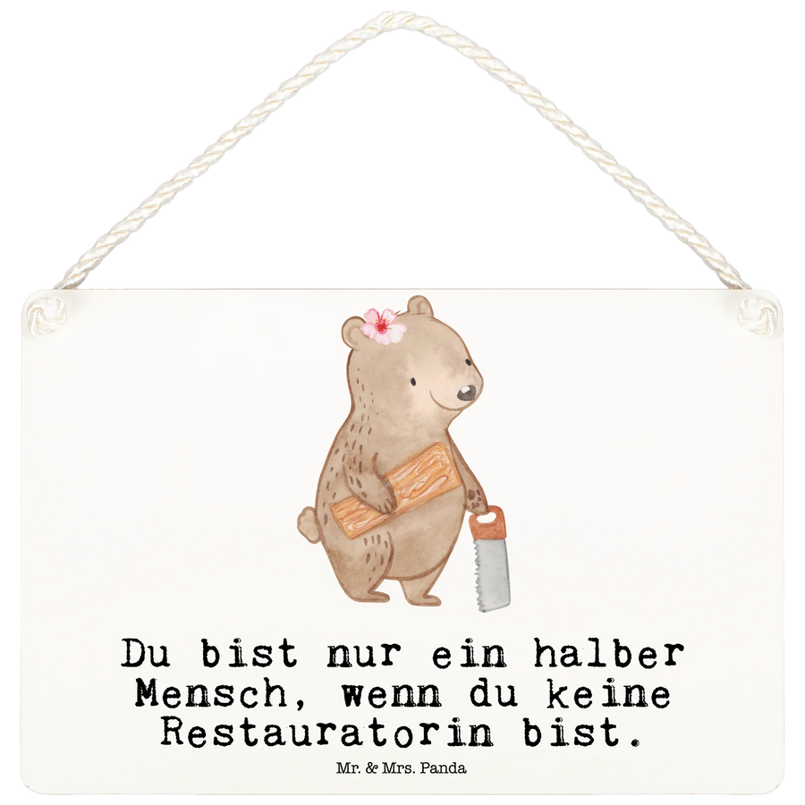 Mit dem liebevoll handgezeichneten Motiv eines süßen, weiblichen Bären, der eine Säge hält, ist es nicht nur ein Blickfang, sondern auch eine wunderbare Möglichkeit, Wertschätzung zu zeigen. Der eingängige Spruch "Du bist nur ein halber Mensch, wenn du keine Restauratorin bist" sorgt für Schmunzeln und macht das Schild zu einem perfekten Gesprächsthema.