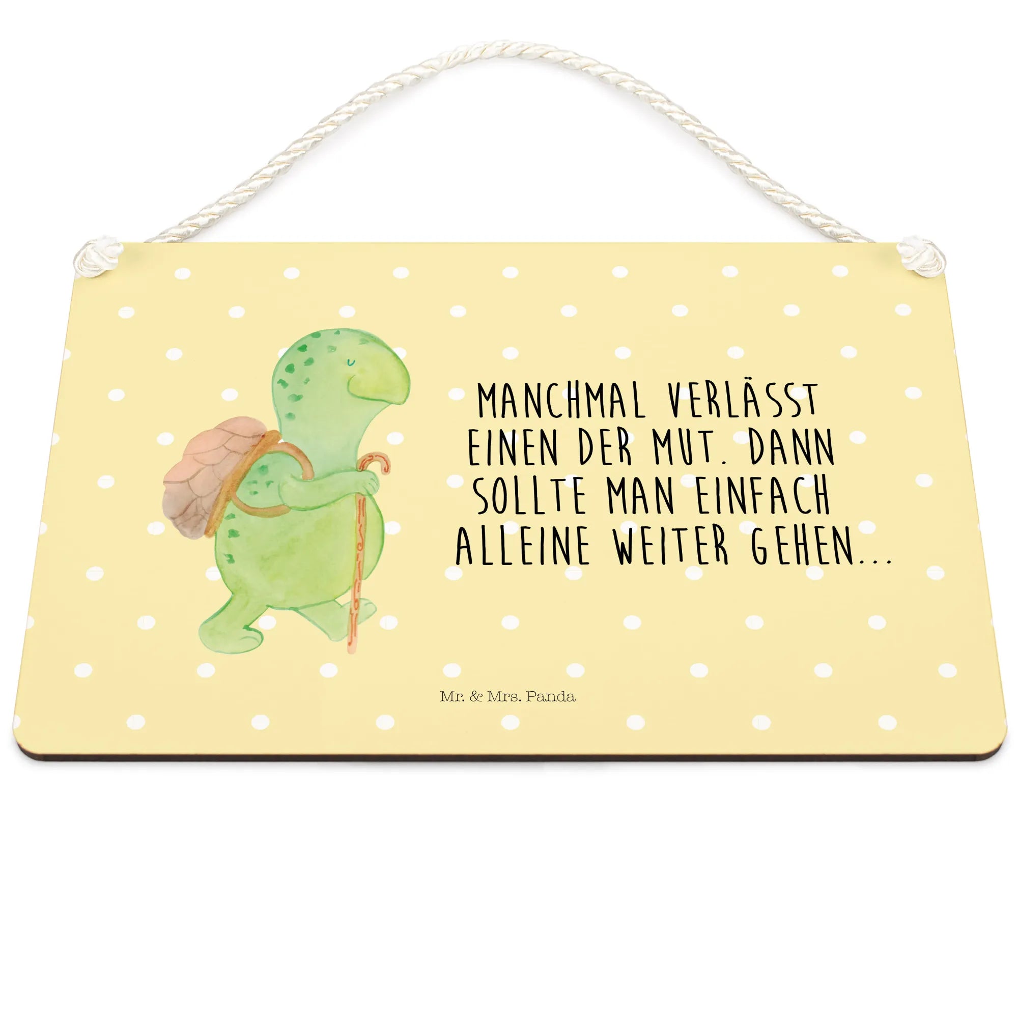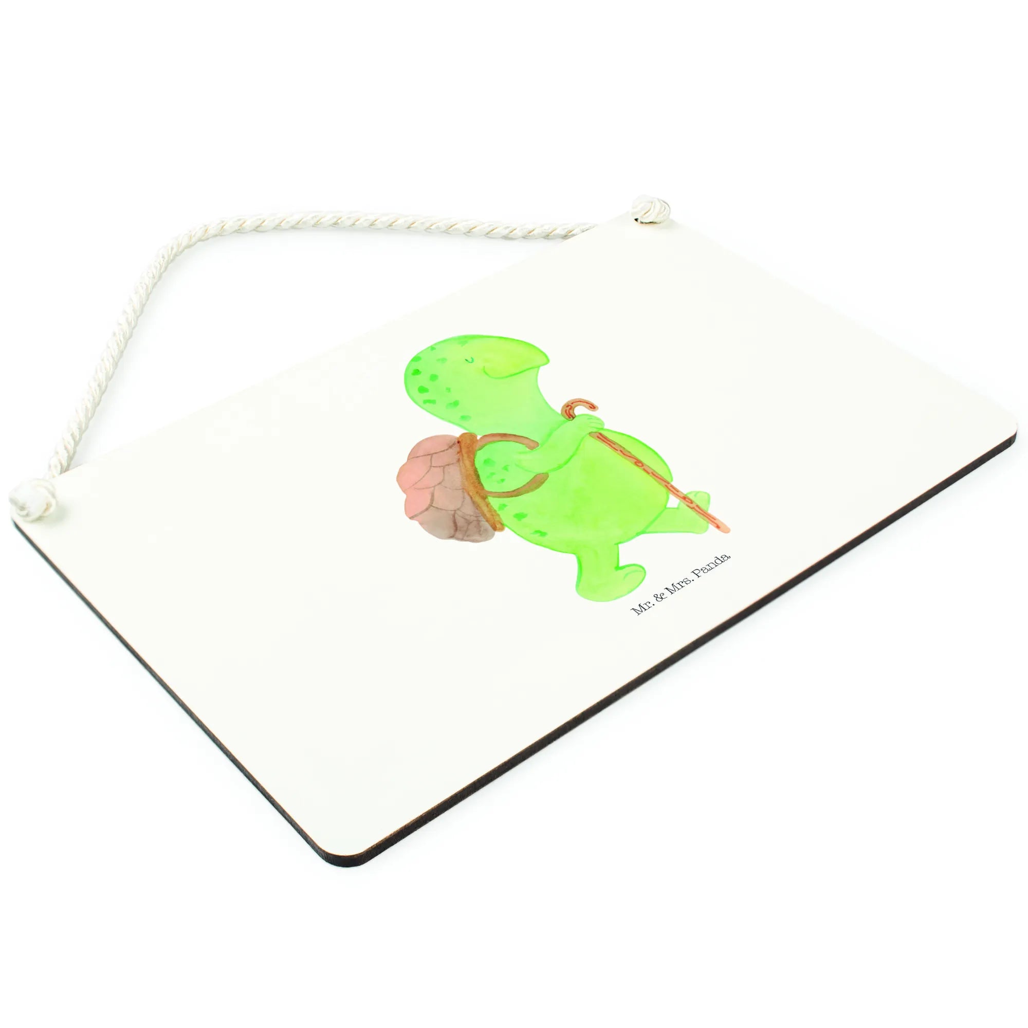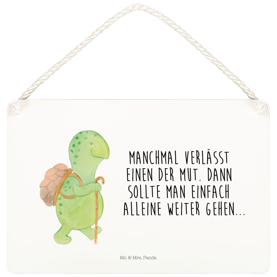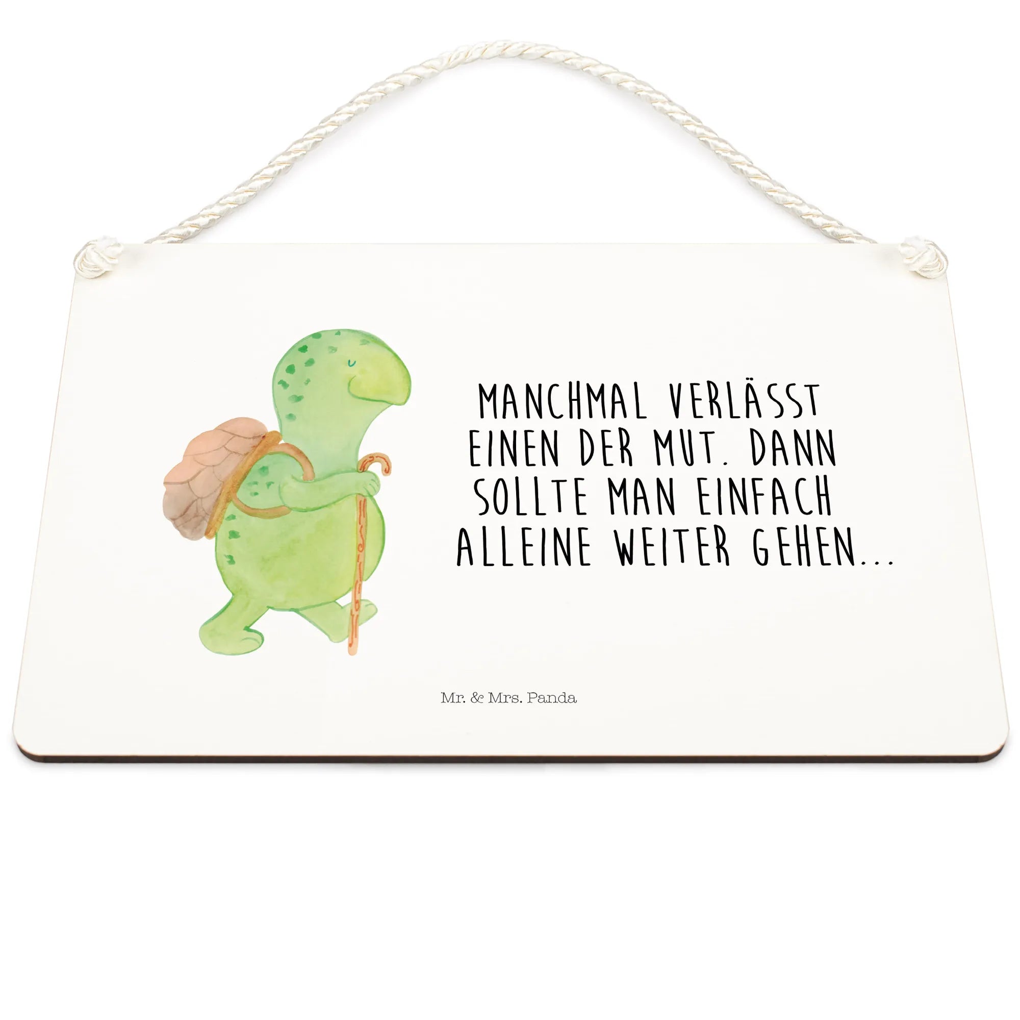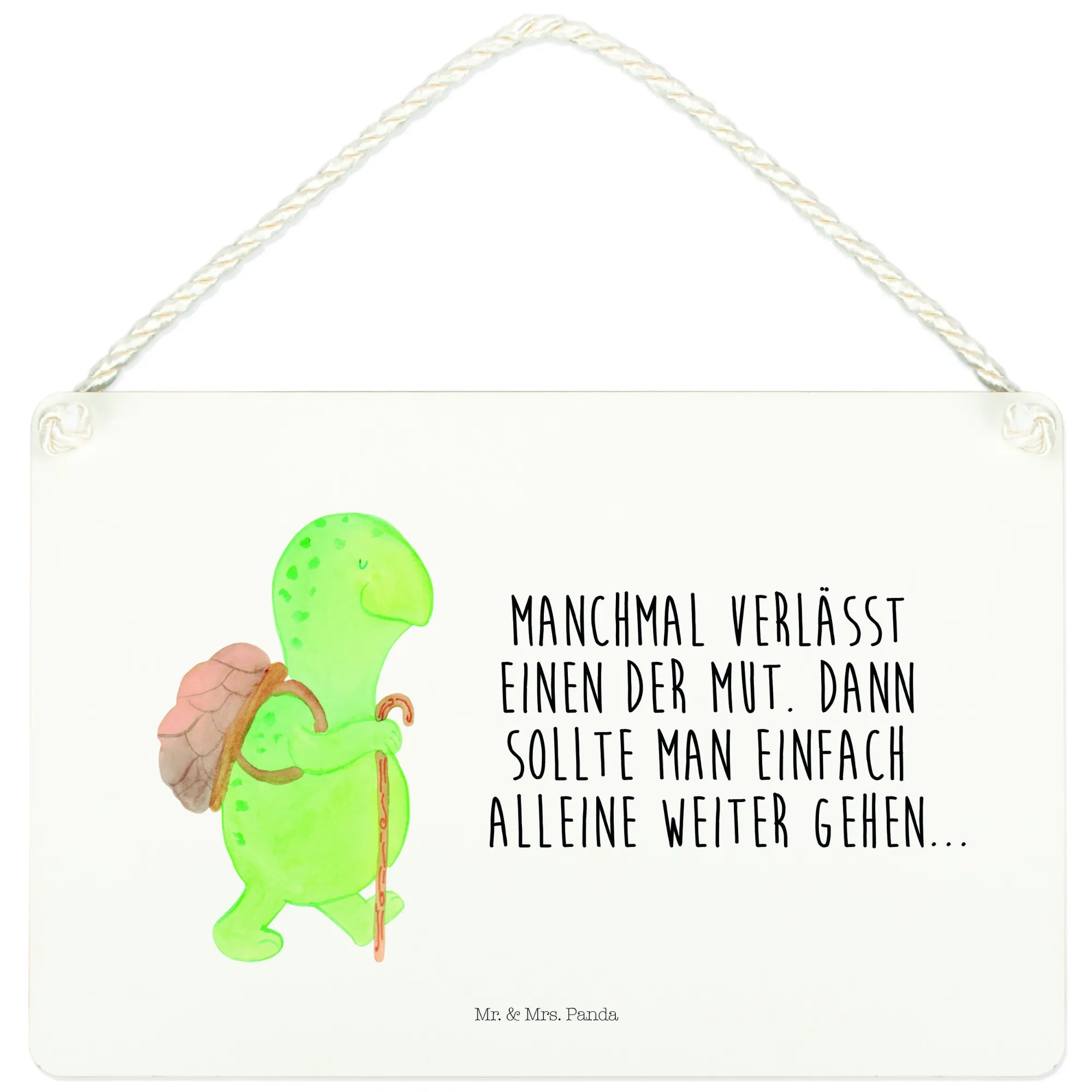 Das wunderschöne Deko Schild Schildkröte Wanderer von Mr. & Mrs. Panda ist nicht nur ein eye-catcher, sondern auch eine wunderbare Inspiration für all deine Abenteuer. Dieses liebevoll gestaltete Wandschild zeigt eine süße Schildkröte, die ihren Panzer wie einen kleinen Rucksack trägt, während sie mit ihrem Gehstock ganz gemütlich spazieren geht.