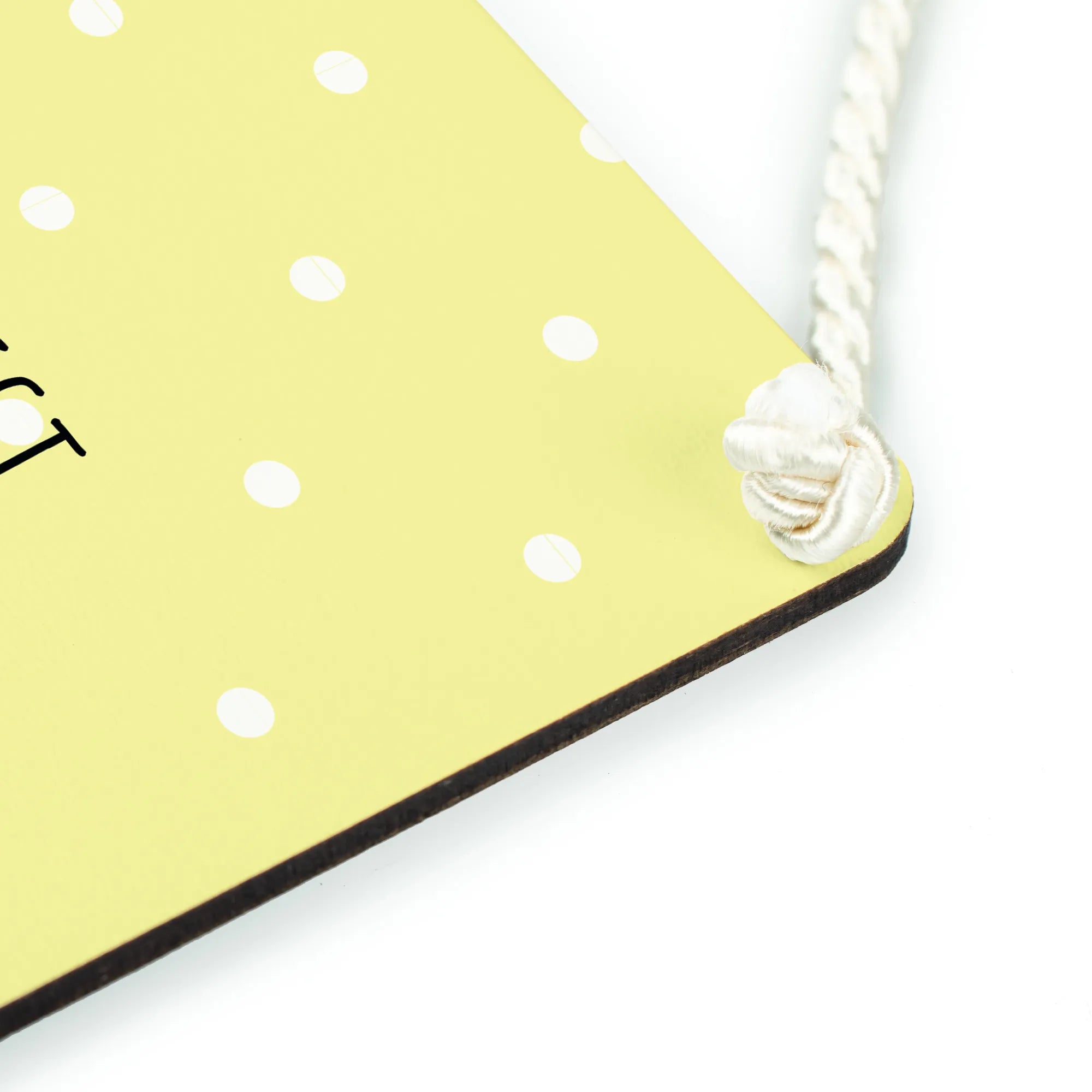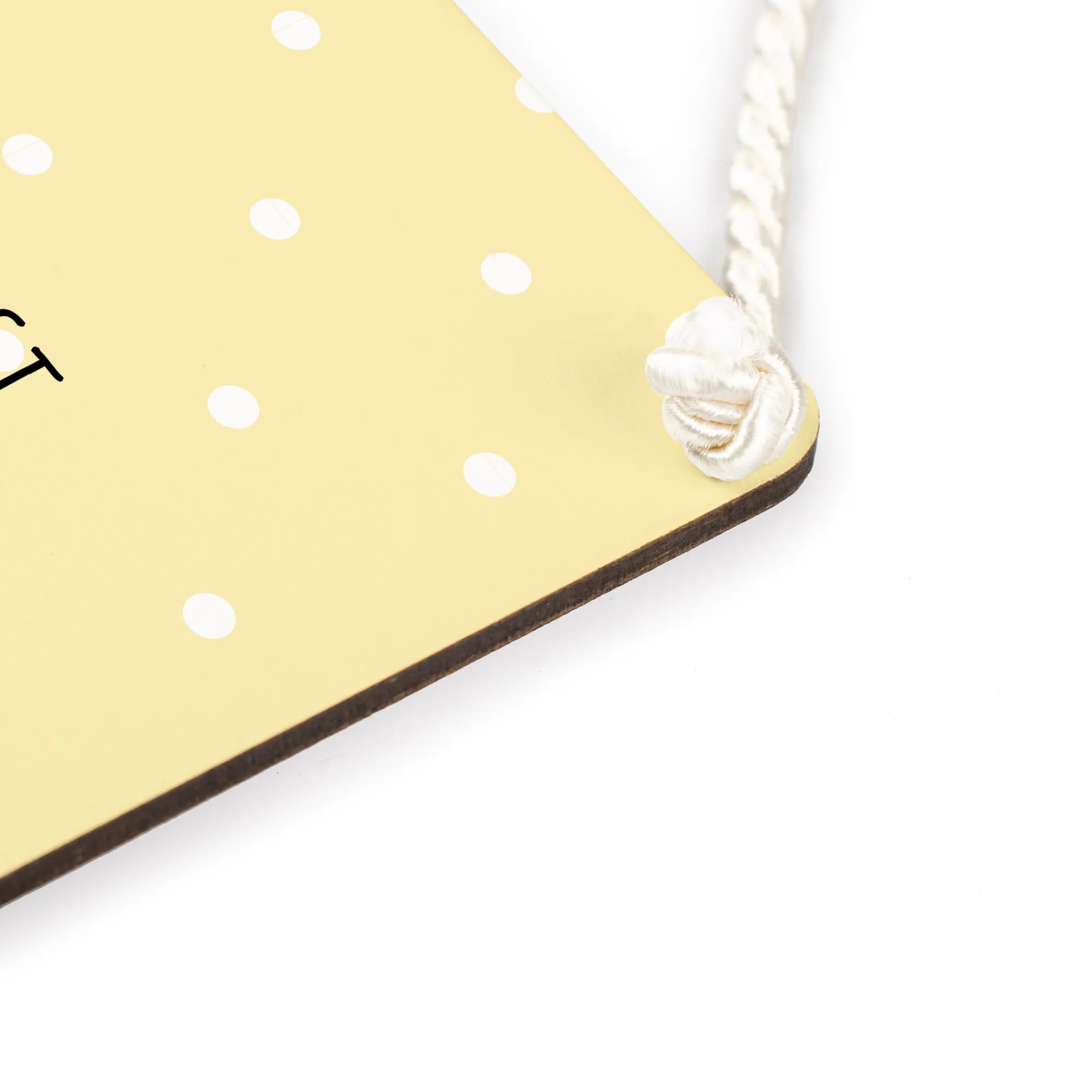 Das Schild misst DIN A5 und ist aus beschichteter Holzfaser gefertigt, was es sowohl robust als auch langlebig macht. Dank der hochwertigen Verarbeitung und dem edlen Druck bleibt es über viele Jahre hinweg ein schöner Blickfang. Verziert mit einer süßen Kordel zur Aufhängung, ist es kinderleicht an der Wand oder an der Tür zu befestigen.