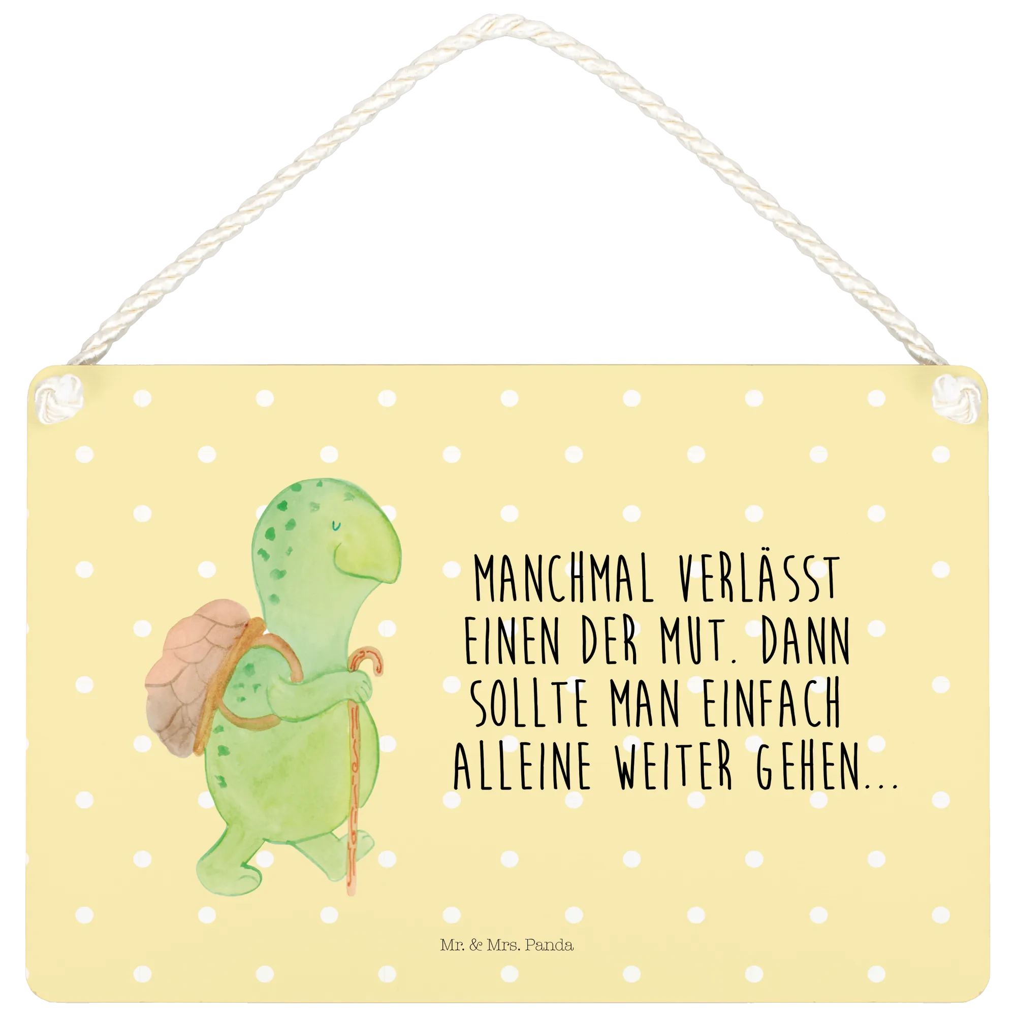 Die Schildkröte symbolisiert Ruhe, Langsamkeit und die Freude am Leben. Mit dem Spruch "Manchmal verlässt einen der Mut. Dann sollte man einfach alleine weiter gehen..." erinnert uns das Schild daran, dass es auch in schwierigen Zeiten wichtig ist, geduldig und mutig zu bleiben.