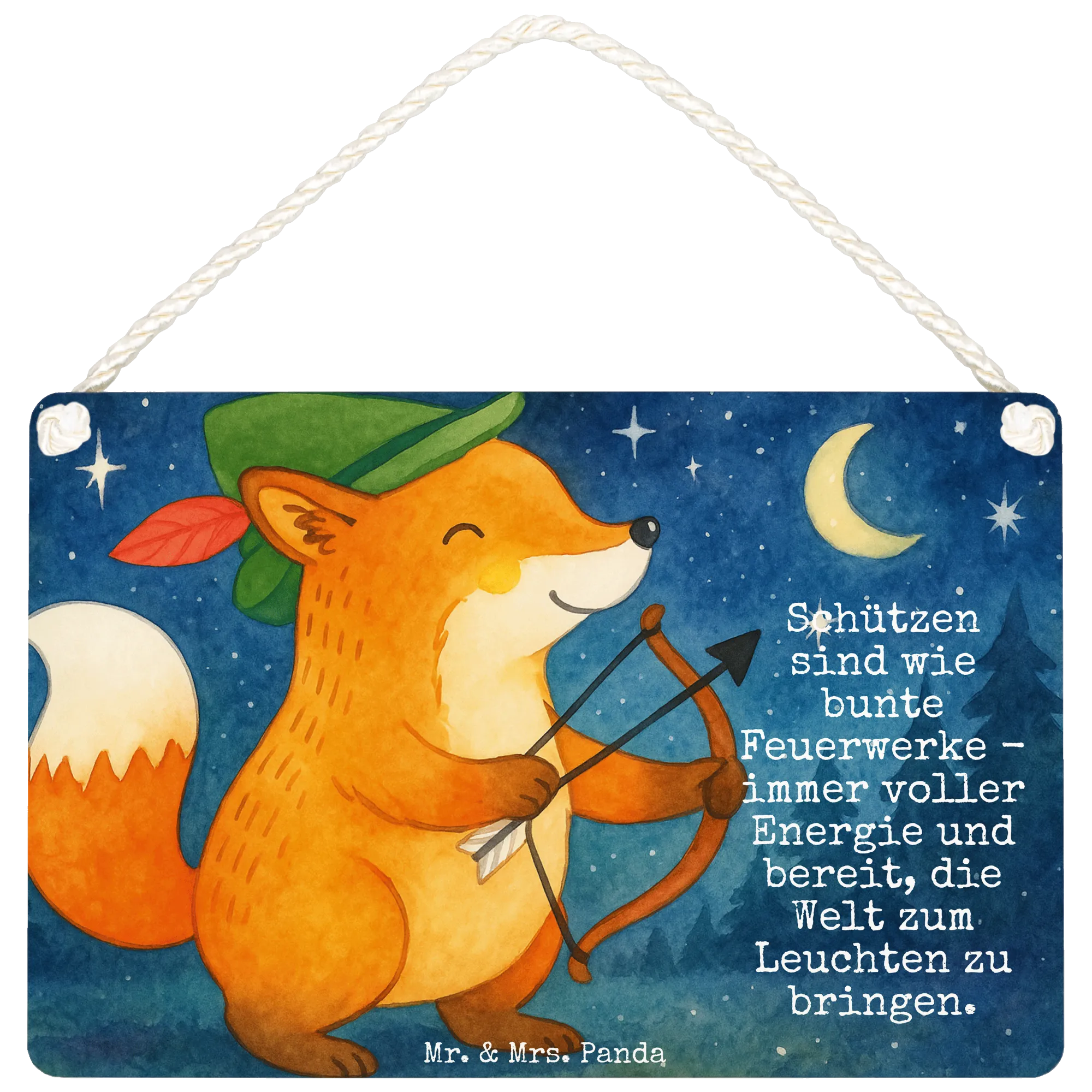 Stell dir vor, du bist ein Schütze, der mit freudigem Lächeln und einem Pfeil in der Hand bereit ist, neue Wege zu erkunden. Auf unserem Motiv verkörpert ein orange-brauner Fuchs diesen Entdeckergeist inmitten seines abenteuerlichen Lebens. Der stilvolle grüne Hut mit der roten Feder verleiht dem Fuchs eine charmante Note. Dieser fabelhafte Fuchs, der aussieht, als könnte er gleich loslegen, hält die Lebensfreude in Person. Das Motiv ist mit warmen Farben gestaltet, die sofort gute Laune verbreiten und die Energie des Schützen widerspiegeln. Unser Spruch: "Schützen sind wie bunte Feuerwerke - immer voller Energie und bereit, die Welt zum Leuchten zu bringen!" fasst zusammen, was das Wesen des Schützen ausmacht. Ihr seid die Lebenskünstler, die mit eurem mutigen und fröhlichen Herzen die Welt erhellen.
