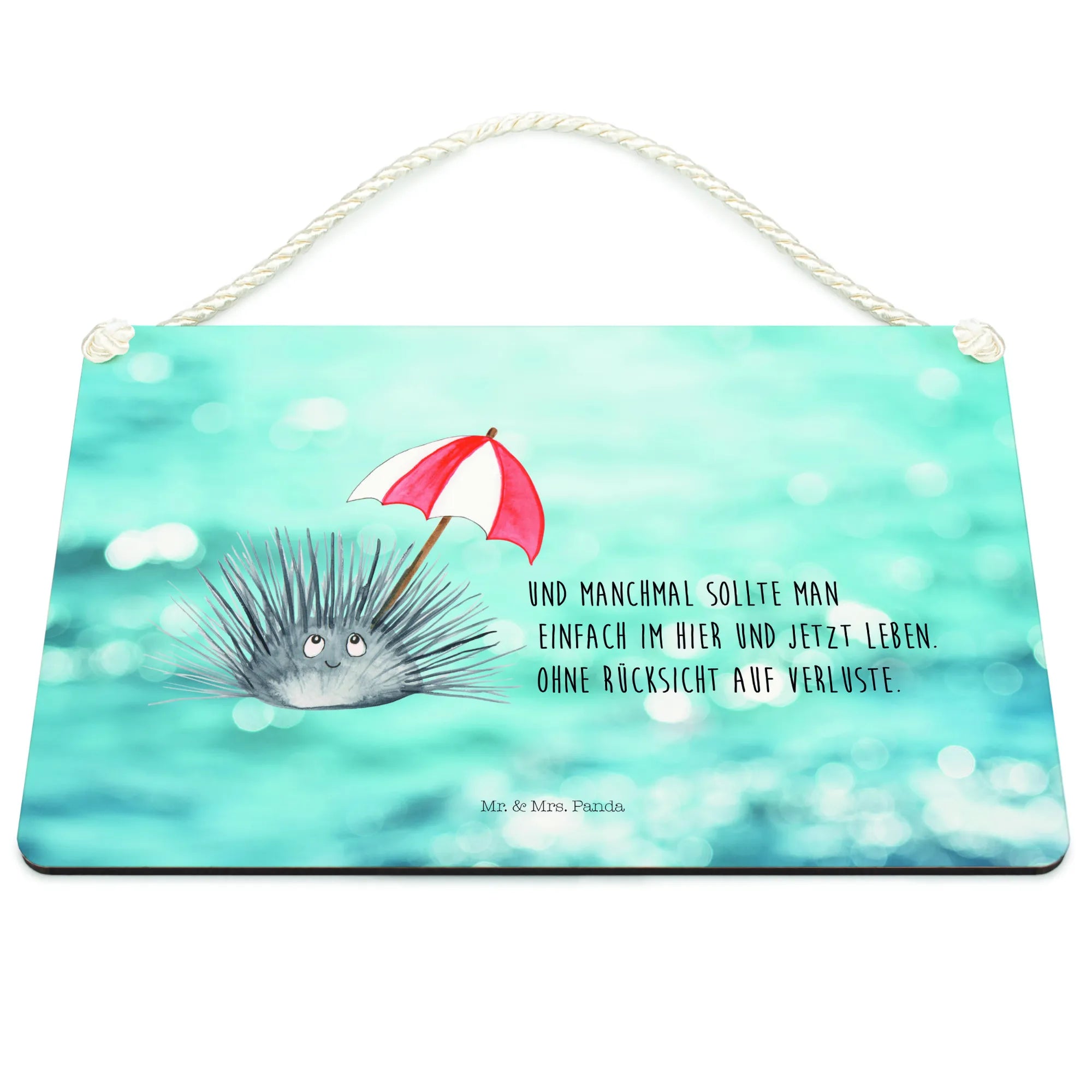 Das Deko Schild mit dem süßen Seeigel-Motiv aus der Meerestiere-Kollektion von Mr. & Mrs. Panda ist der perfekte Begleiter für alle, die das Leben in vollen Zügen genießen und sich an den kleinen Dingen des Lebens erfreuen möchten. Mit dem Spruch „Und manchmal sollte man einfach im Hier und Jetzt leben. Ohne Rücksicht auf Verluste.“ regt es zum Nachdenken an und erinnert uns, wie wichtig es ist, im Moment zu leben. Dieses liebevoll gestaltete Holzschild zeigt einen freundlichen Seeigel mit großen, leuchtenden Augen und einem sanften Lächeln, der einen roten, gestreiften Schirm hält. Die verspielte Verbindung von Motiv und Text macht das Schild zu einer charmanten Dekoration für dein Zuhause.