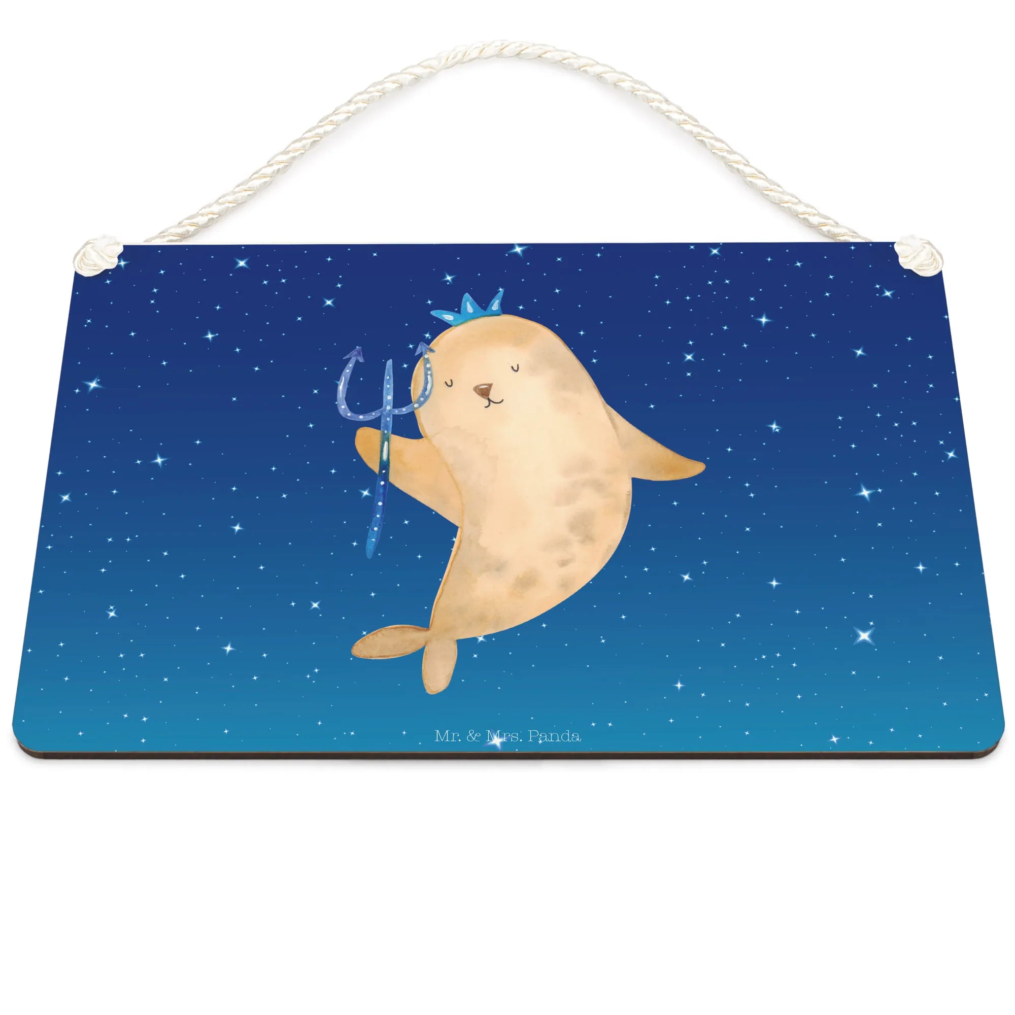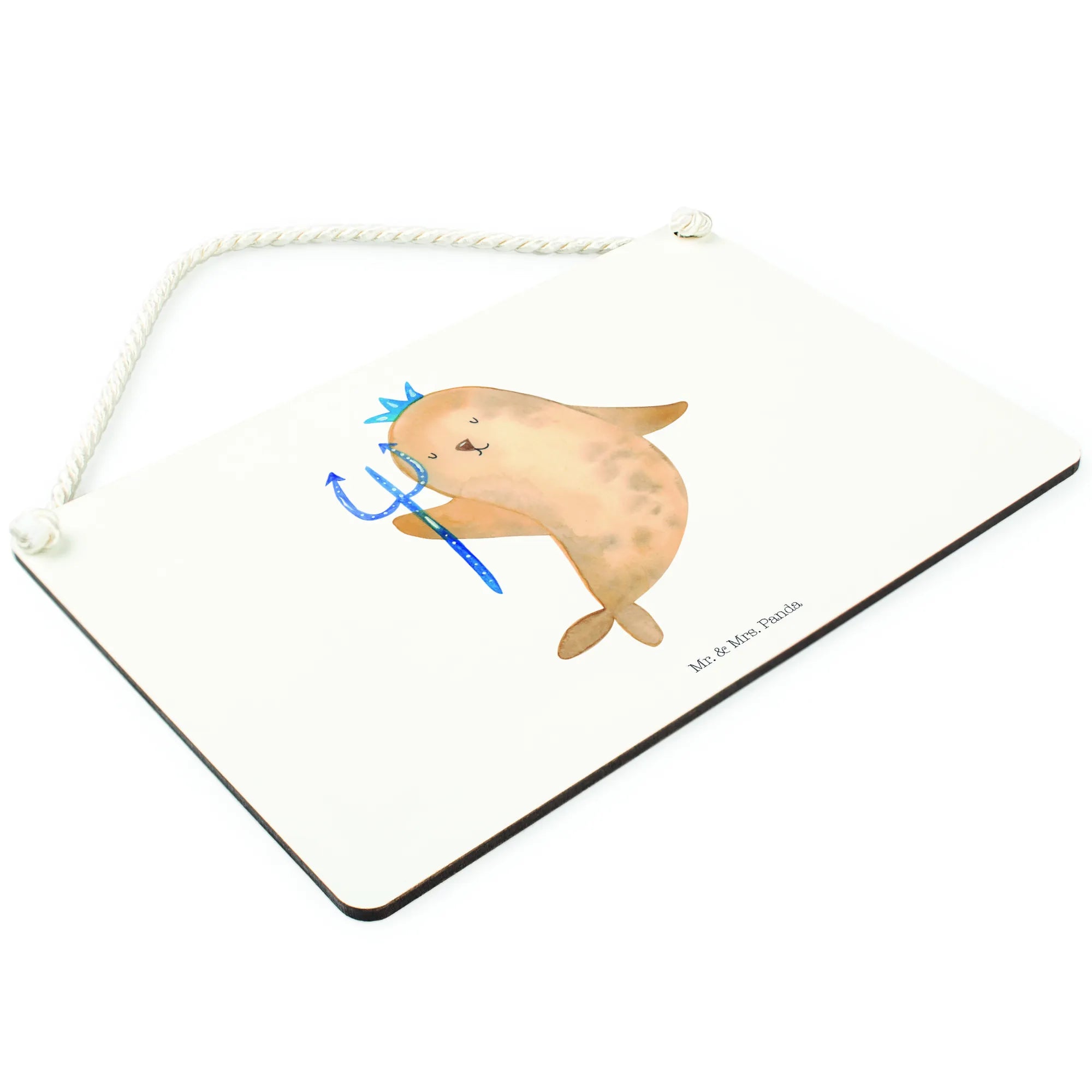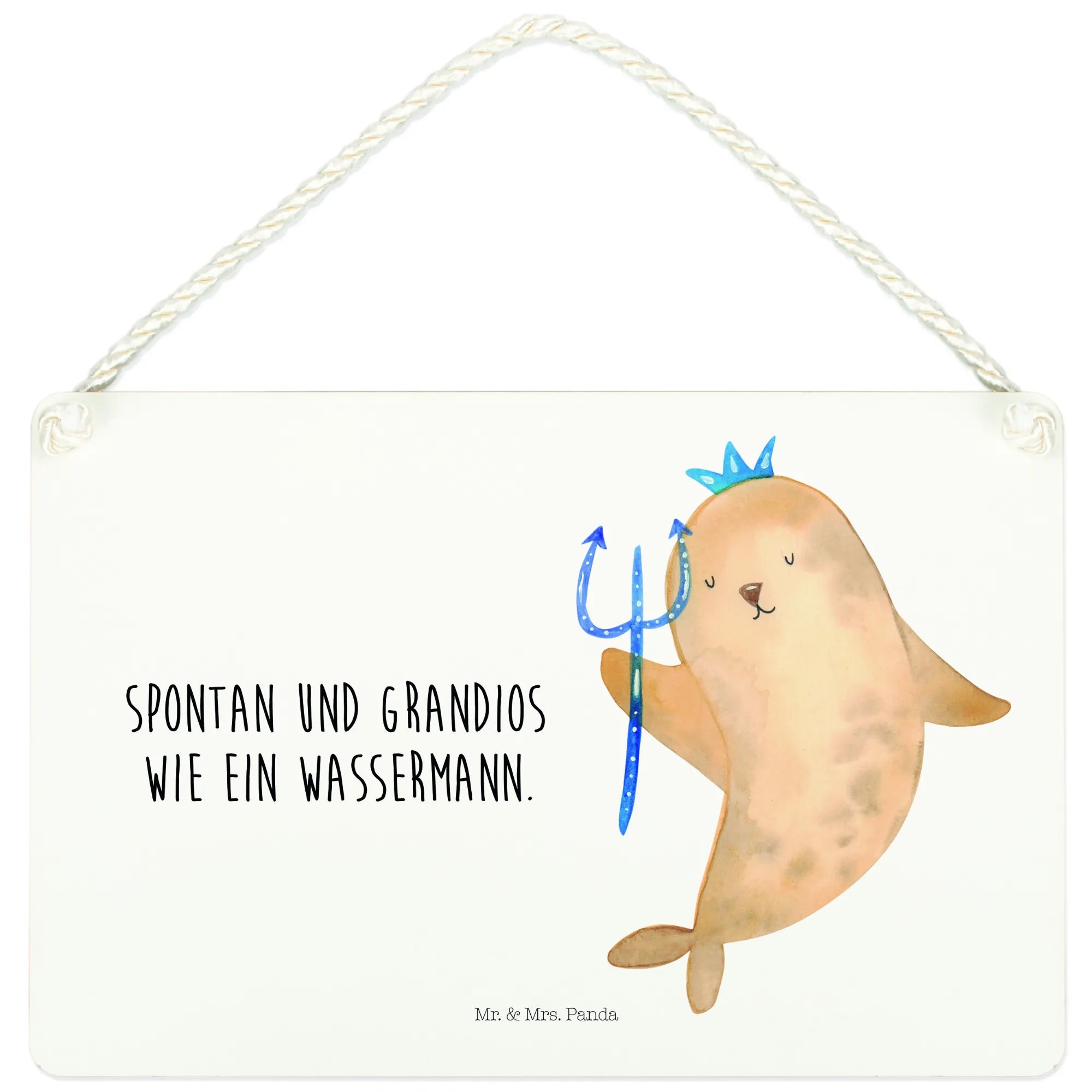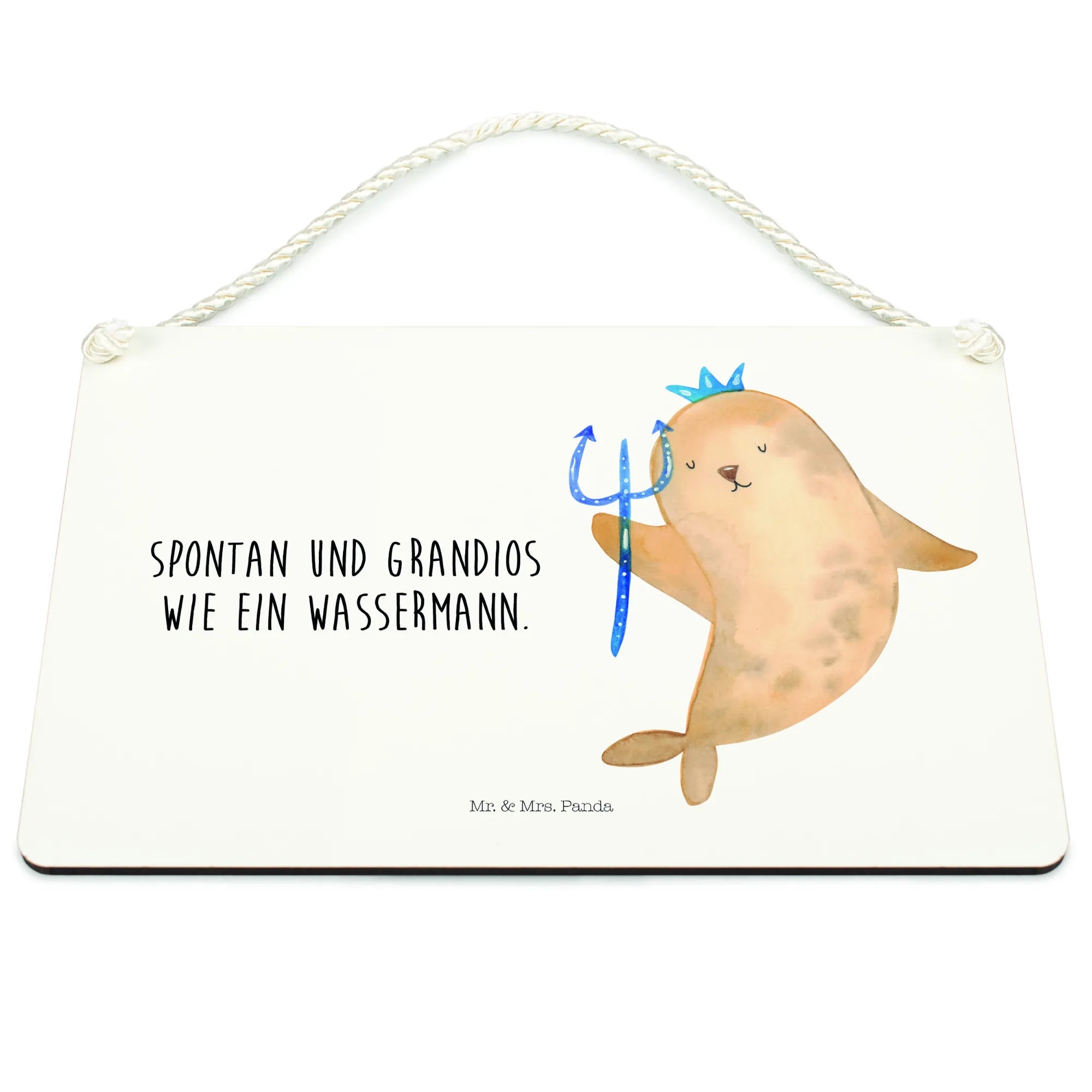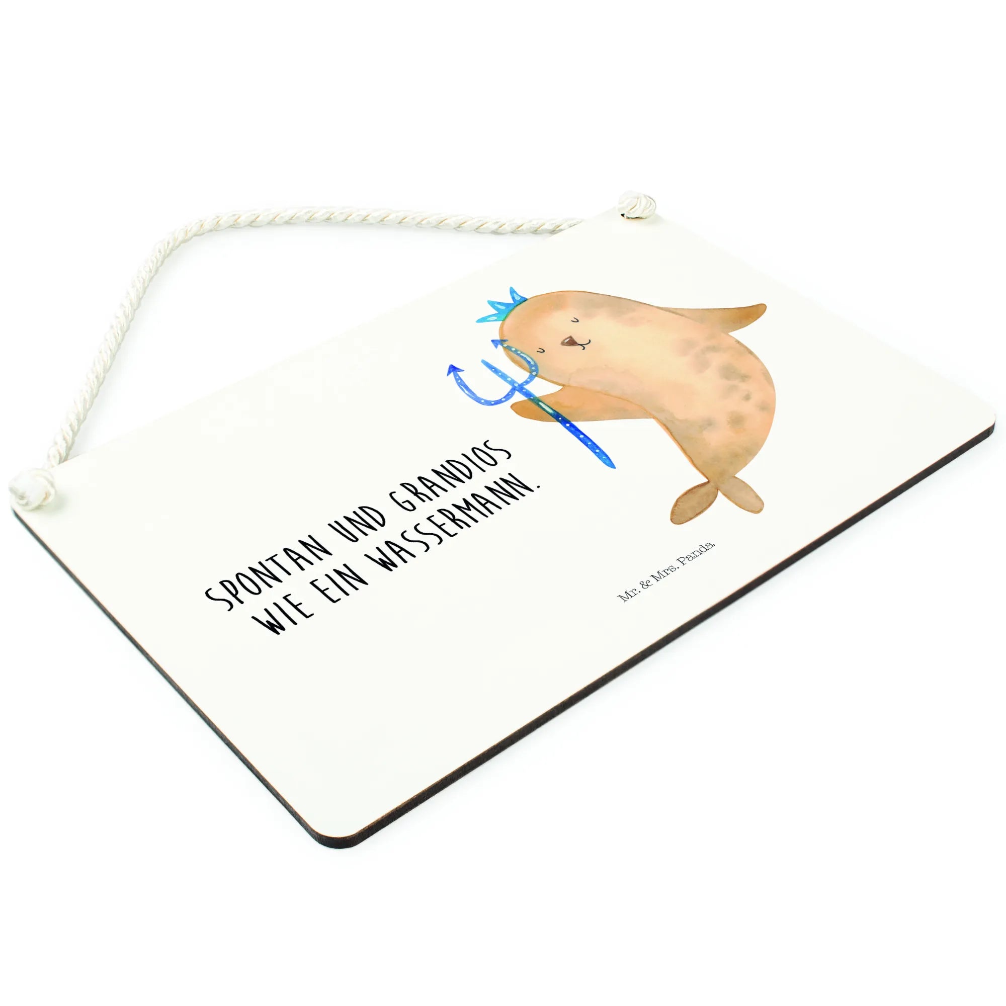 Das Deko Schild Sternzeichen Wassermann von Mr. & Mrs. Panda ist das perfekte Geschenk für alle Wassermänner und Wassermann-Fans! Mit einem niedlichen Motiv, das einen Wassermann mit Dreizack und einer Krone zeigt, bringt es sofort Freude in jedes Zuhause.