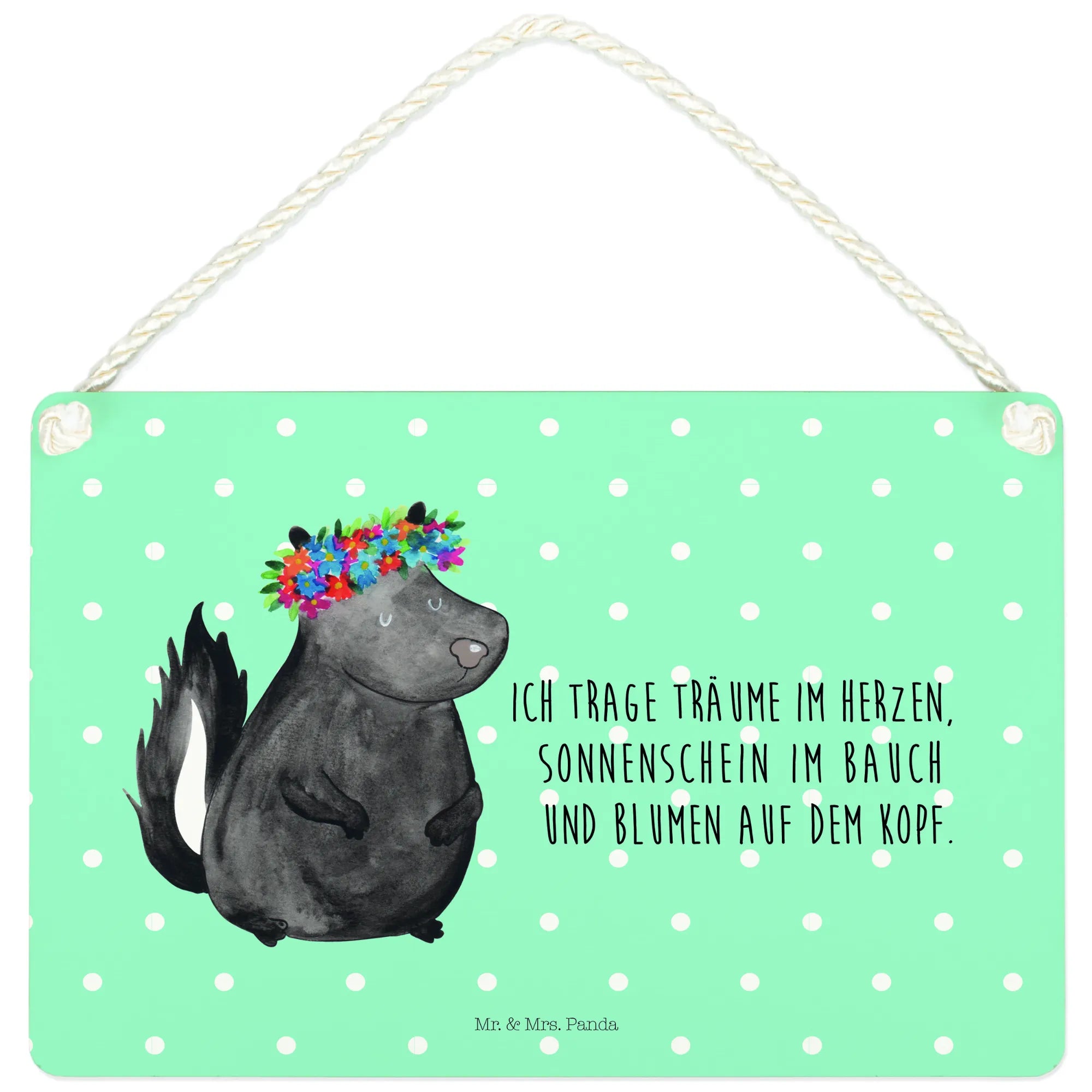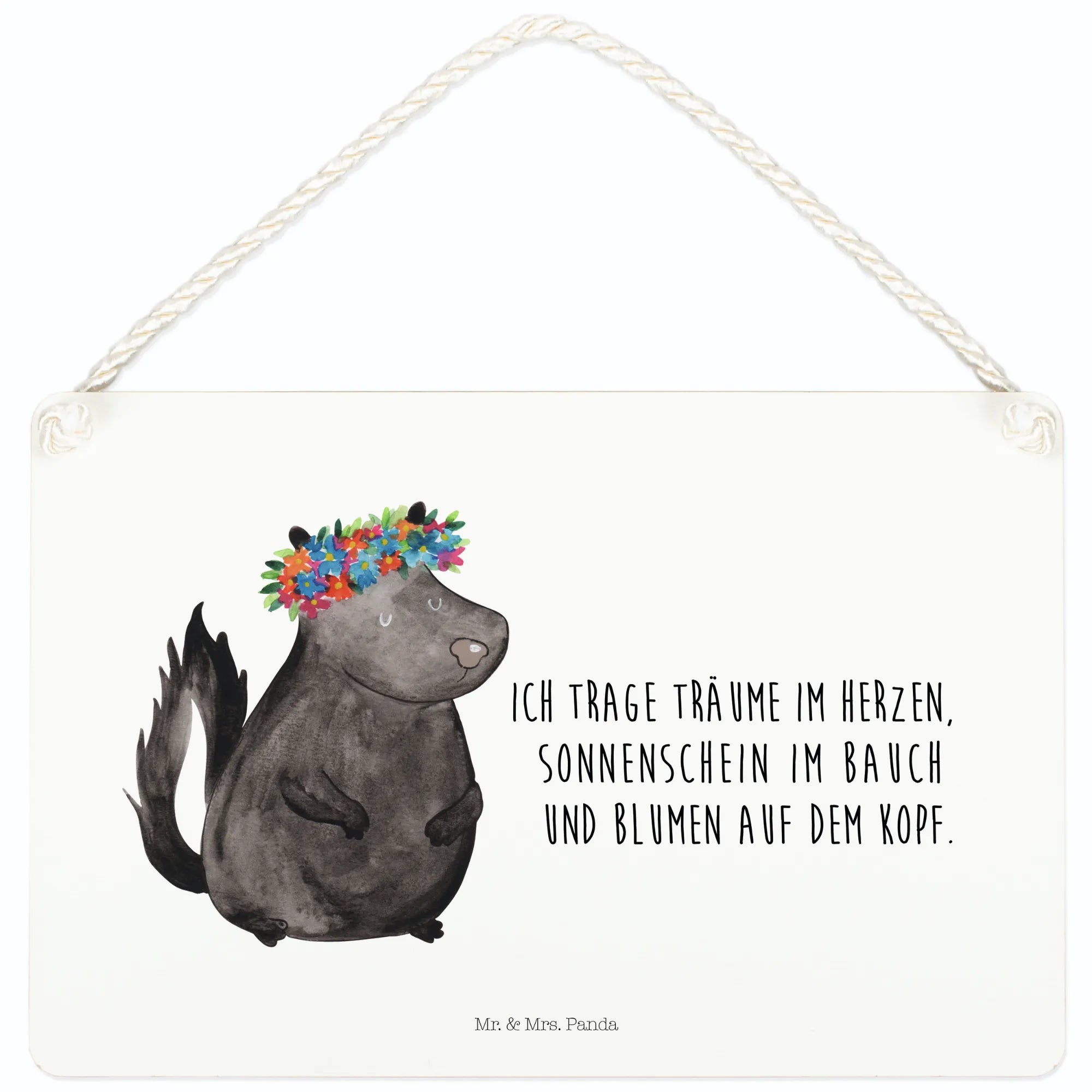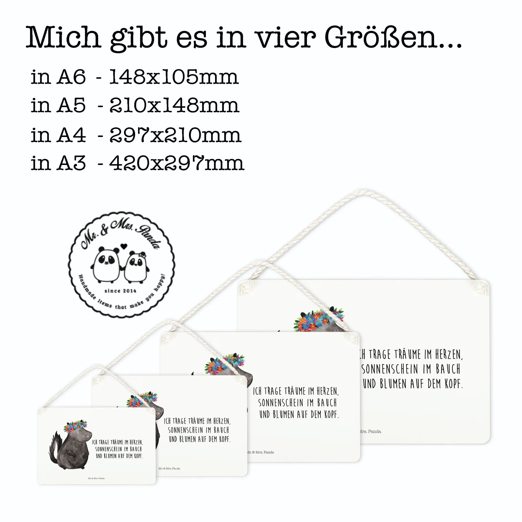 Dieses wunderschöne Schild zeigt ein liebenswertes Stinktier, das mit einem bunten Blumenkranz geschmückt ist, und strahlt Lebensfreude aus. Der Spruch 'Ich trage Träume im Herzen, Sonnenschein im Bauch und Blumen auf dem Kopf.' macht es zu einem zauberhaften Blickfang und einer perfekten Dekoration für dein Zuhause.