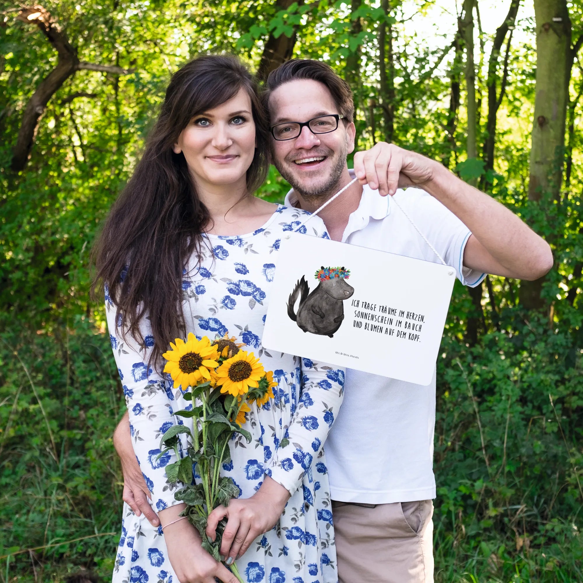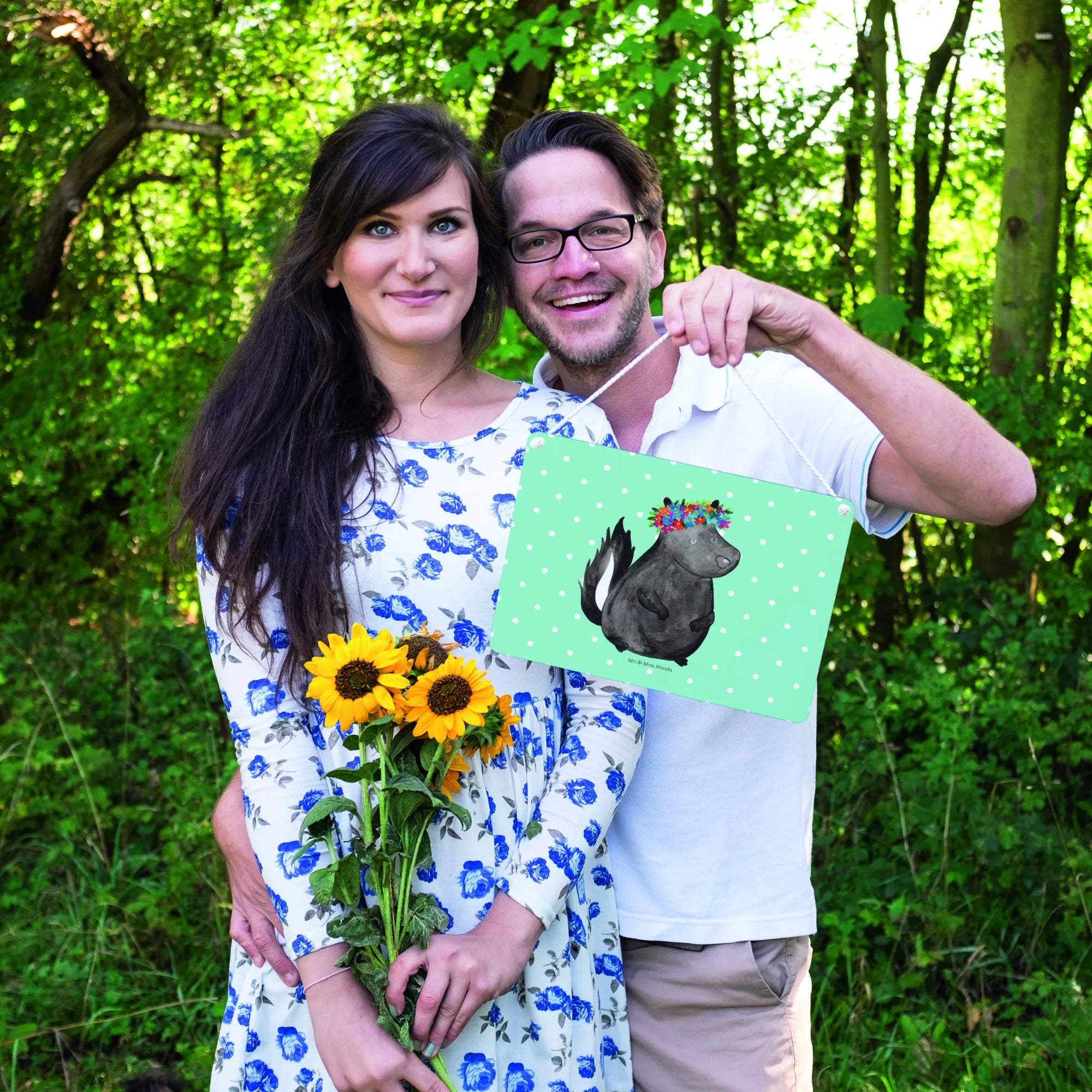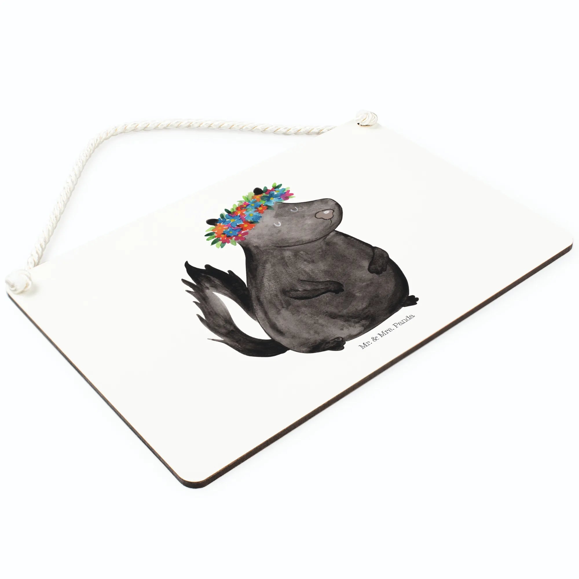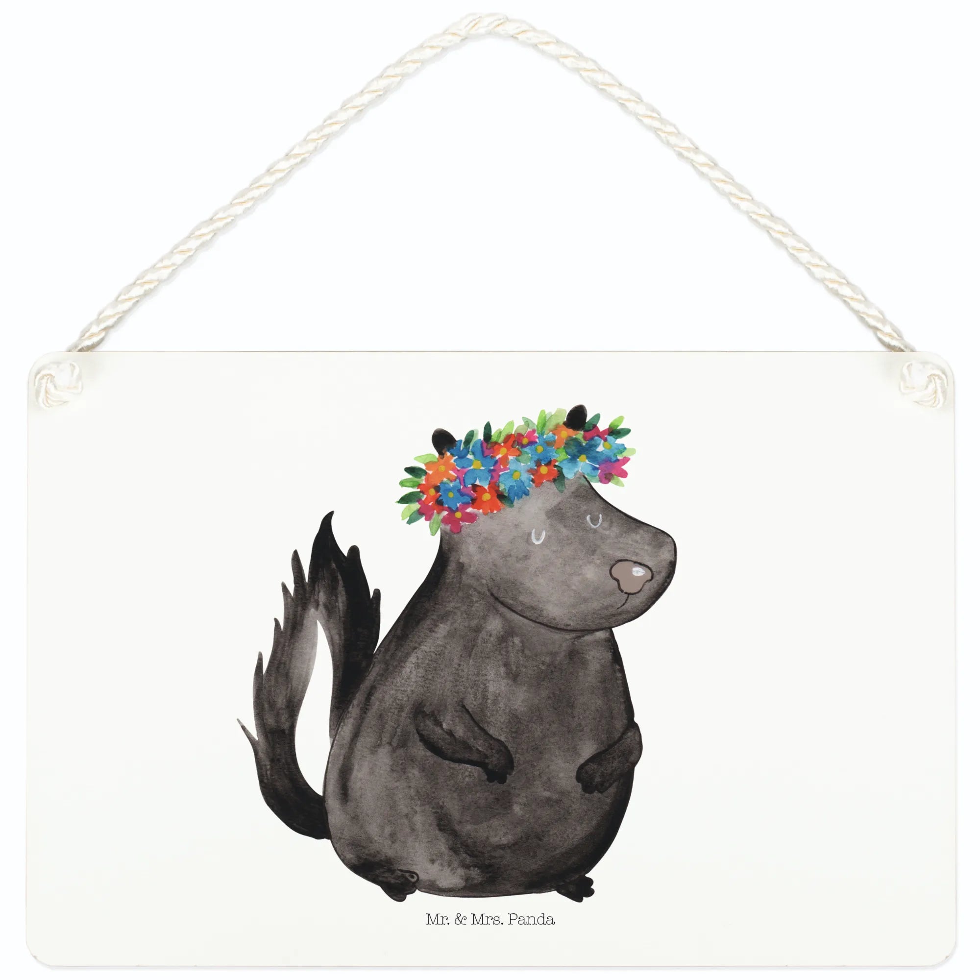 Das Deko Schild "Stinktier Blumenmädchen" von Mr. & Mrs. Panda ist der perfekte Begleiter für dein Zuhause. Mit einem charmanten Design, das ein süßes Stinktier mit einem bunten Blumenkranz zeigt, bringt es fröhliche Naturverbundenheit in jeden Raum.