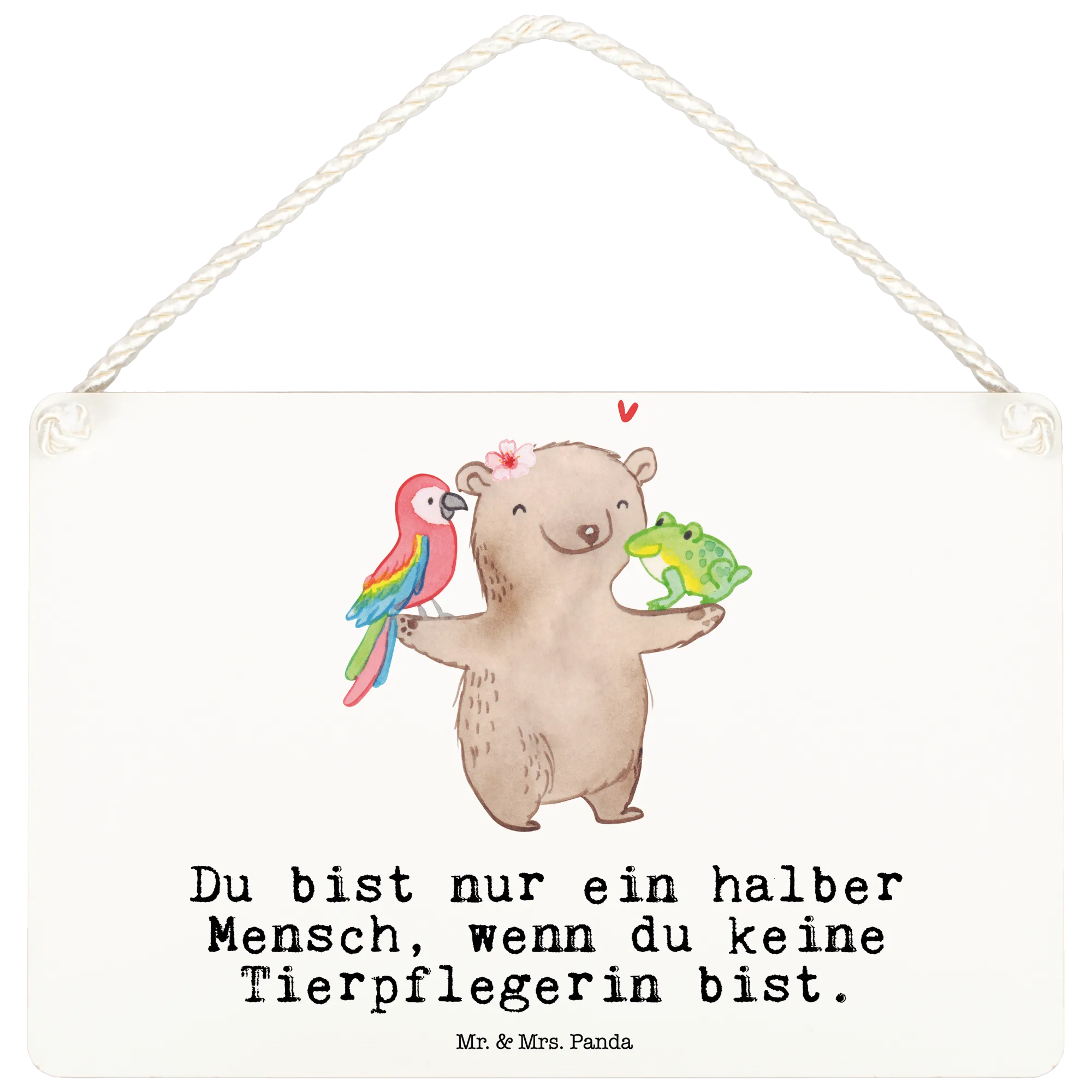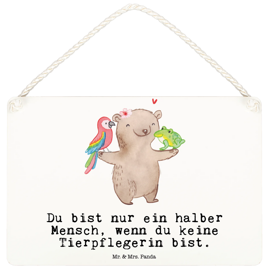 Mit dem charmanten Motiv eines süßen Bären, der sich rührend um einen Papagei und einen Frosch kümmert, wird dieses Schild jedem Tierpfleger ein Lächeln ins Gesicht zaubern. Der dazugehörige Spruch "Du bist nur ein halber Mensch, wenn du keine Tierpflegerin bist" ist eine liebevolle Hommage an alle, die ihr Herz für die Tiere öffnen.