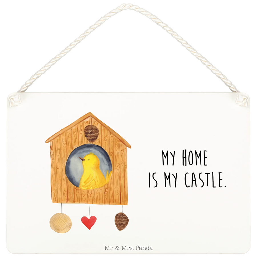 Mit einem bezaubernden Motiv eines gelben Vogels, der zufrieden in seinem Vogelhaus sitzt, verbreitet das Schild sofort gute Laune und ein Gefühl von Heimat. Es ist nicht nur ein dekorativer Blickfang, sondern auch ein liebevolles Zeichen für die eigene Familie und das Zuhause.