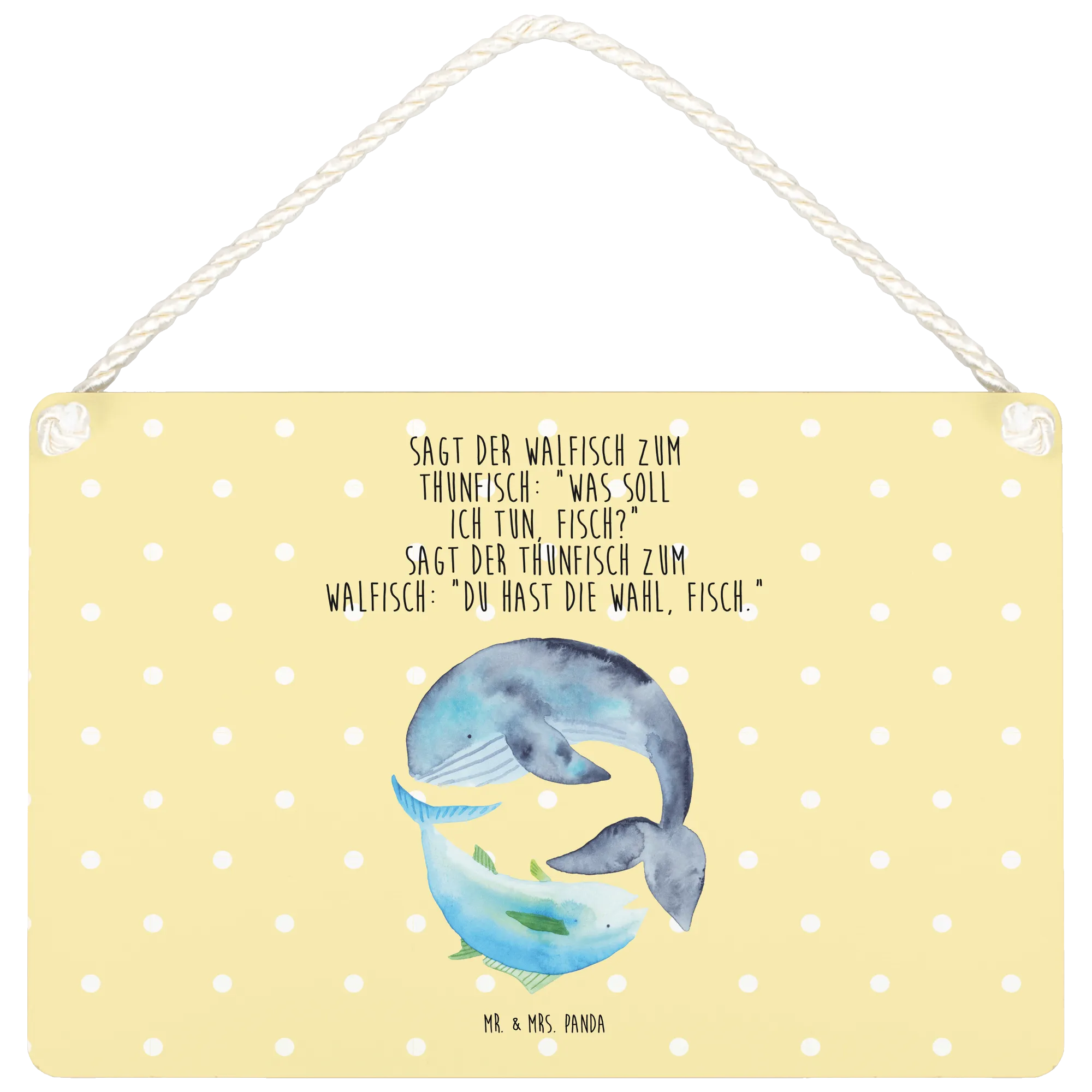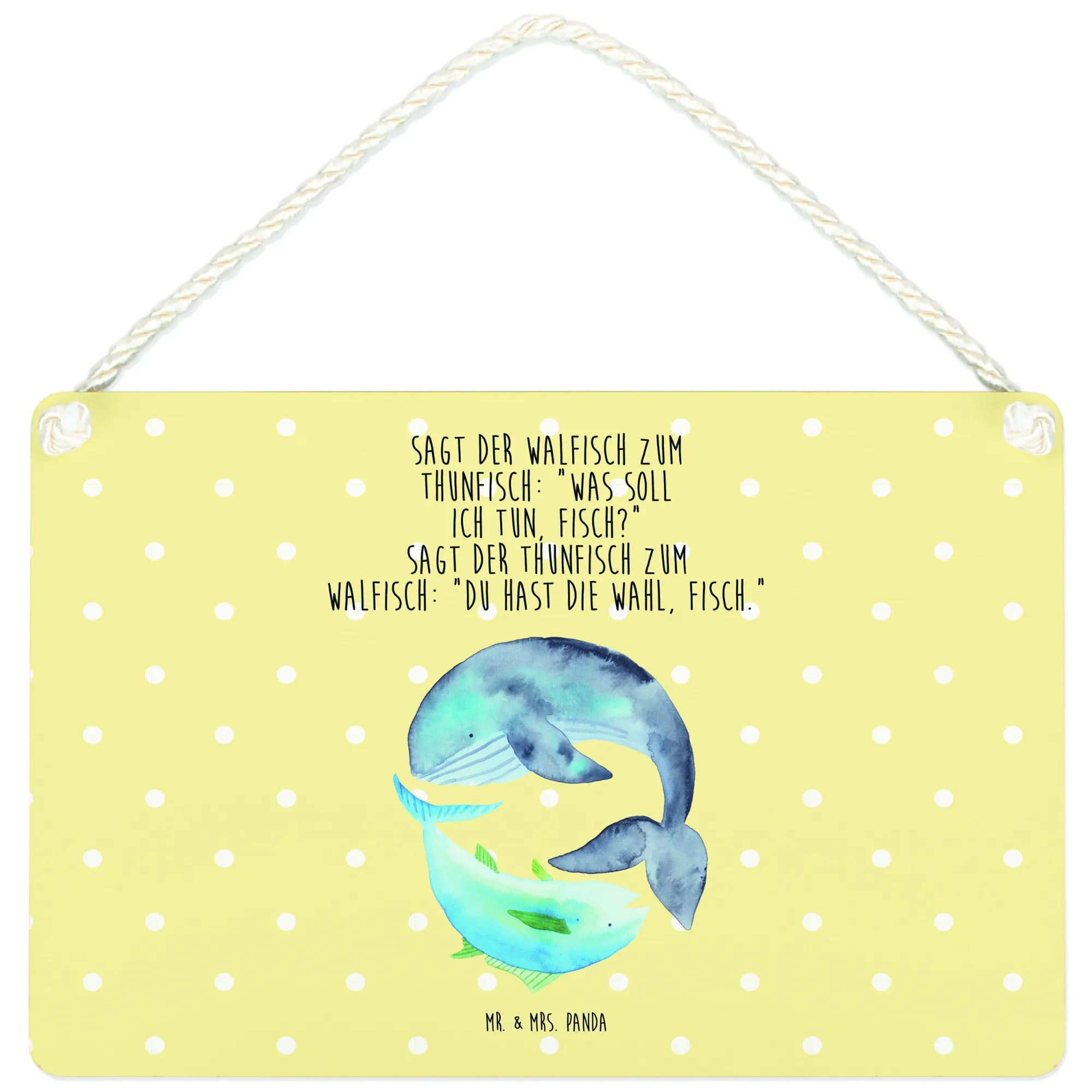 Entdecke das bezaubernde Deko Schild mit dem süßen Motiv von Walfisch und Thunfisch aus der Small World Kollektion von Mr. & Mrs. Panda! Dieses Deko Schild ist genau das richtige für alle, die ihren Wohnraum mit einer Portion Humor und maritimem Flair aufpeppen möchten. Mit dem charmanten Spruch, „Sagt der Walfisch zum Thunfisch: ‚Was soll ich tun, Fisch?‘ Sagt der Thunfisch zum Walfisch: ‚Du hast die Wahl, Fisch.‘“ bringt dieses Schild nicht nur gute Laune in dein Zuhause, sondern auch einen frischen Wind in die Deko.