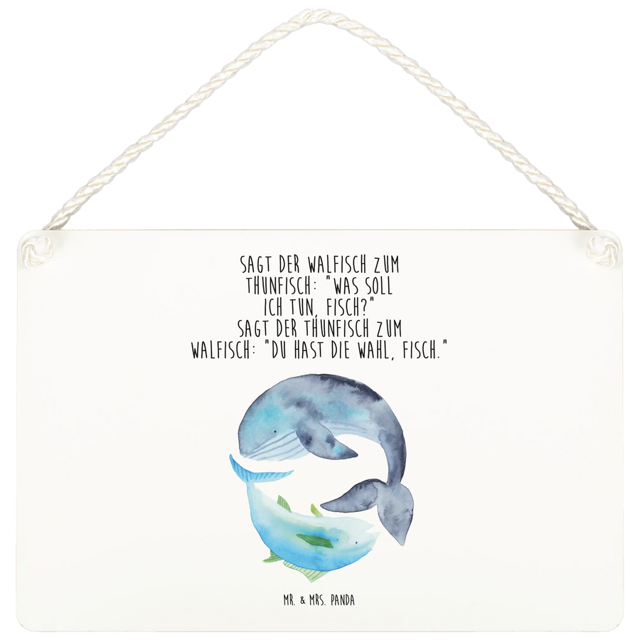 Das wunderschöne Dekoschild mit dem Motiv Walfisch & Thunfisch aus der Small World Kollektion von Mr. & Mrs. Panda ist das perfekte Geschenk für alle, die das maritime Flair lieben. Mit dem witzigen Spruch: "Sagt der Walfisch zum Thunfisch: ‚Was soll ich tun, Fisch?‘ Sagt der Thunfisch zum Walfisch: ‚Du hast die Wahl, Fisch.‘" bringt es nicht nur einen Lacher ins Zuhause, sondern auch eine besondere Art von Freude und Freude.