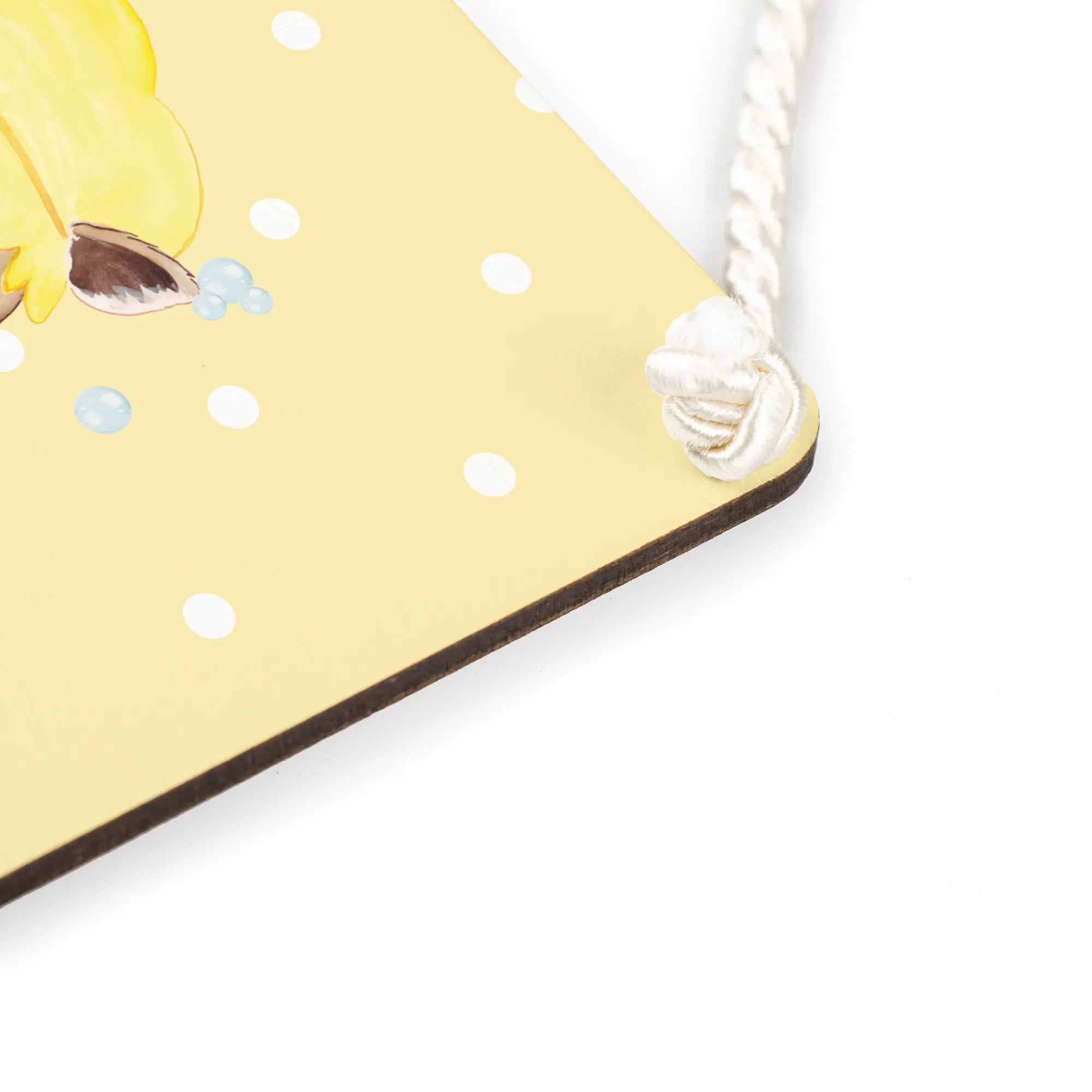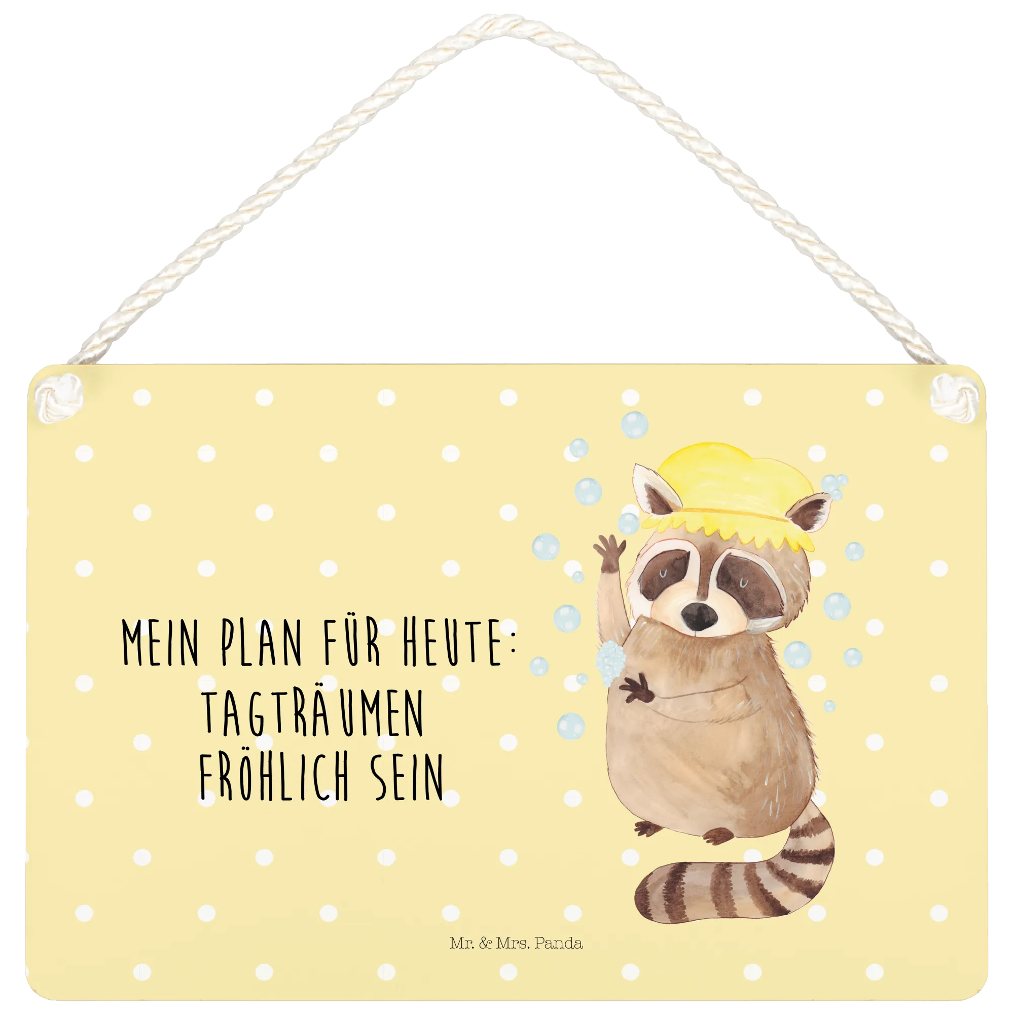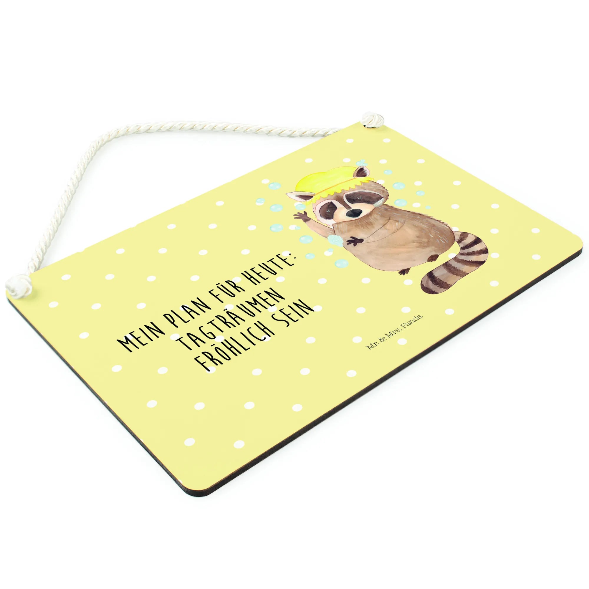 Ein wunderschönes und edles Deko Schild von Mr. & Mrs. Panda, das nicht nur als Blickfang dient, sondern auch jede Wand oder Tür in ein fröhliches Zuhause verwandelt. Mit einem süßen Waschbär-Motiv, der vergnüglich unter der Dusche badet, strahlt das Schild pure Lebensfreude aus. Die liebevoll handgezeichneten Illustrationen in Kombination mit dem Spruch "Mein Plan für heute: Tagträumen und fröhlich sein" schaffen eine wunderbare Atmosphäre, in der jeder Tag ein kleines Stückchen schöner wird.