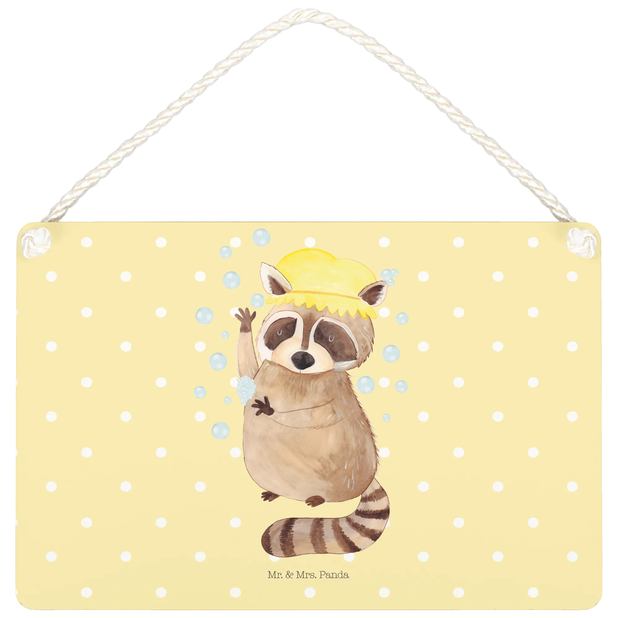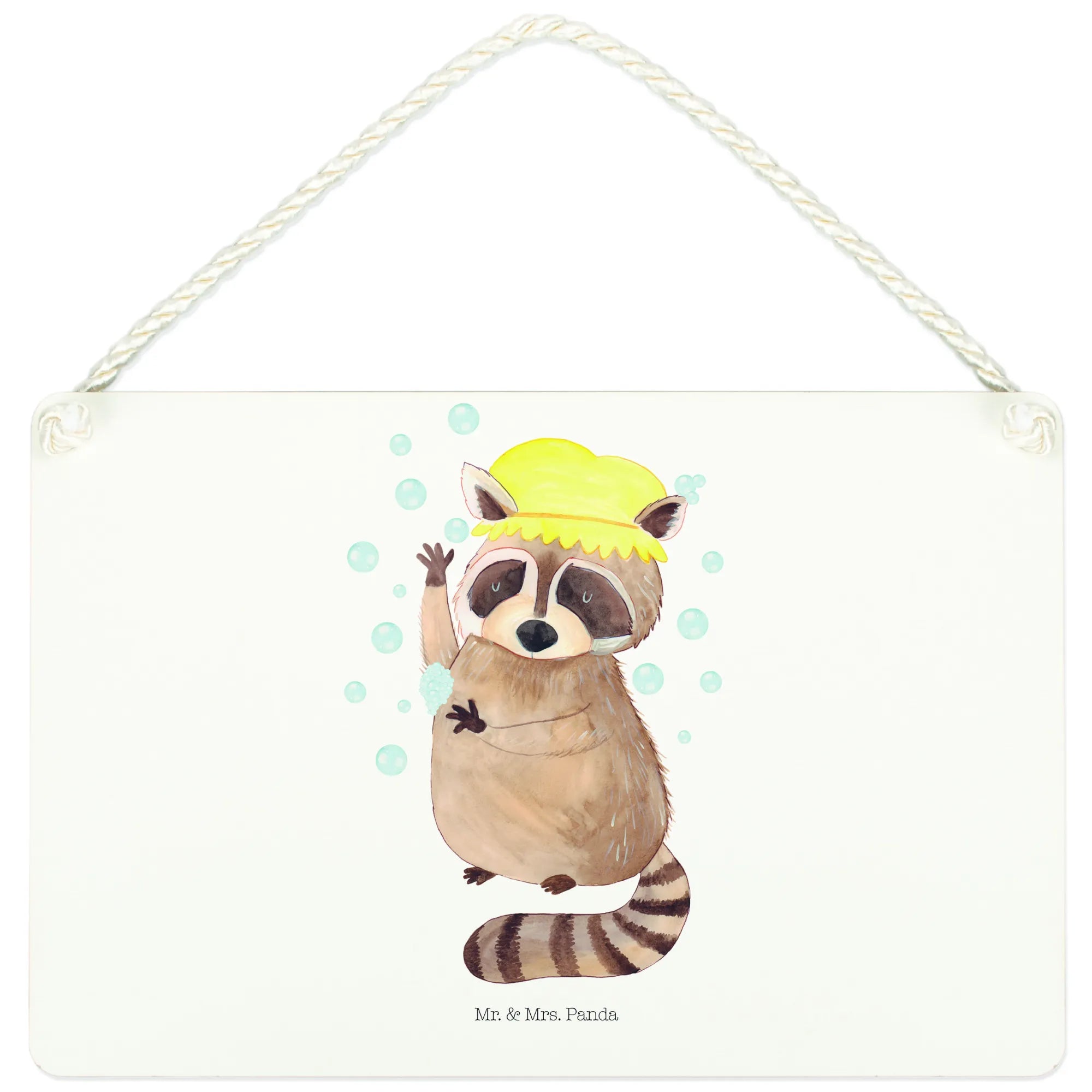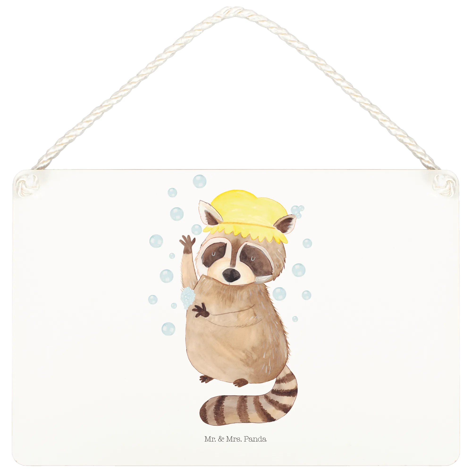 Dieses liebevoll gestaltete Schild bringt nicht nur Farbe in Dein Zuhause, sondern sorgt auch für gute Laune. Mit einem putzigen Waschbären, der genüsslich unter einer Dusche steht und seine Seifenblasen genießt, wird dieses Schild zum perfekten Blickfang in jedem Badezimmer oder an der Wand Deines Wohnbereichs.