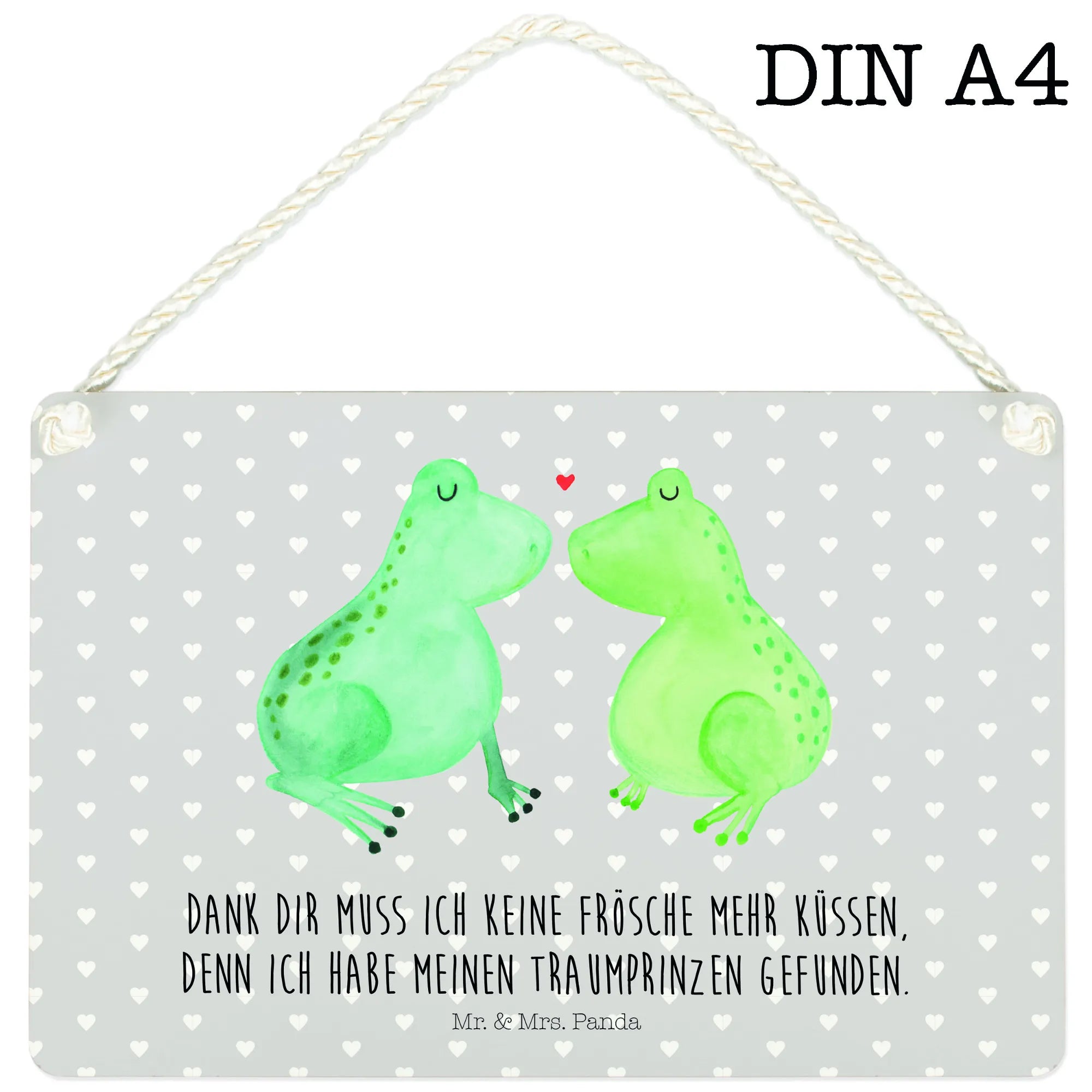 Das Deko Schild "Frosch Liebe" von Mr. & Mrs. Panda ist das perfekte Geschenk für alle Verliebten! Ob für den Freund, die Freundin, den Ehemann oder die Ehefrau – dieses Schild bringt das Herz zum Schmelzen. Mit dem süßen Slogan "Dank dir muss ich keine Frösche mehr Küssen, denn ich habe meinen Traumprinzen gefunden", wird jeder Liebesbeweis zu etwas ganz Besonderem.