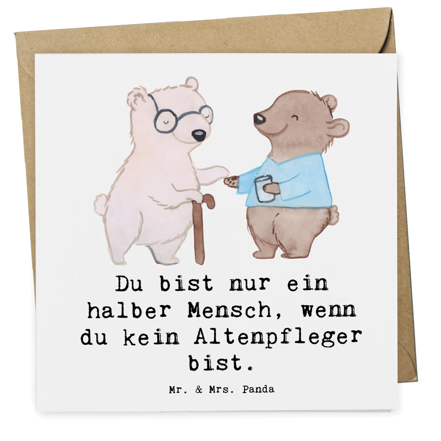 Ob zum Geburtstag, zur Hochzeit, als besondere Einladungskarte oder einfach nur, um "Danke" zu sagen, diese hochwertige Klappkarte passt zu vielen Anlässen. Das liebevolle Motiv zeigt einen niedlichen Bären, der einem anderen, älteren Bären mit einem Krückstock seine Hand reicht. Über dem Bild steht der humorvolle Spruch: "Du bist nur ein halber Mensch, wenn du kein Altenpfleger bist." Dies ist nicht nur ein schöner Spruch, sondern auch eine herzliche Hommage an all die Altenpfleger, die Tag für Tag ihr Bestes geben.