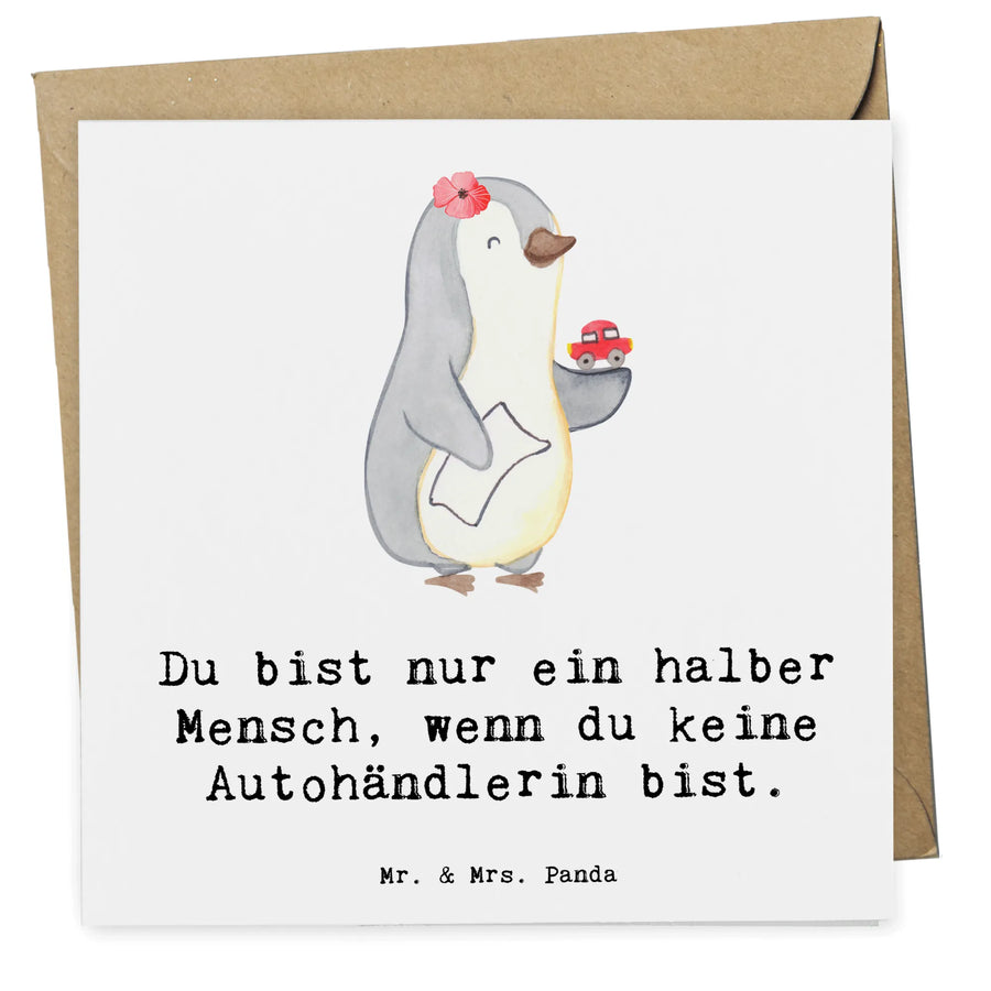 Das süße Design zeigt einen Pinguin, der mit Unterlagen in einer Hand und einem kleinen Spielzeugauto in der anderen Hand stolz seine Rolle als Autohändler verkörpert. Diese einzigartige Karte kommt mit dem humorvollen Spruch: "Du bist nur ein halber Mensch, wenn du keine Autohändlerin bist." Damit eignet sie sich perfekt für verschiedene Anlässe, sei es zur Eröffnung eines Autohauses, zum Jubiläum, zur Verabschiedung oder einfach nur als liebevolle Anerkennung.