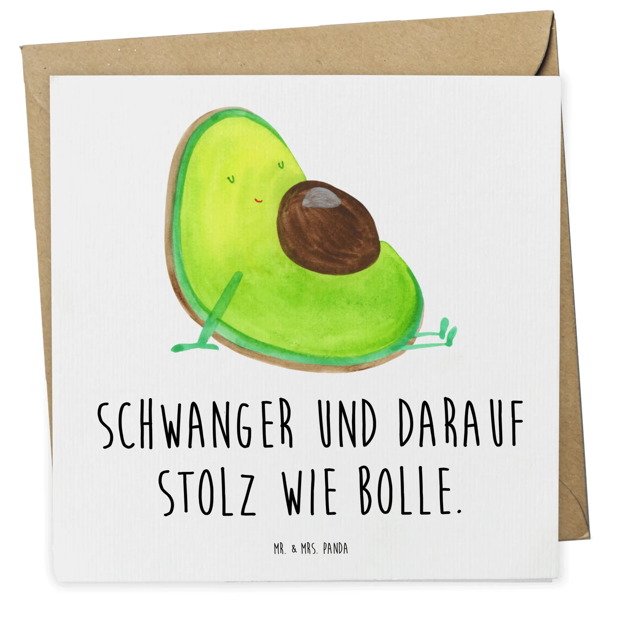 Die Deluxe Karte "Avocado schwanger" aus der Avocado Kollektion von Mr. & Mrs. Panda ist der perfekte Begleiter für alle werdenden Eltern und ihre Liebsten. Diese wunderschöne quadratische Karte misst 140 mm x 140 mm und wurde aus hochwertigem 300 Gramm Karton gefertigt, der sowohl hochwertig als auch umweltfreundlich ist. Die Vorderseite zeigt eine süße Avocado, die stolz auf ihrem kleinen Babybauch sitzt und glücklich auf ihren dicken Kern blickt. Mit dem Spruch "Schwanger und darauf stolz wie Bolle" bringt sie ein Lächeln auf die Gesichter aller, die die freudige Nachricht erhalten.