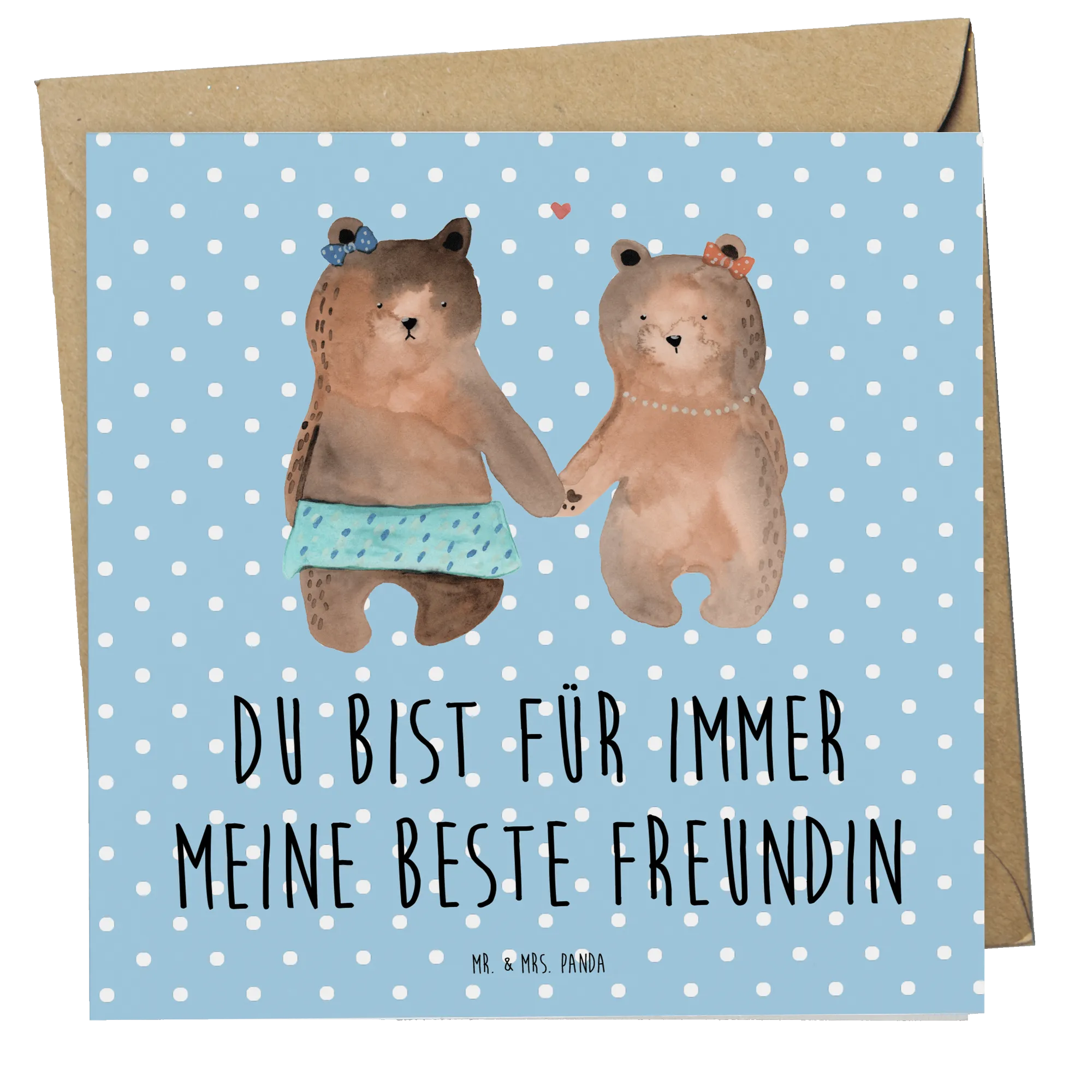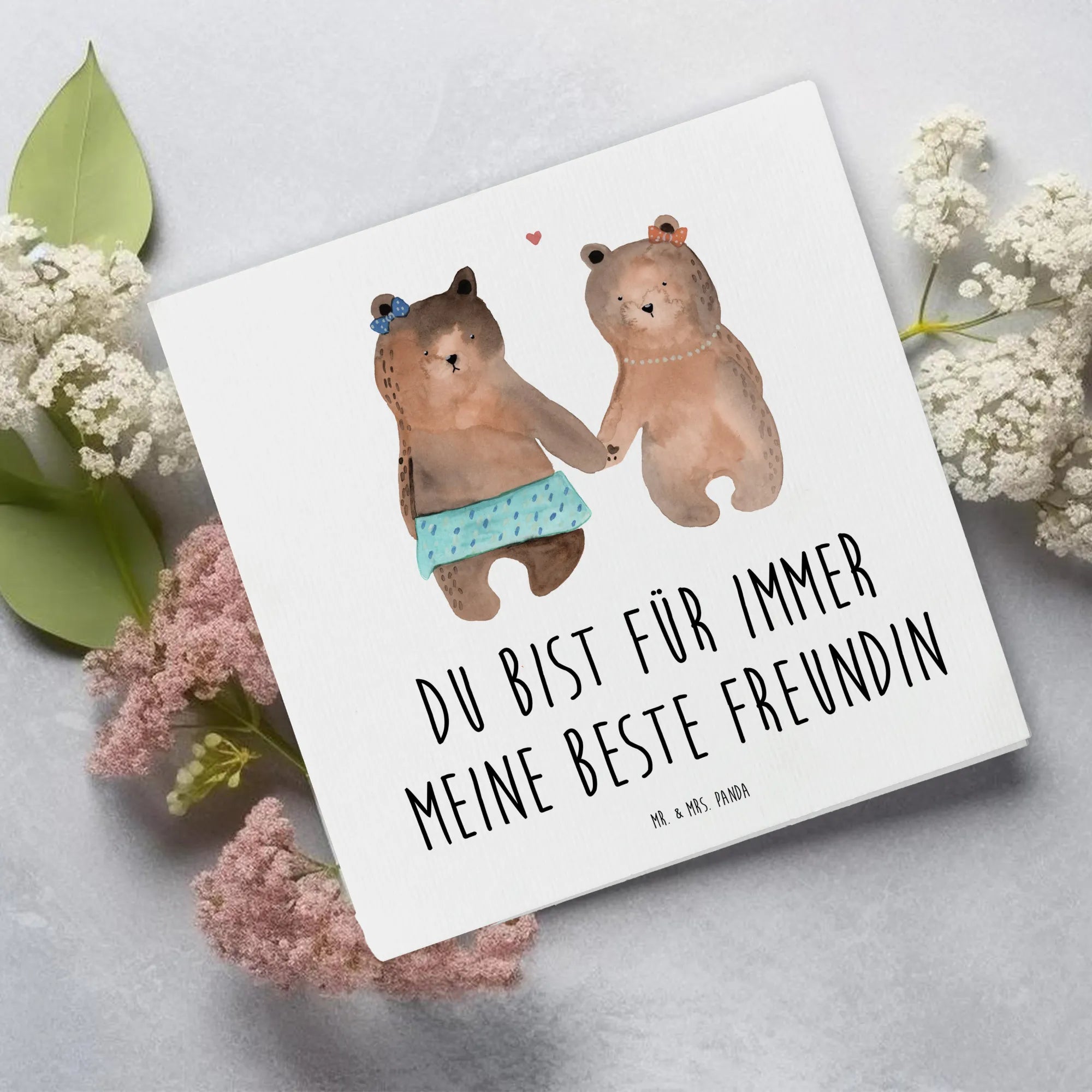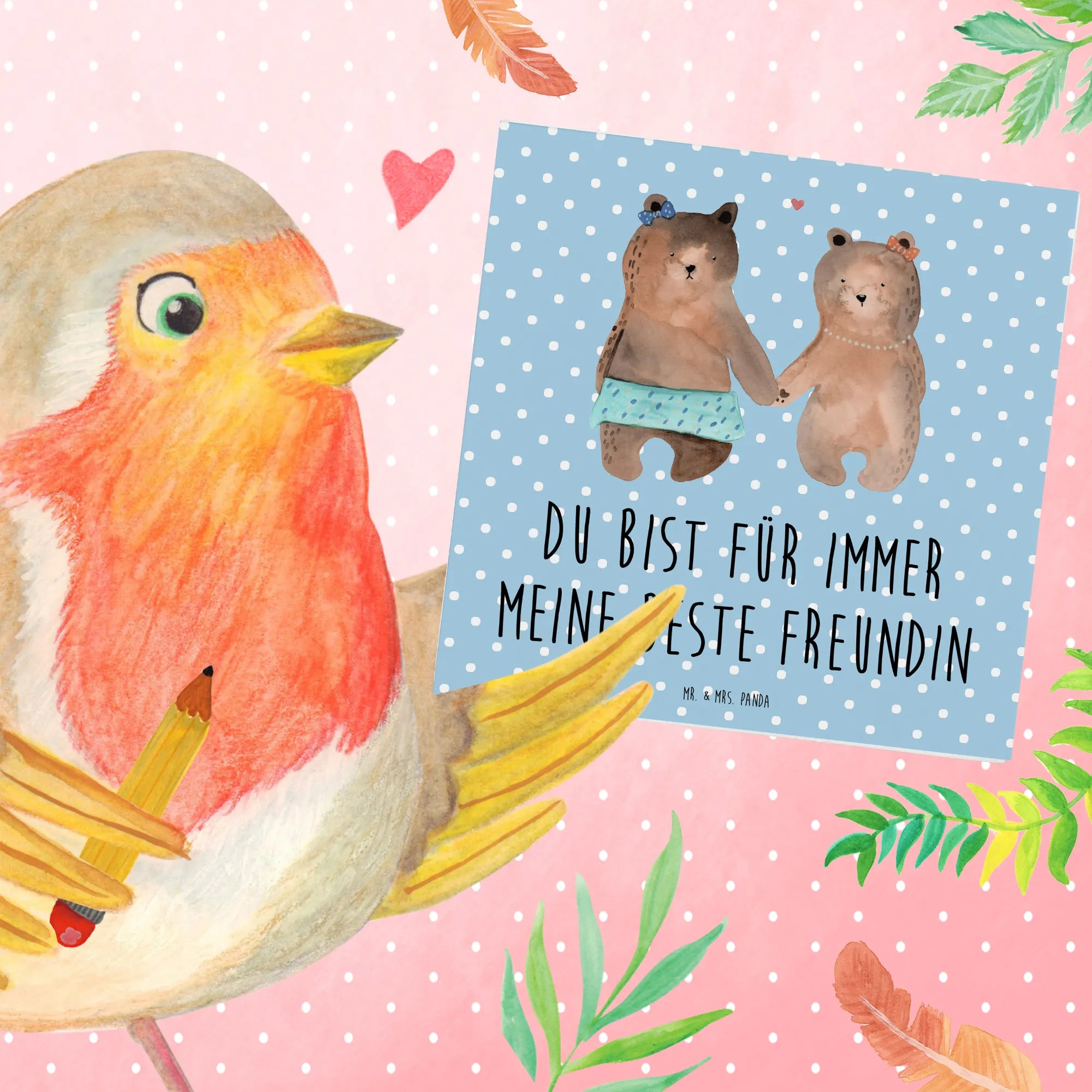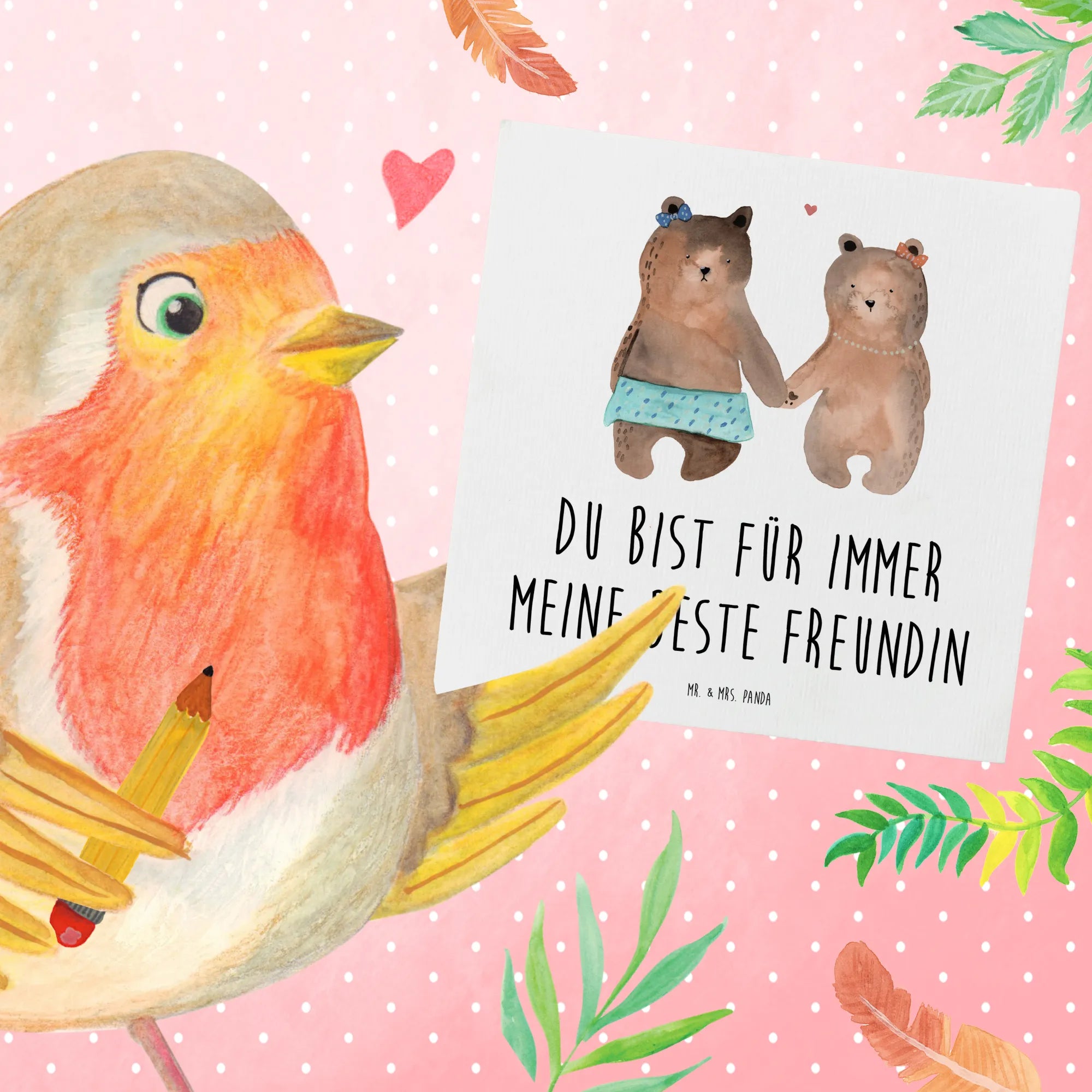 Entdecke die Deluxe Karte "Bär Freundin" von Mr. & Mrs. Panda – das perfekte Geschenk für die beste Freundin! Diese wunderschöne und qualitativ hochwertige quadratische Karte ist der ideale Weg, um Deine Wertschätzung für Deine beste Freundin auszudrücken. Die Vorderseite der Karte zeigt zwei süße Bärenmädchen, die sich an den Händen halten, und erinnert an die unerschütterliche Freundschaft, die Ihr miteinander teilt. Unter dem liebevollen Motiv steht der herzliche Spruch "Du bist für immer meine beste Freundin", der sicher ein Lächeln auf Ihr Gesicht zaubern wird.